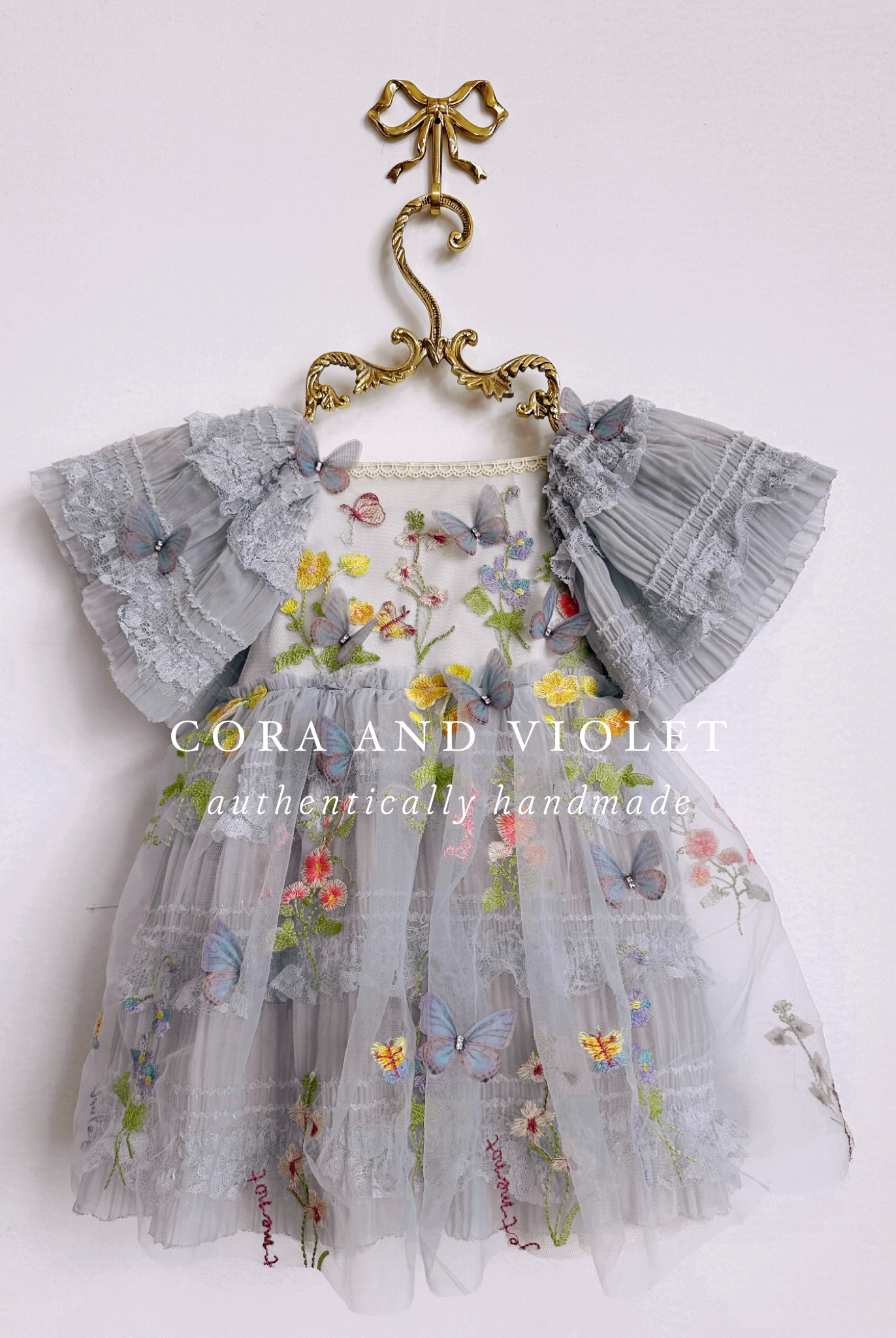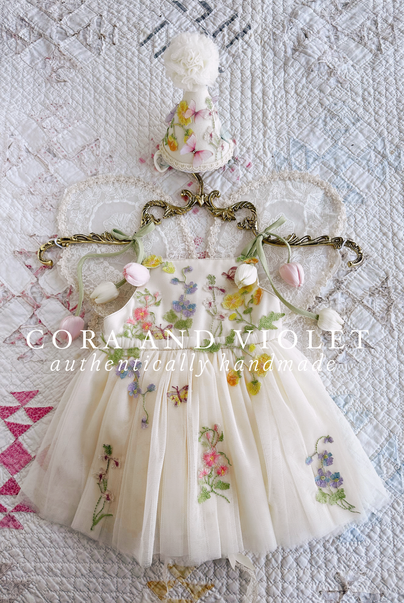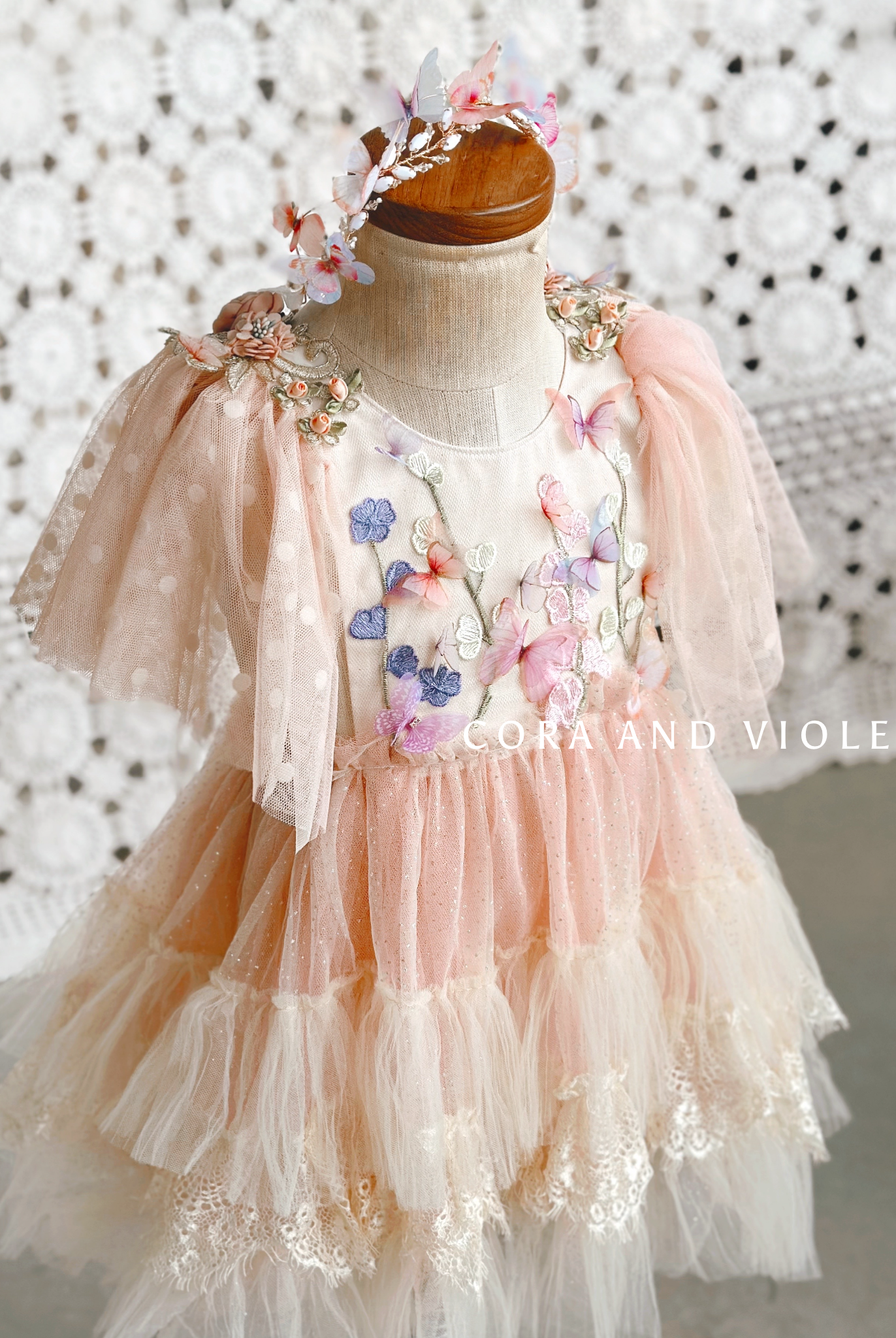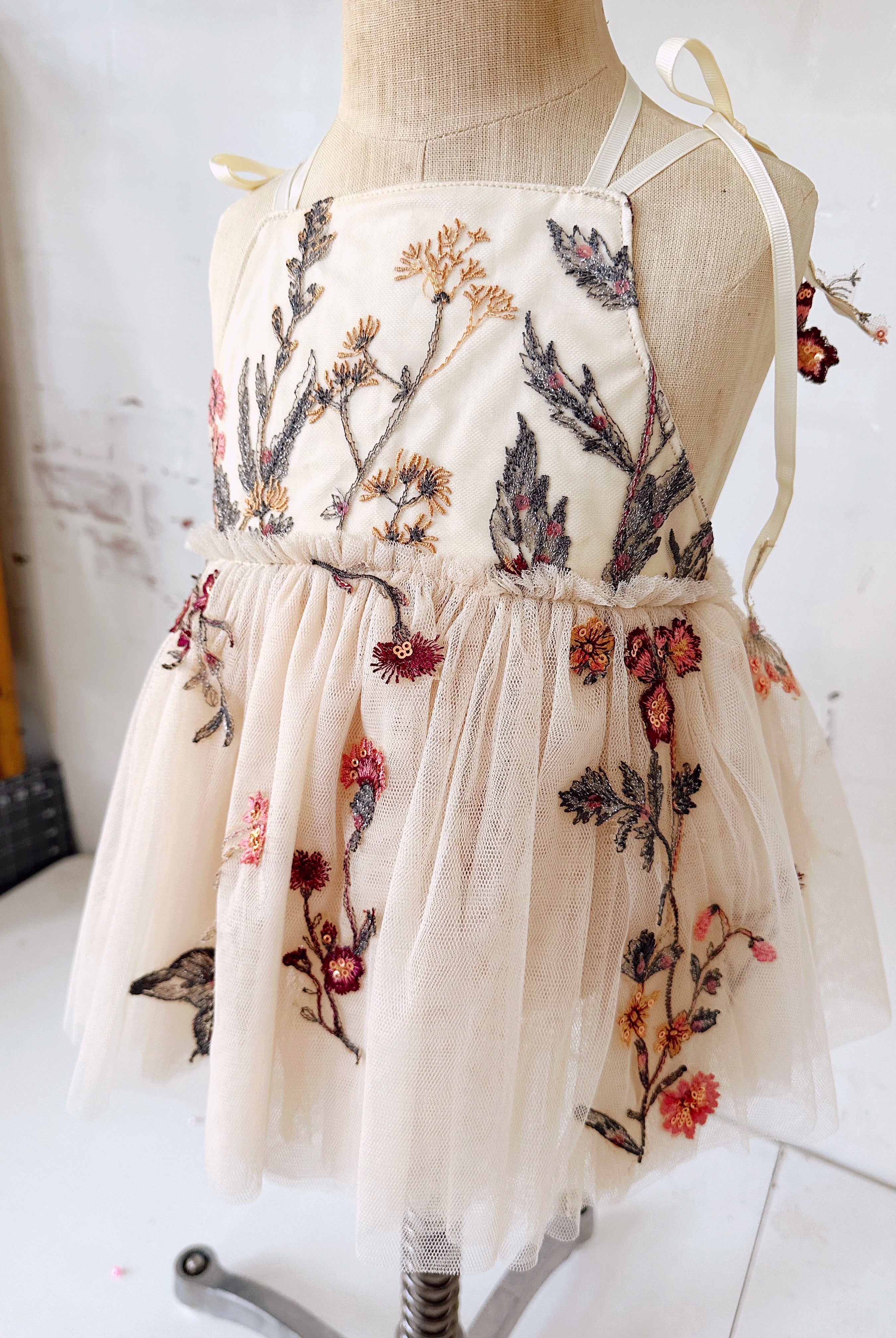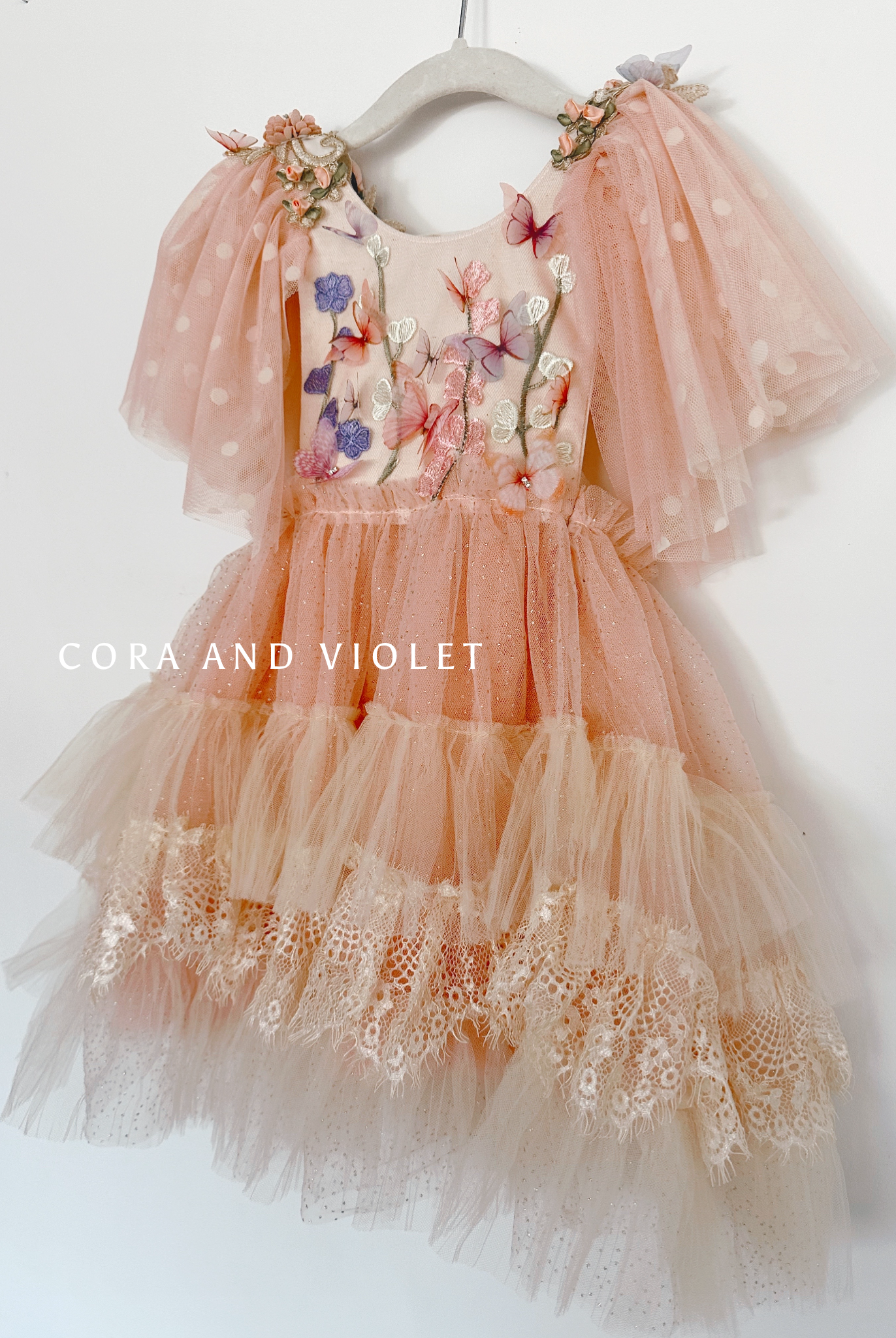 Embroidered mushrooms, sequins & 3D lace butterflies. The perfect dress for your fairies magical garden birthday!