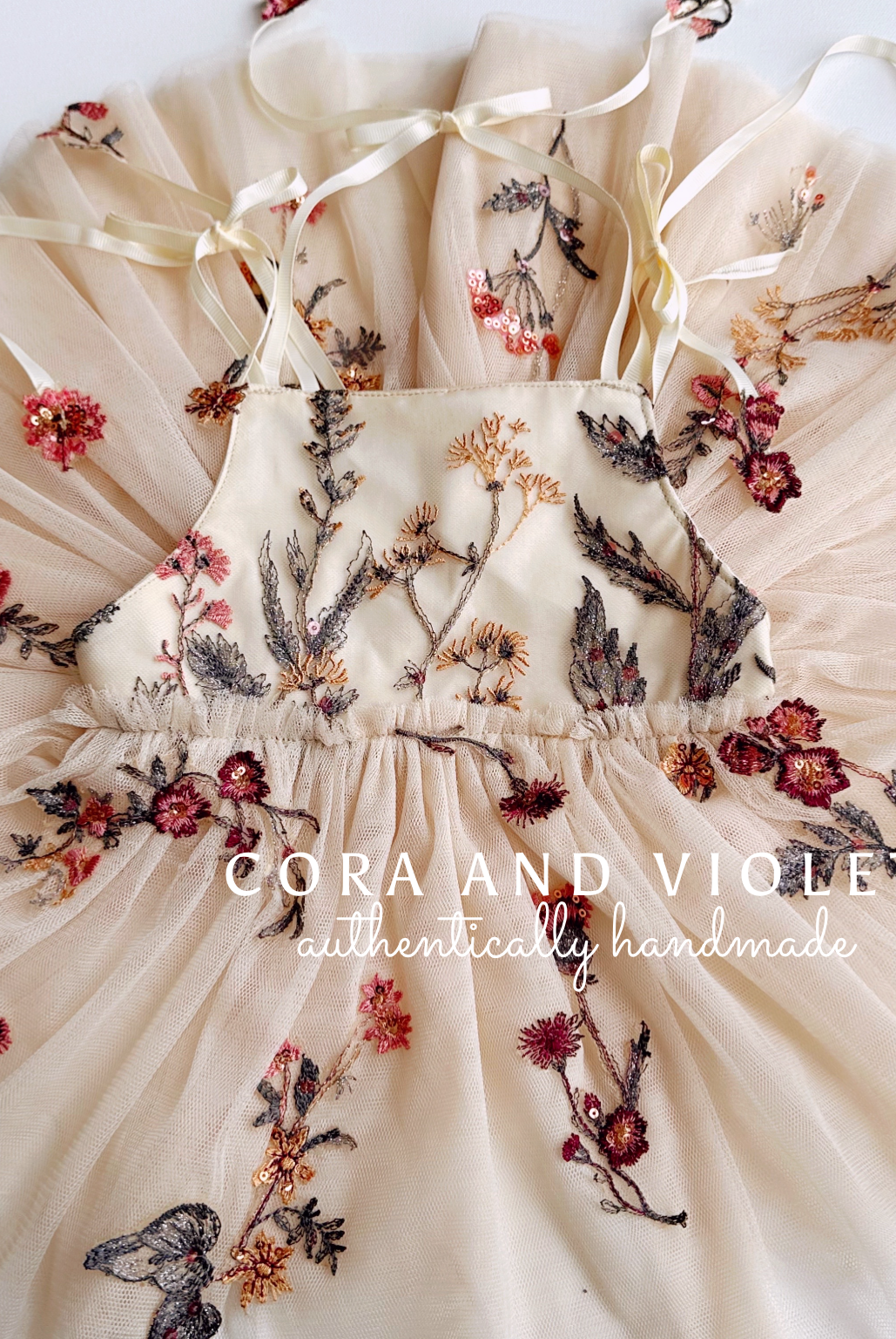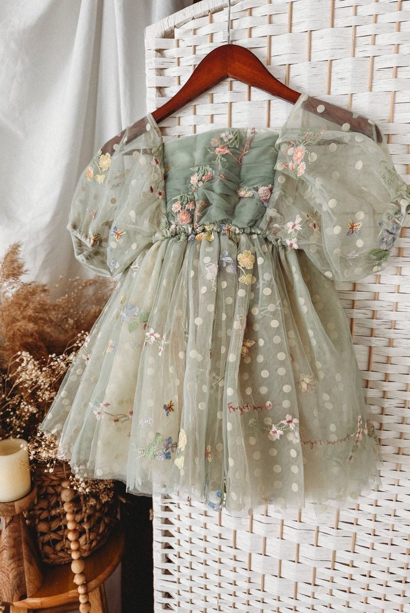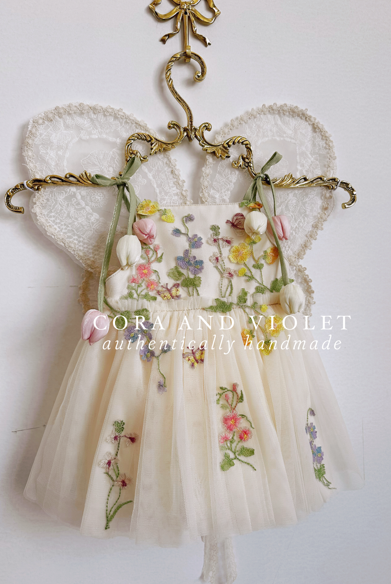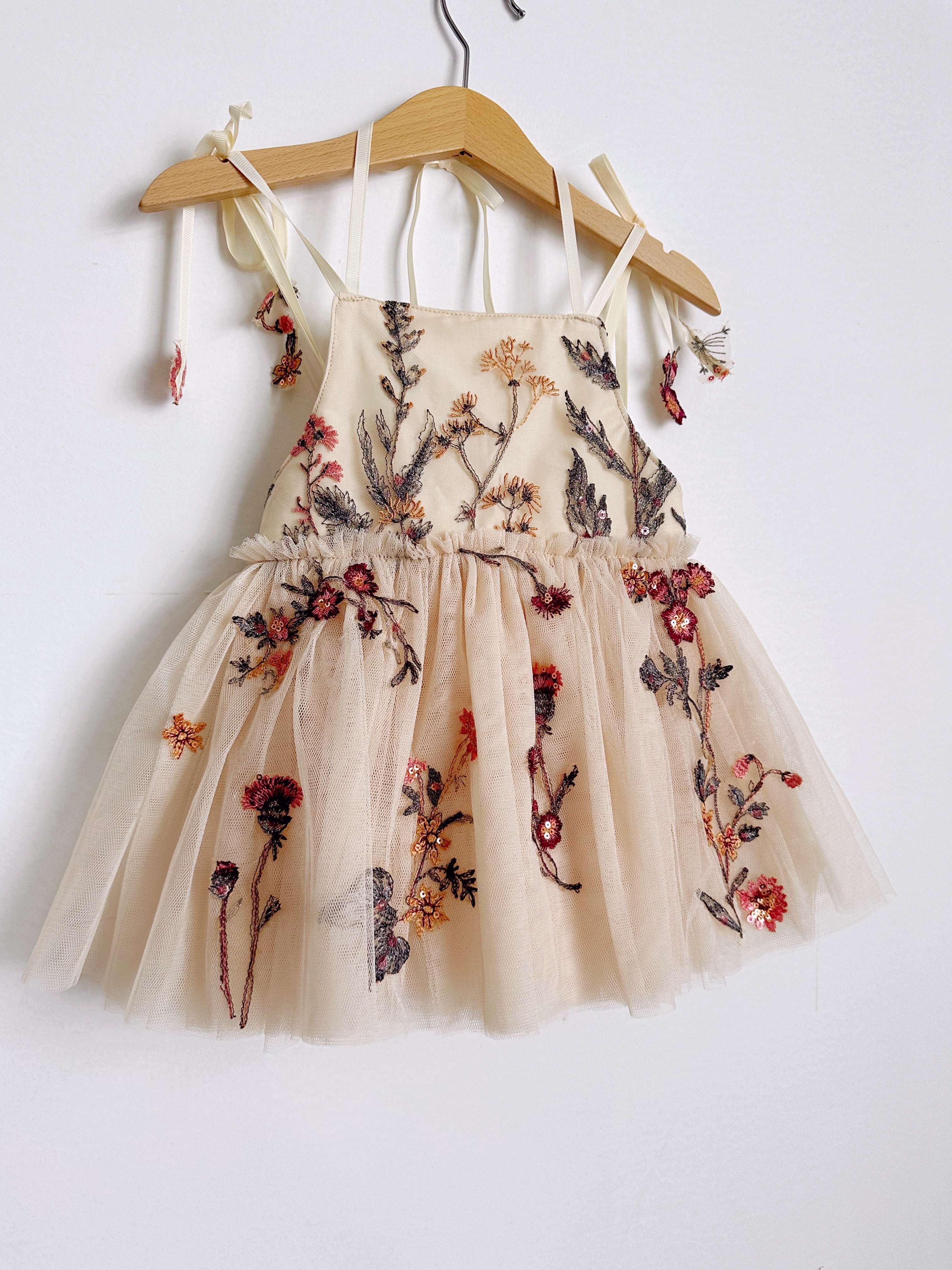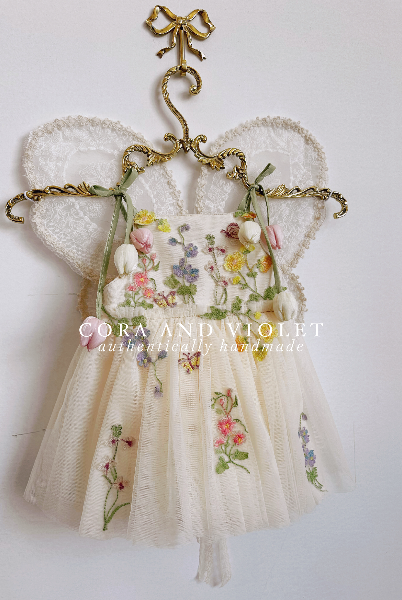 Embroidered mushrooms, sequins & 3D lace butterflies. The perfect dress for your fairies magical garden birthday!