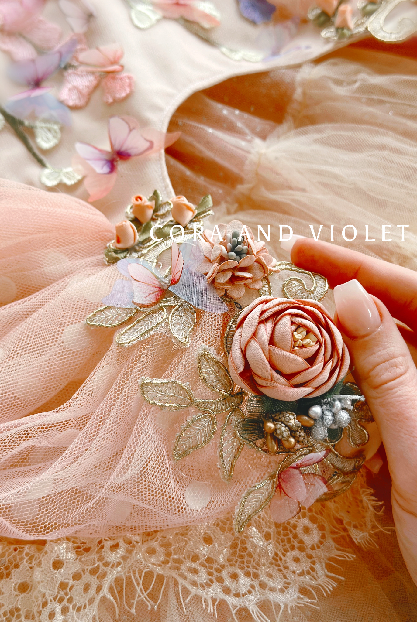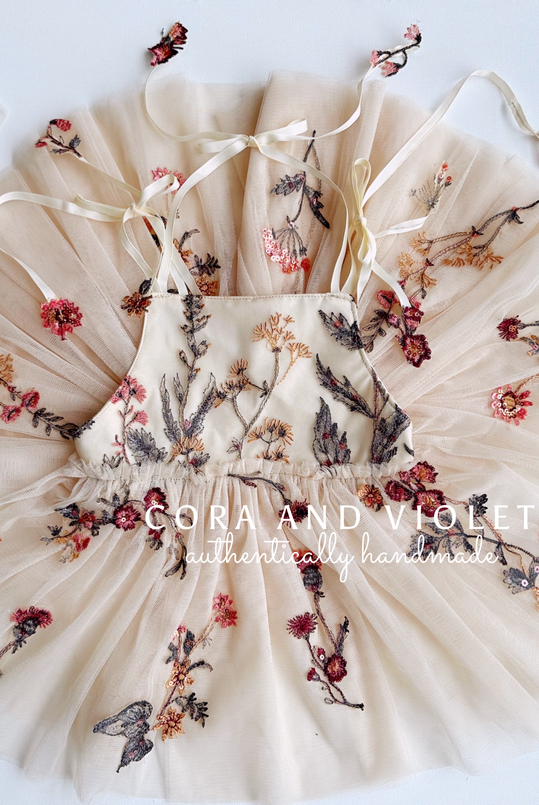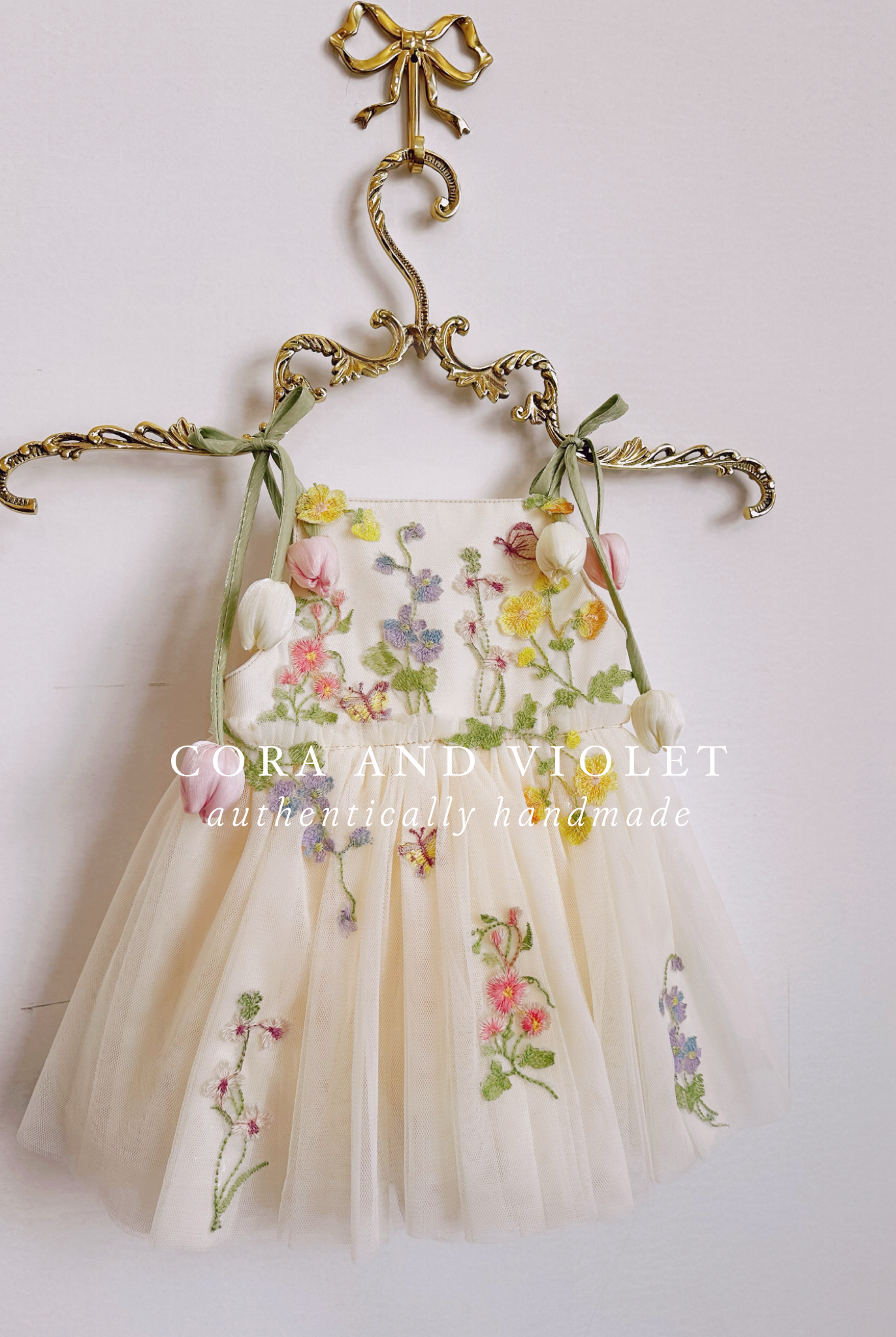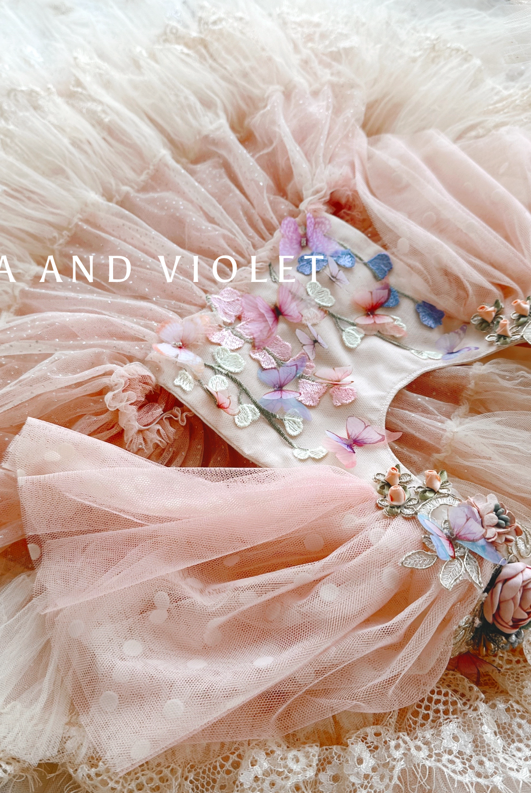 Embroidered mushrooms, sequins & 3D lace butterflies. The perfect dress for your fairies magical garden birthday!