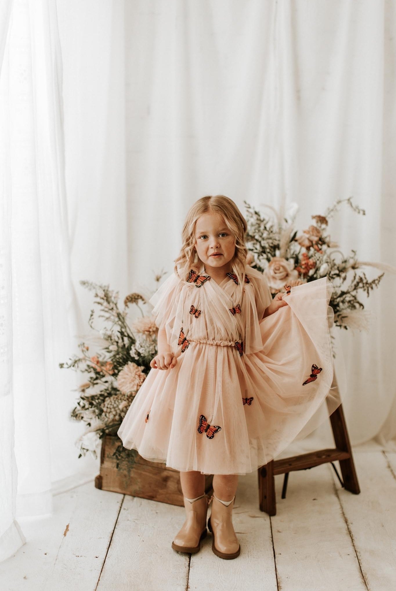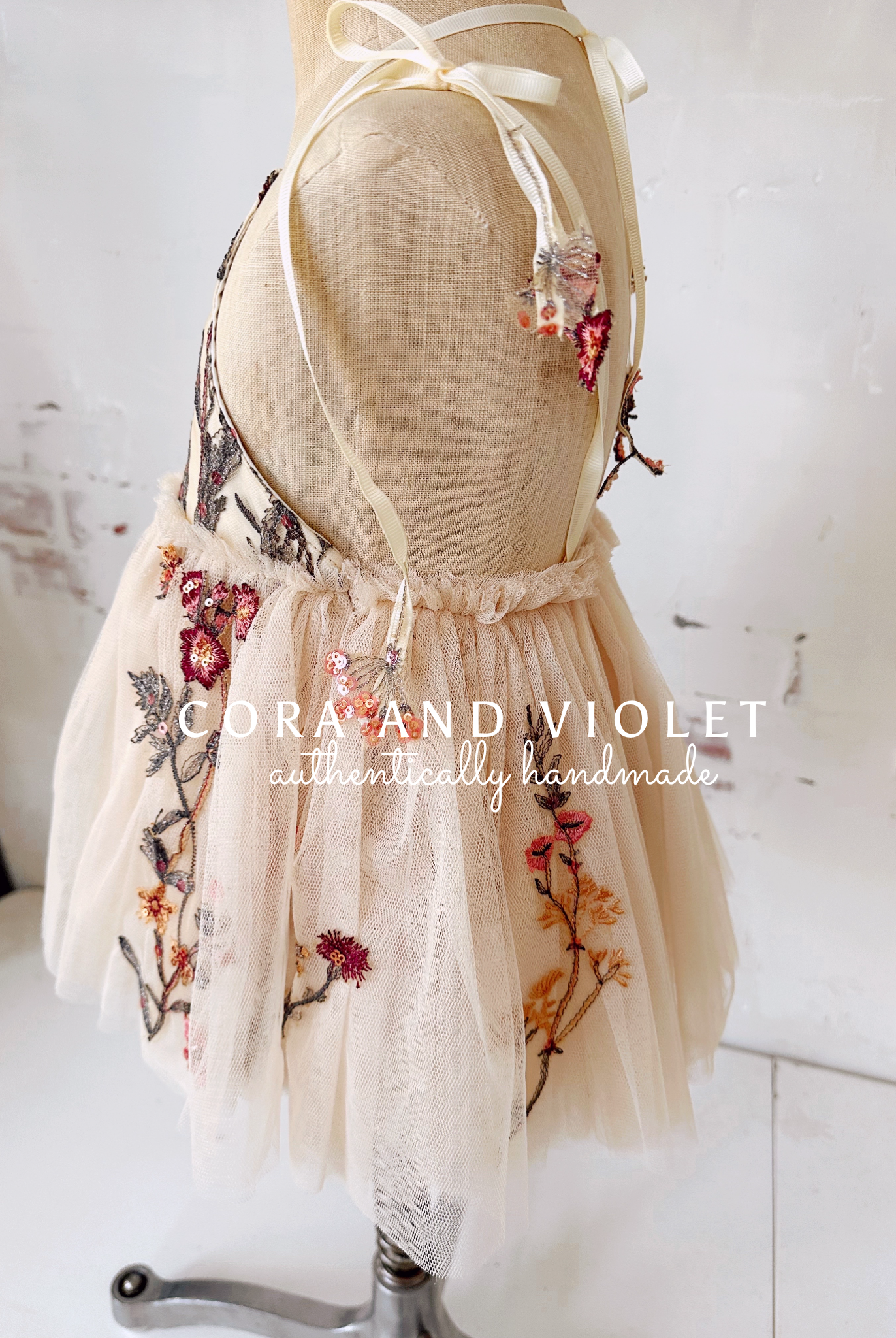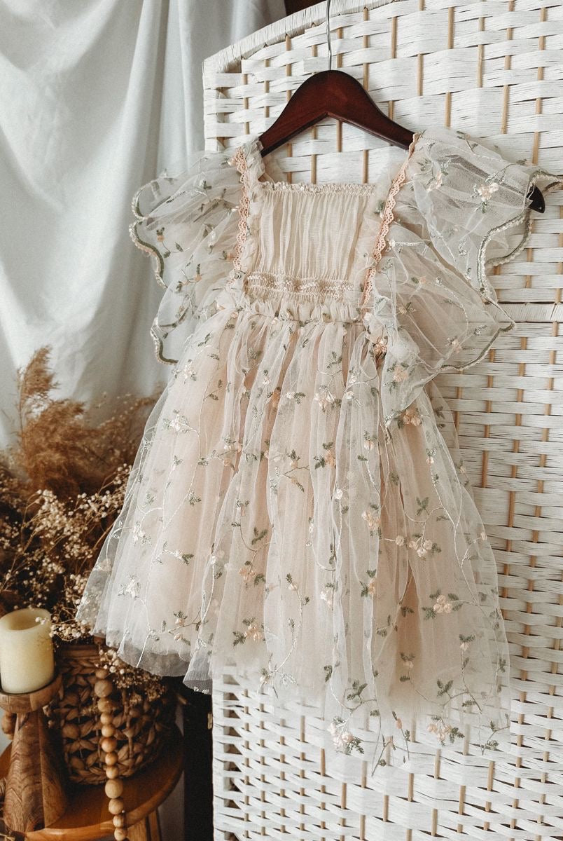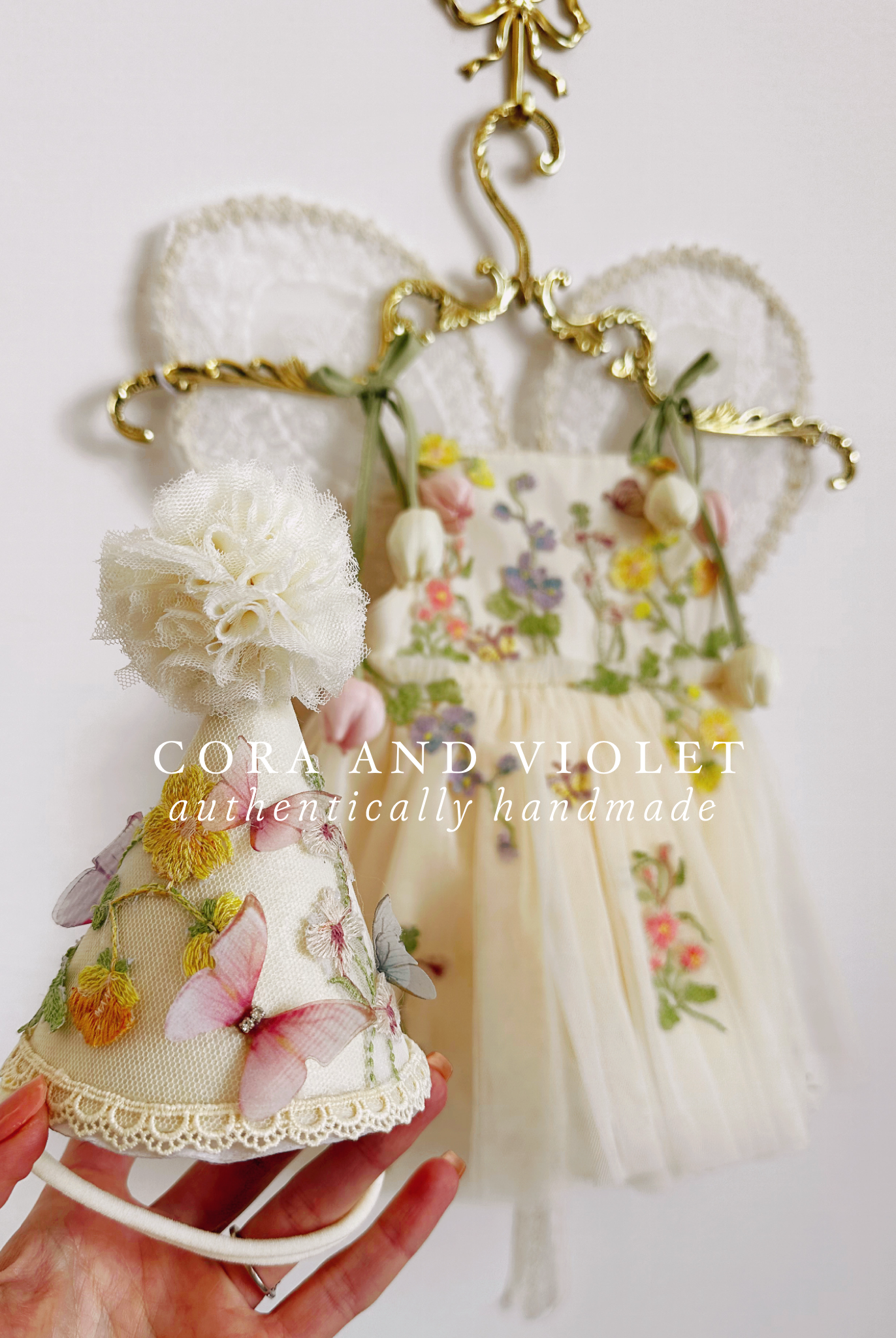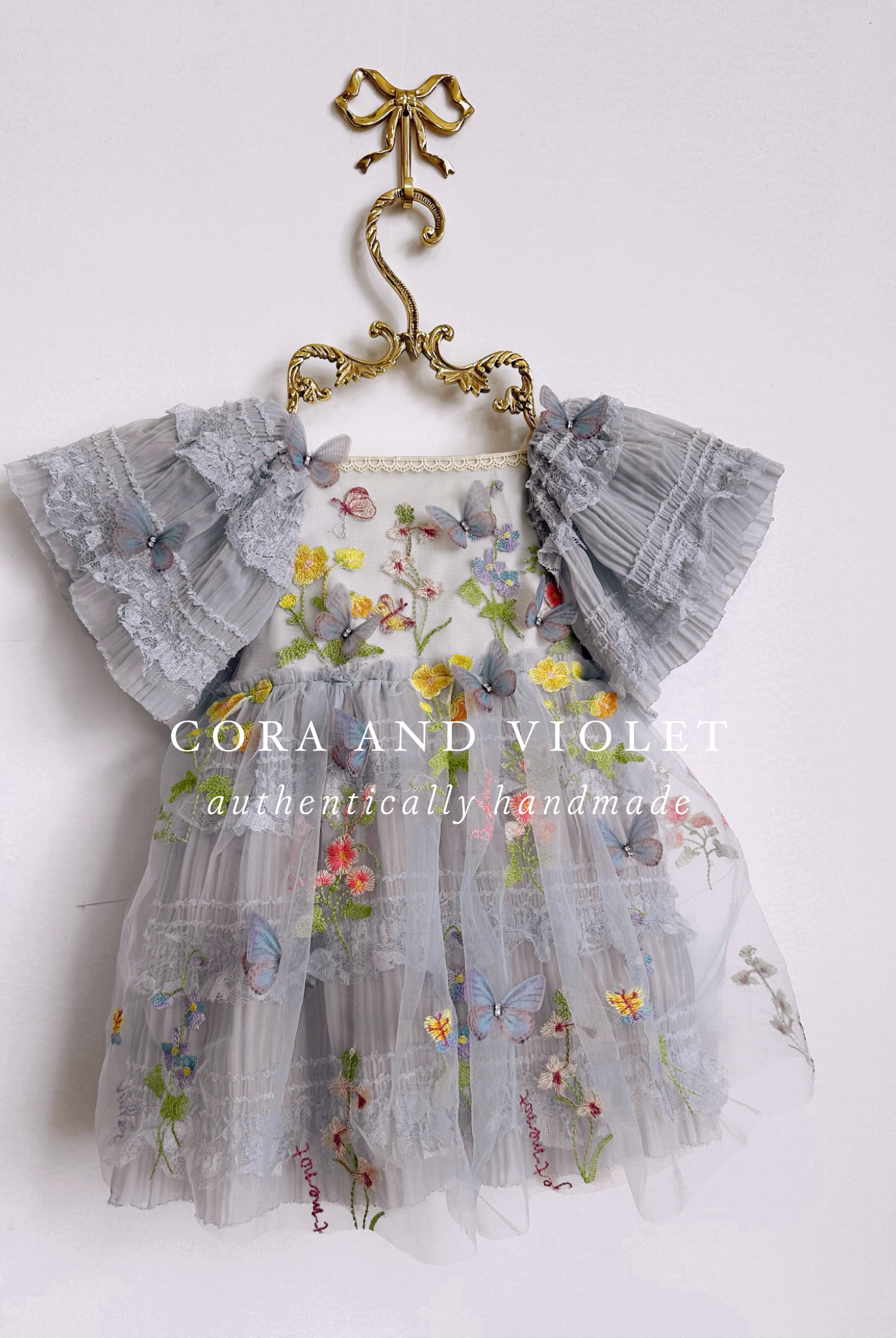 Embroidered mushrooms, sequins & 3D lace butterflies. The perfect dress for your fairies magical garden birthday!