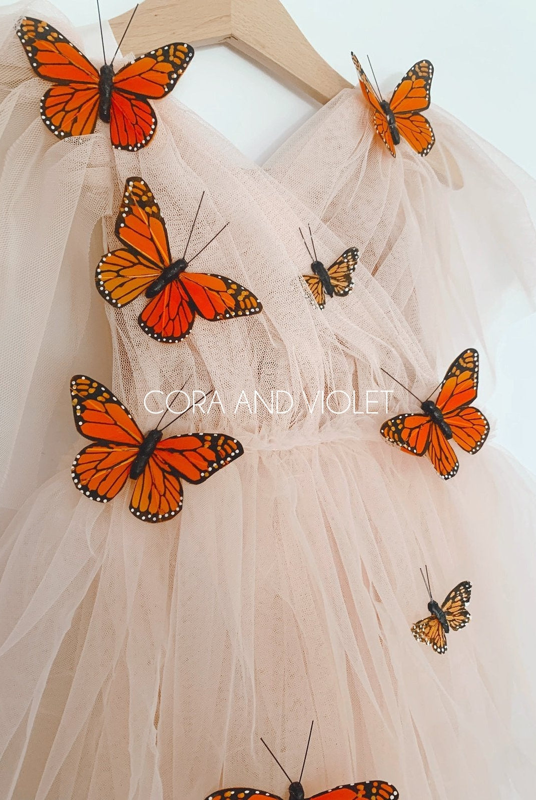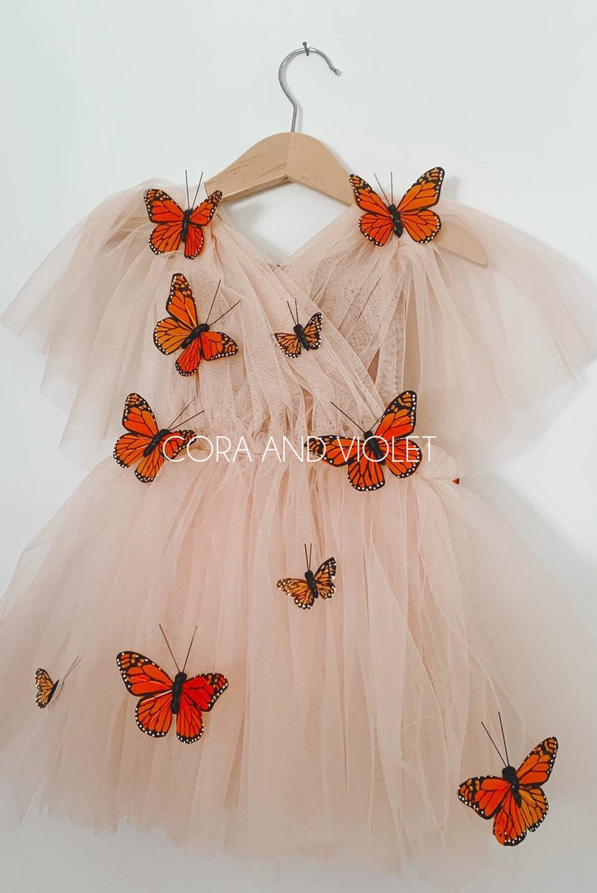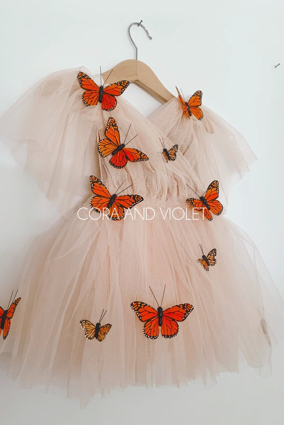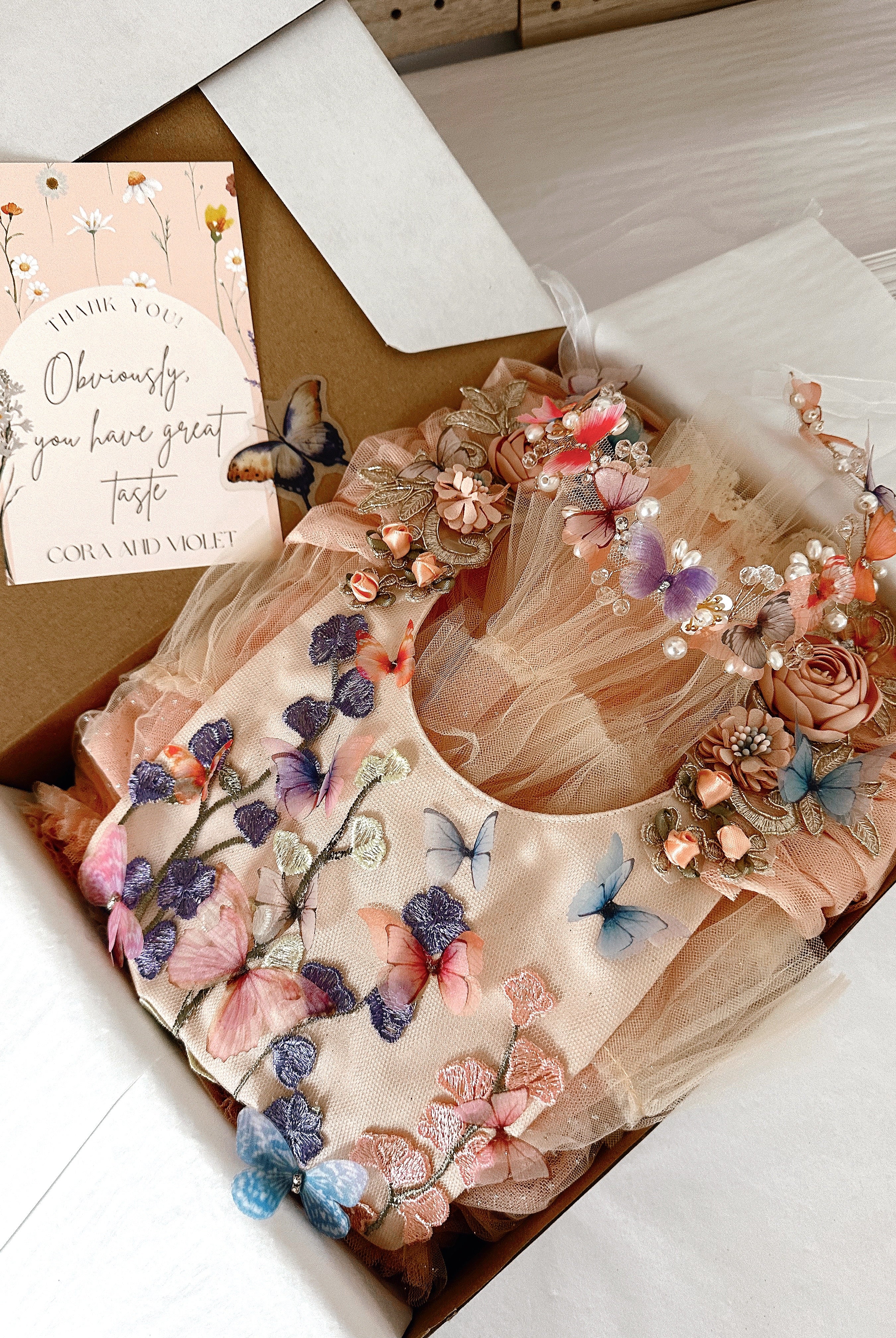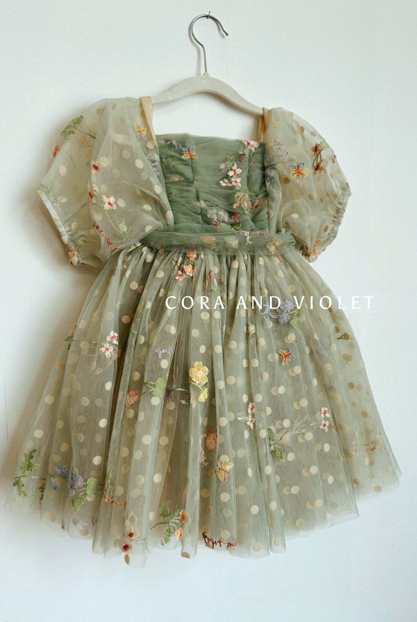 Embroidered mushrooms, sequins & 3D lace butterflies. The perfect dress for your fairies magical garden birthday!