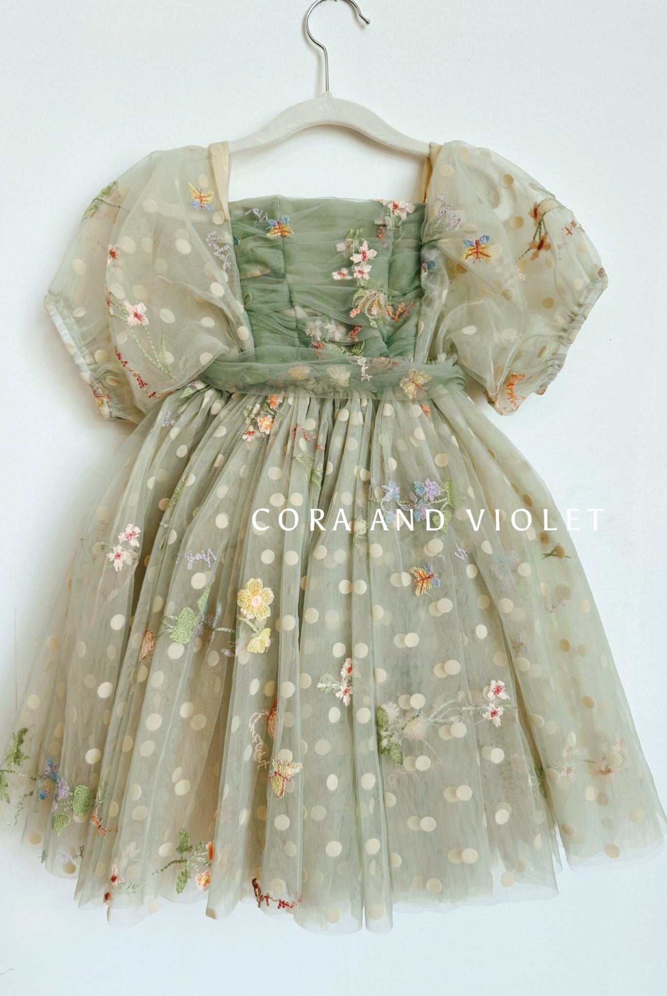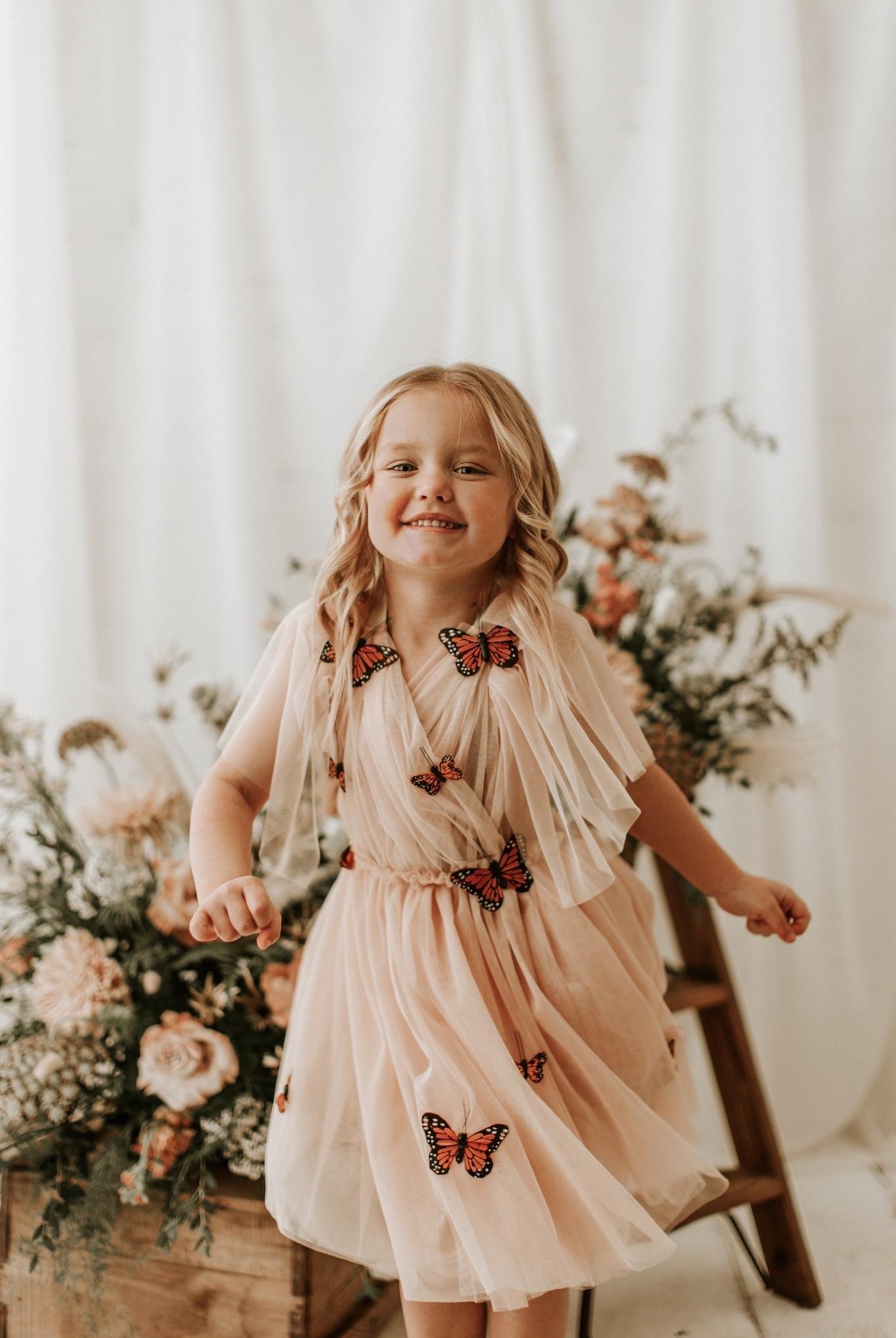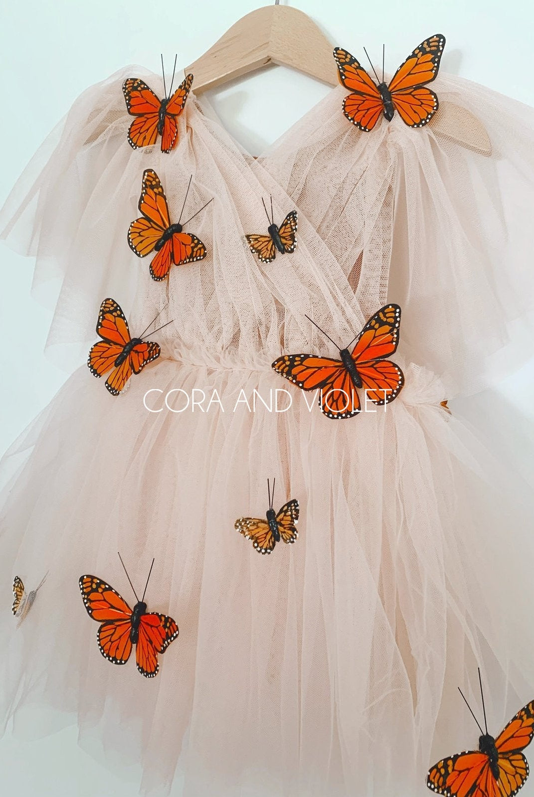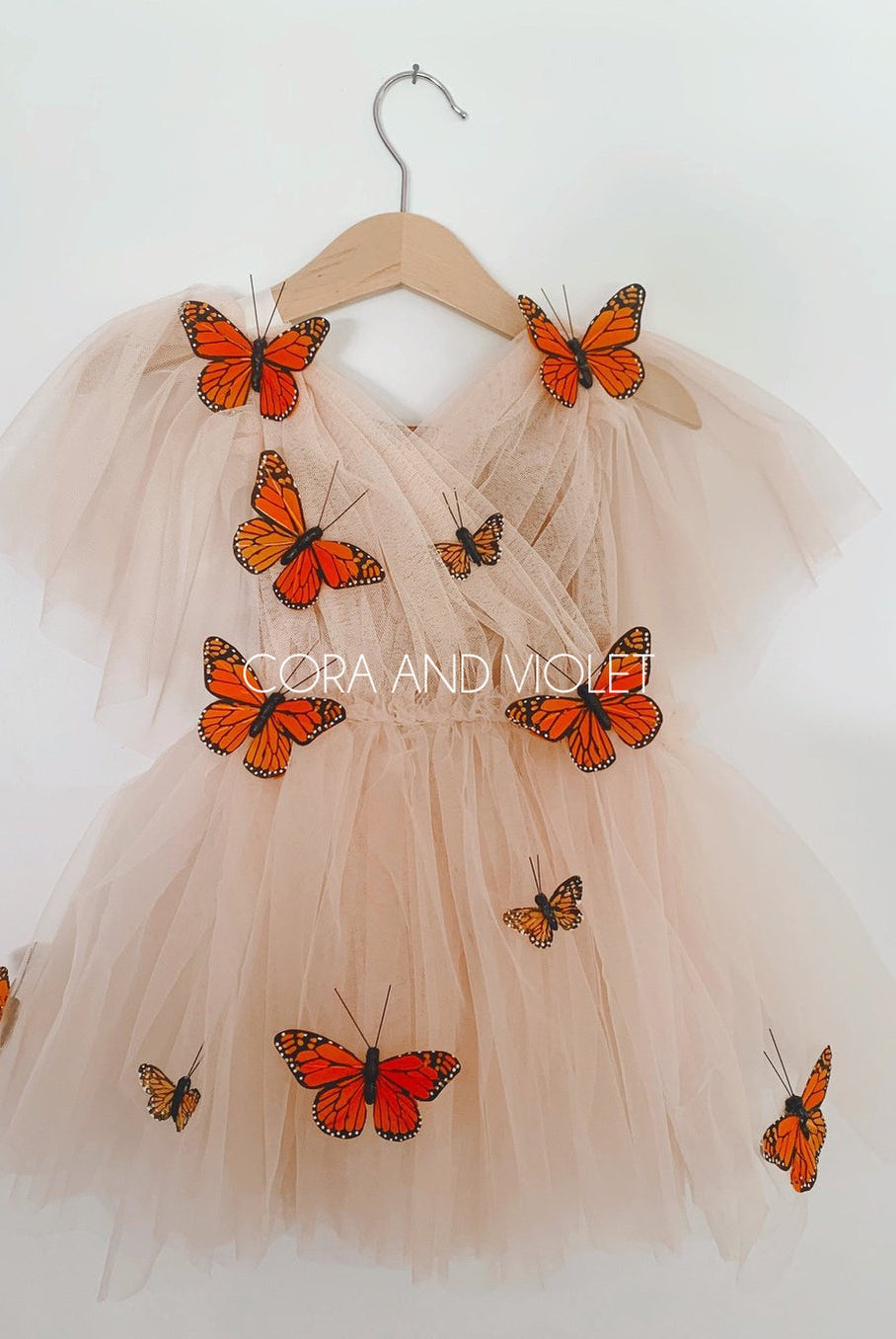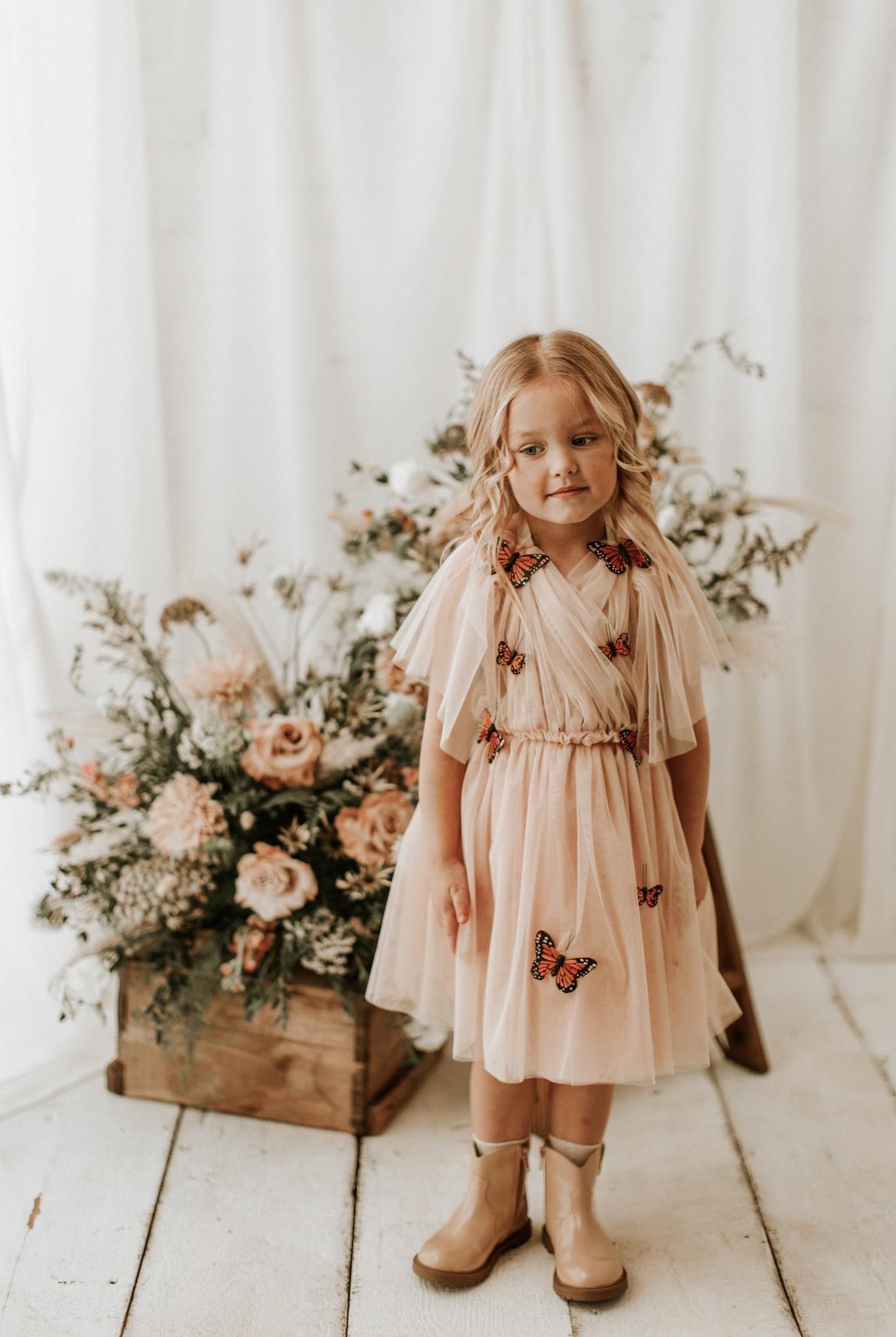 Embroidered mushrooms, sequins & 3D lace butterflies. The perfect dress for your fairies magical garden birthday!