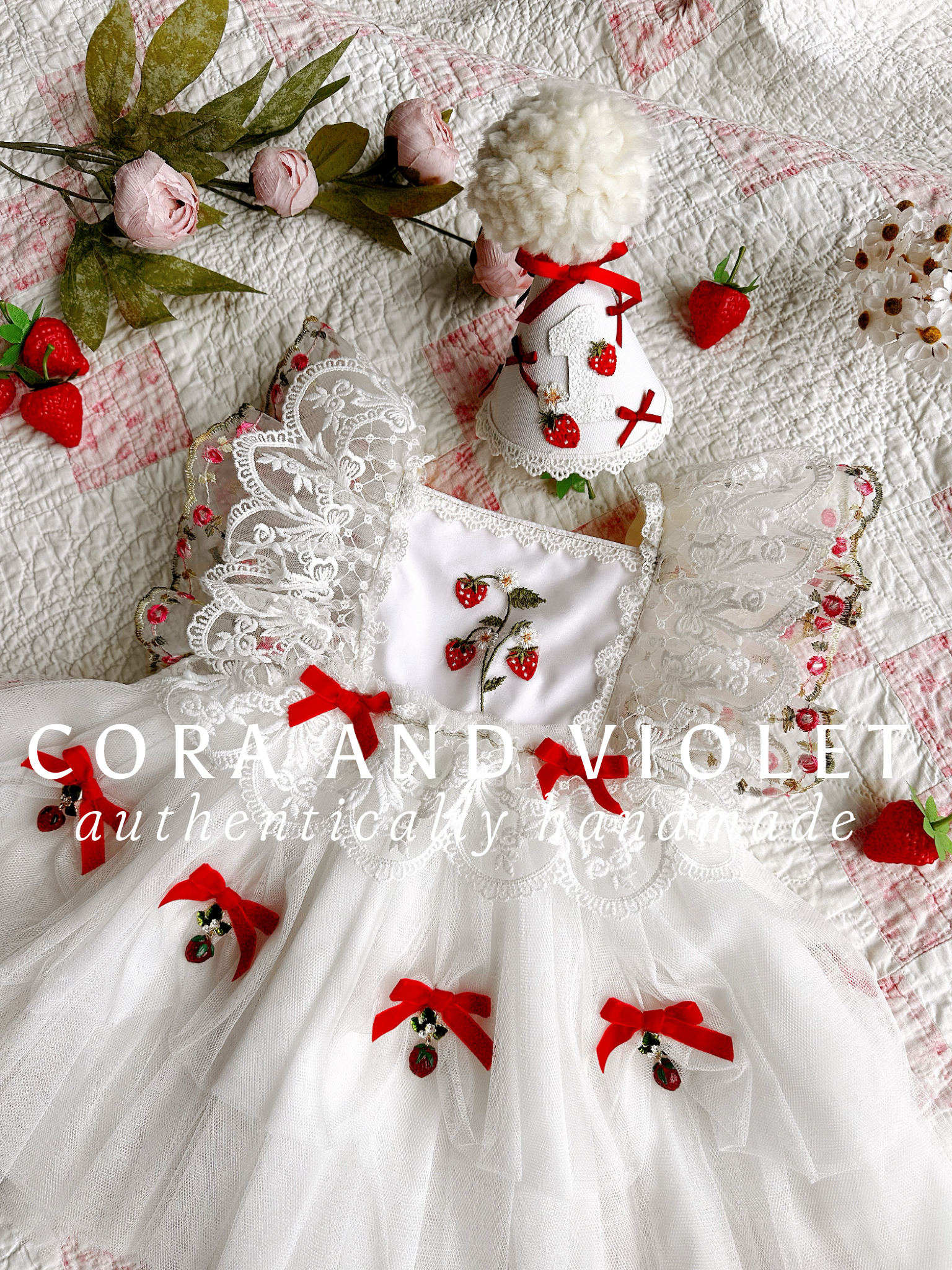 Birthdays are always a blast, celebrate your berry first birthday with our Birthday dress at Cora and violet. Don’t forget your matching party hat!