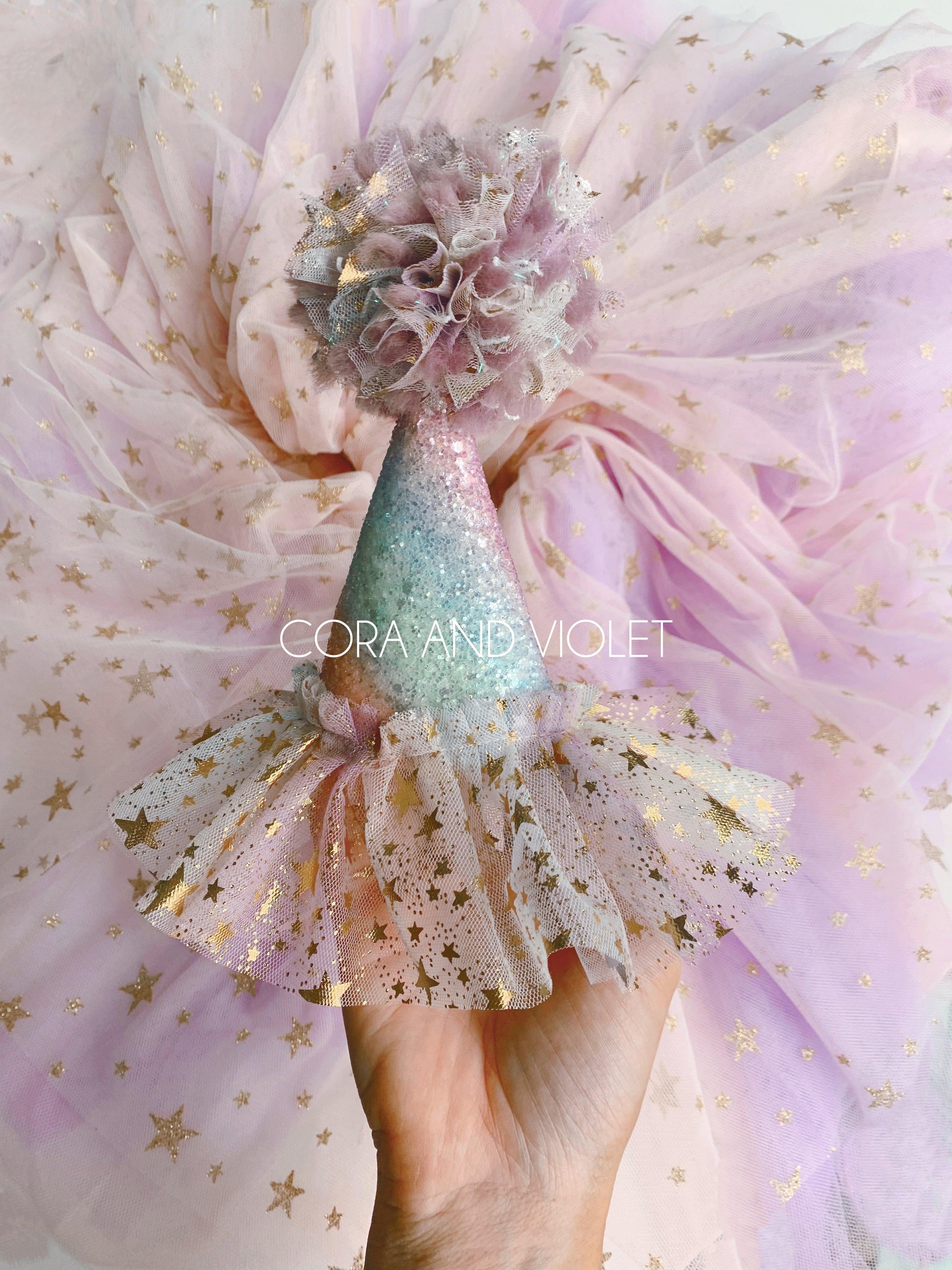 Featuring our new pom, a mix of tulle, stars, glitter fibers and soft pastel yarns for a truly magical array of color sparkle and fun! hand-stitched pom, made from a few dozen layers of tulle.
