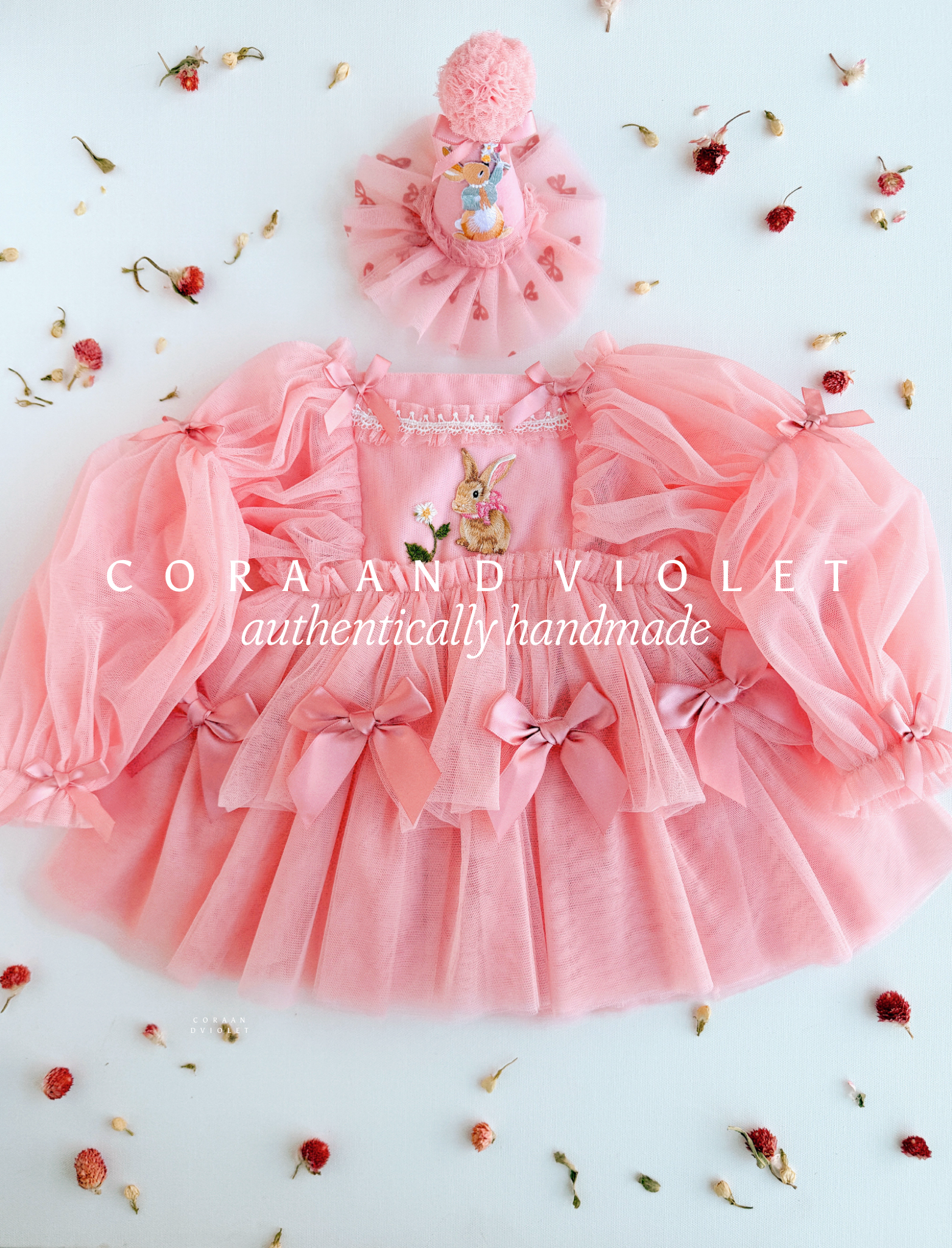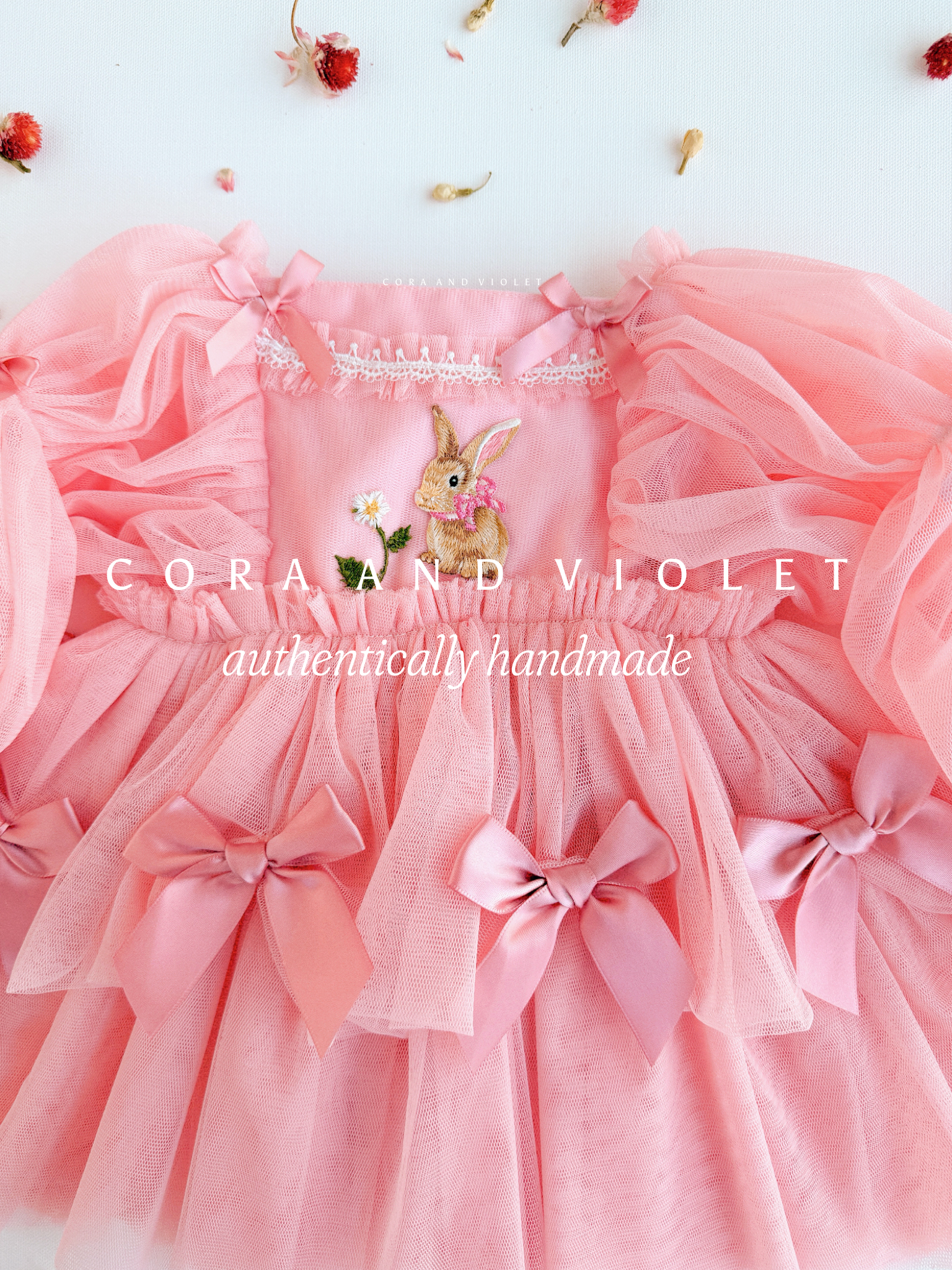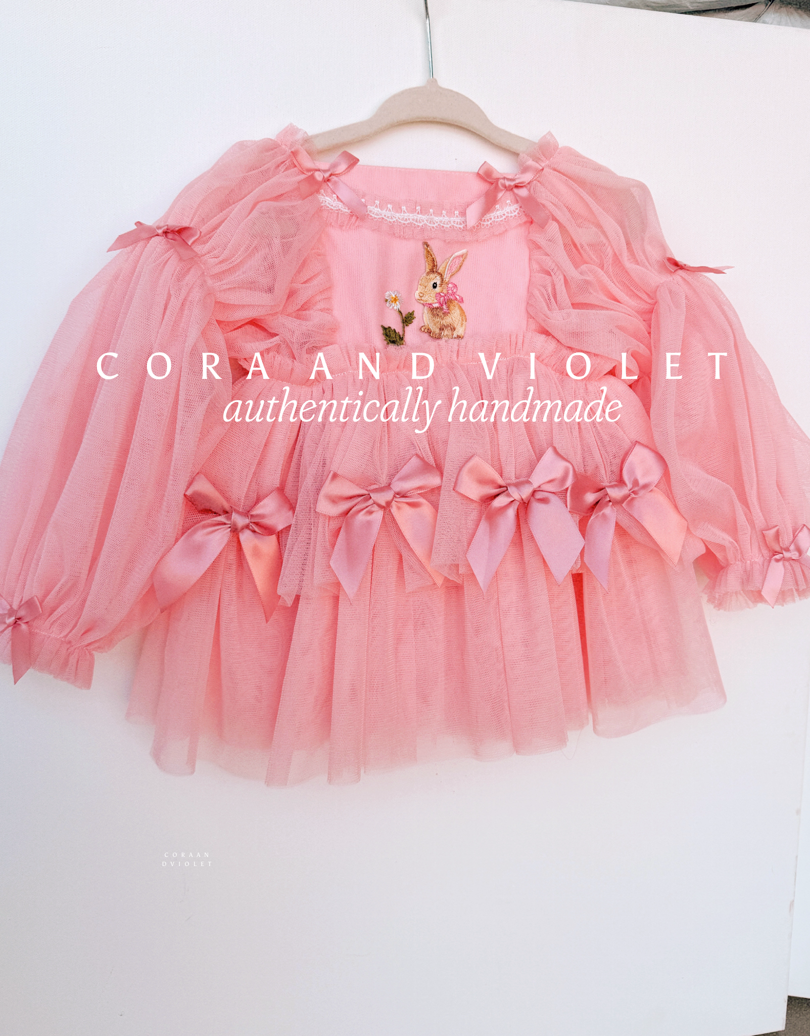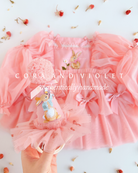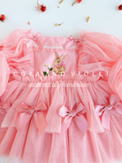 At the heart of the bodice sits a beautifully detailed, embroidered bunny, a nod to the wonders of nature and the magic of childhood. To add a touch of "Coquette" elegance, we’ve adorned the sleeves and skirt with hand-tied satin bows, creating a look that is as playful as it is sophisticated.