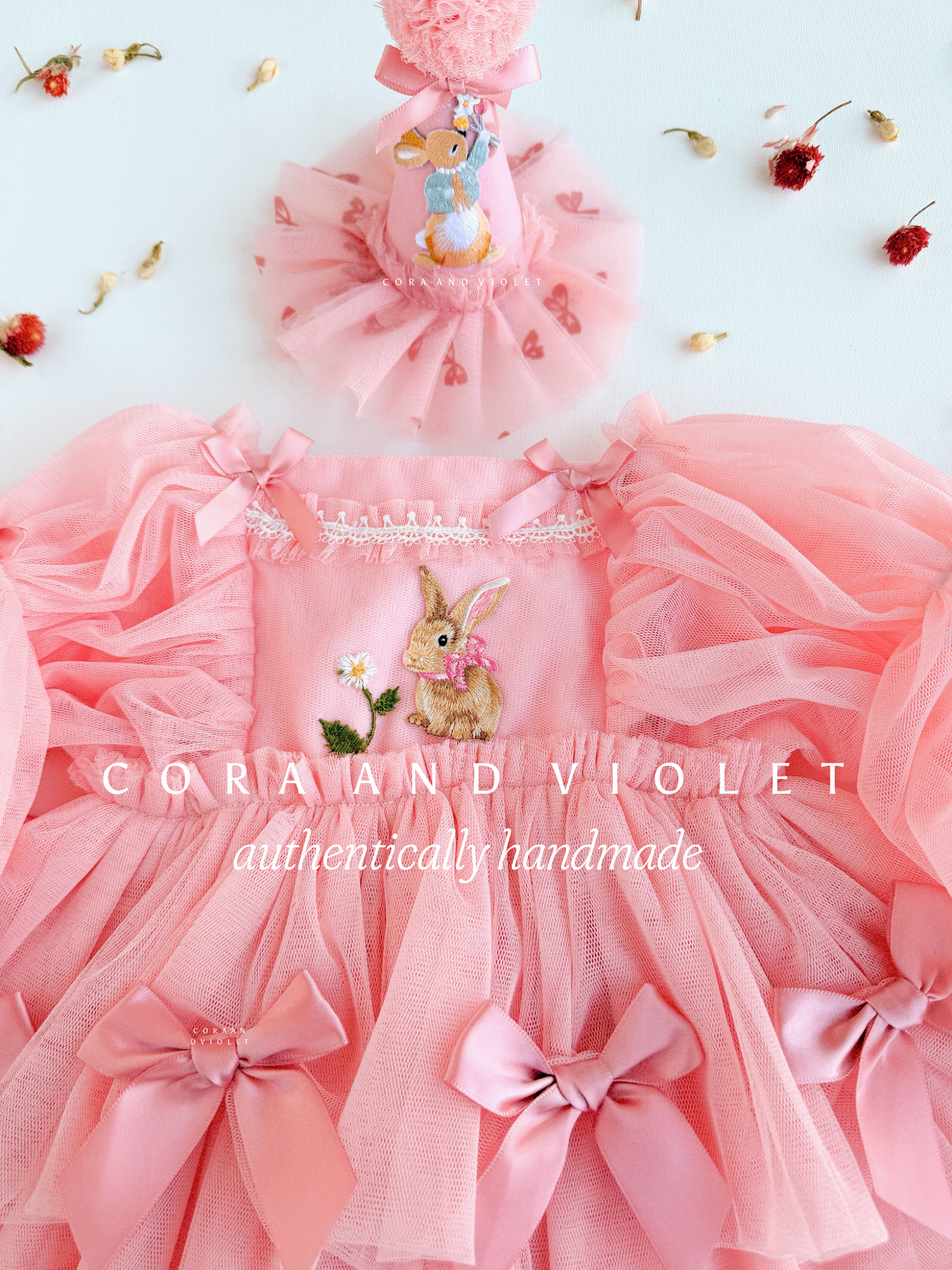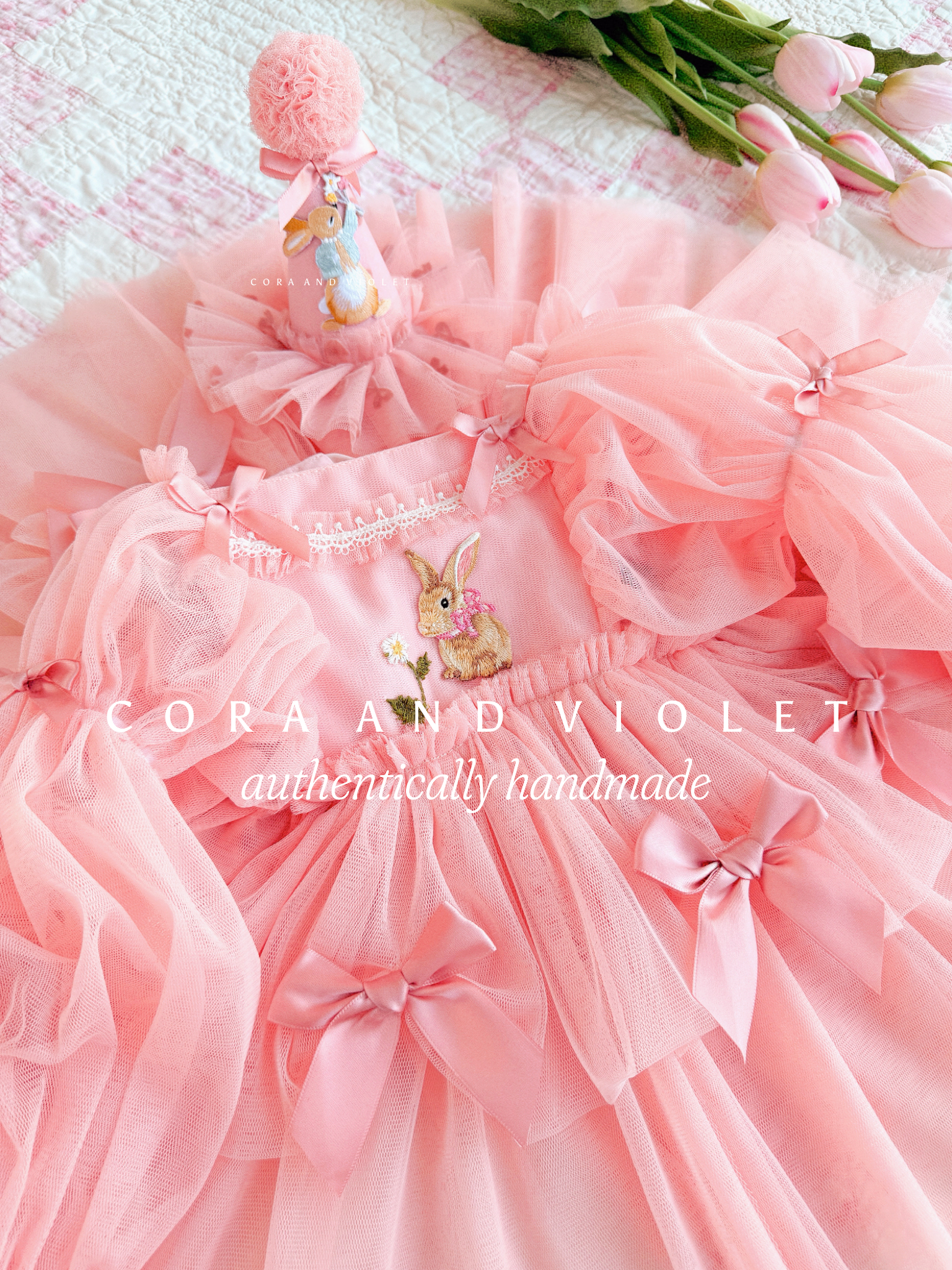 No Cora and Violet celebration is complete without the matching accessory. Our coordinating "Some Bunny" party hat features the same iconic bunny motif, crowned with a plush, oversized pom-pom and finished with a delicate tulle ruffle.