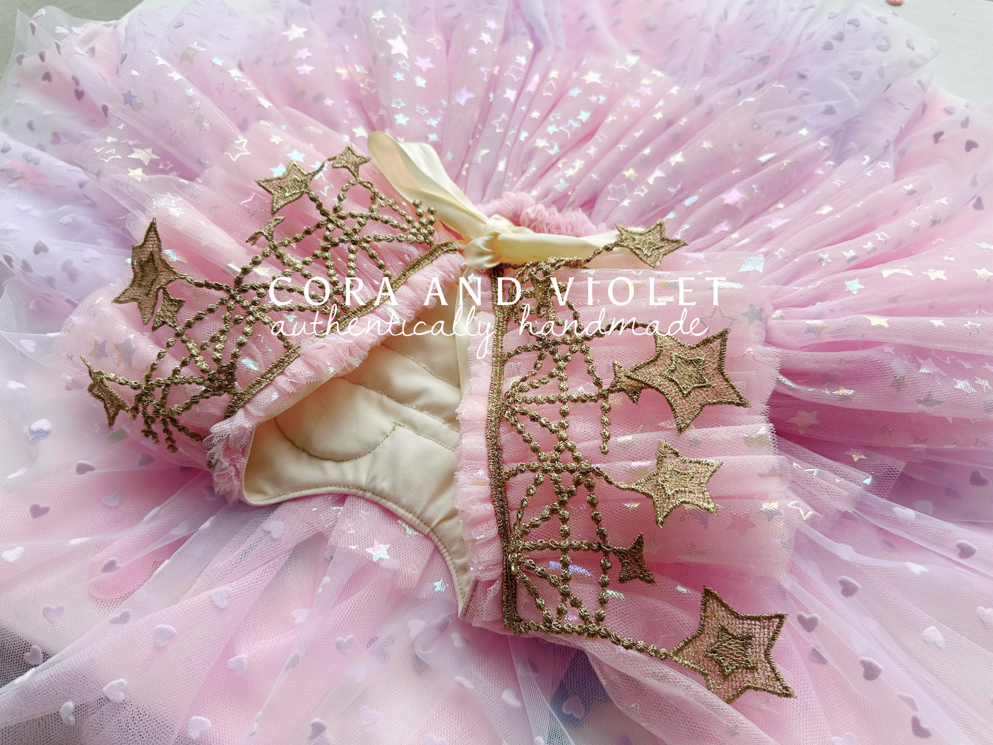 Sparkle-Filled Bib: Our signature "Shaker-Style" bib is filled with hand-placed sparkles and whimsy, protected behind soft layers so the glitter stays in the dress—not on the floor.