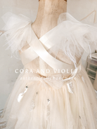 Flirty fun sleeves are individually placed sections of tulle, cascading over the shoulder to mimic icing.