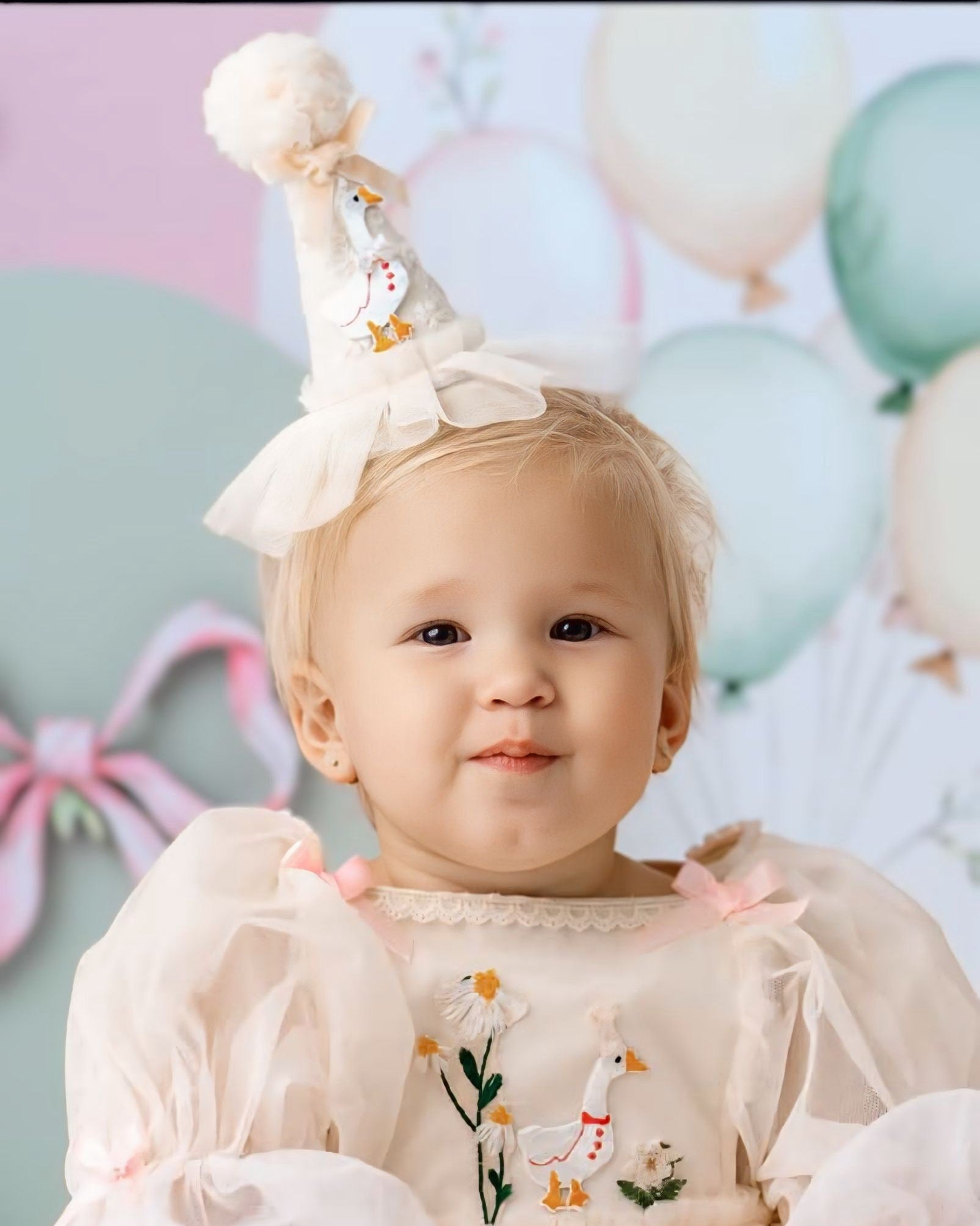 Celebrate her milestone with an original. Our signature Silly Goose design is an artisanal blend of whimsy and heritage. Each dress features a hand-detailed goose motif nestled among delicate florals, perfectly tailored for first birthdays and cherished portraits.