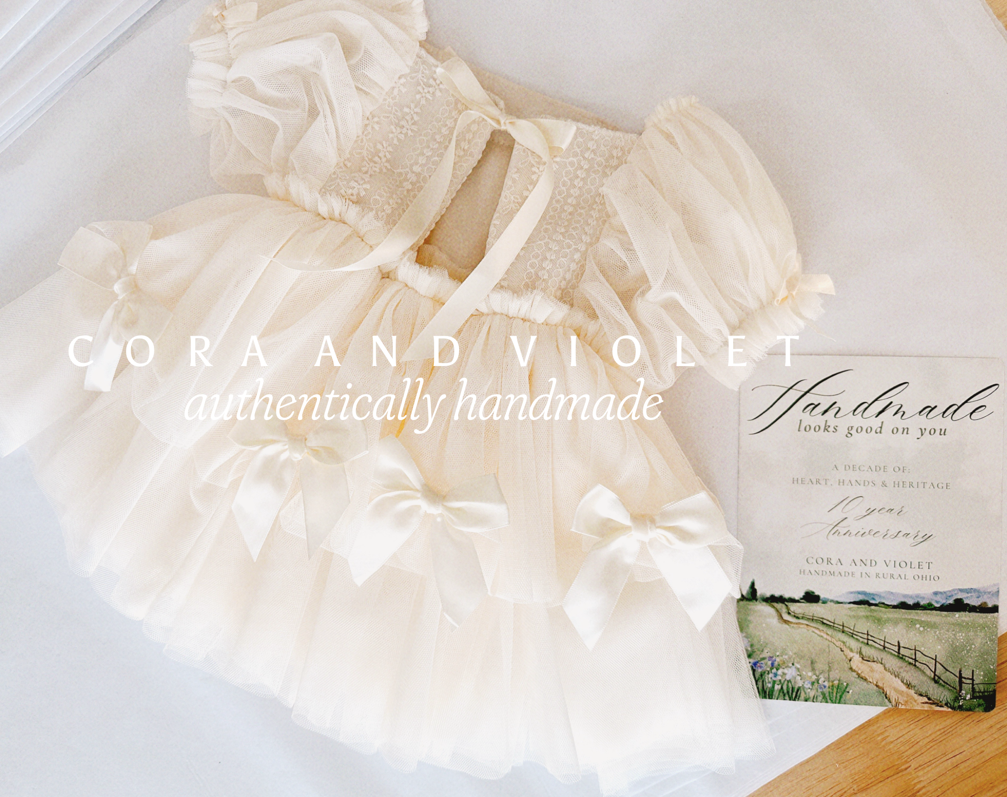 Handcrafted for Memories: Cora and Violet creations are artisan-made photography props and milestone garments designed for supervised use. Because each piece is a bespoke work of art—often incorporating vintage textiles, delicate laces, and hand-applied adornments—they are not intended for sleepwear or unsupervised play.