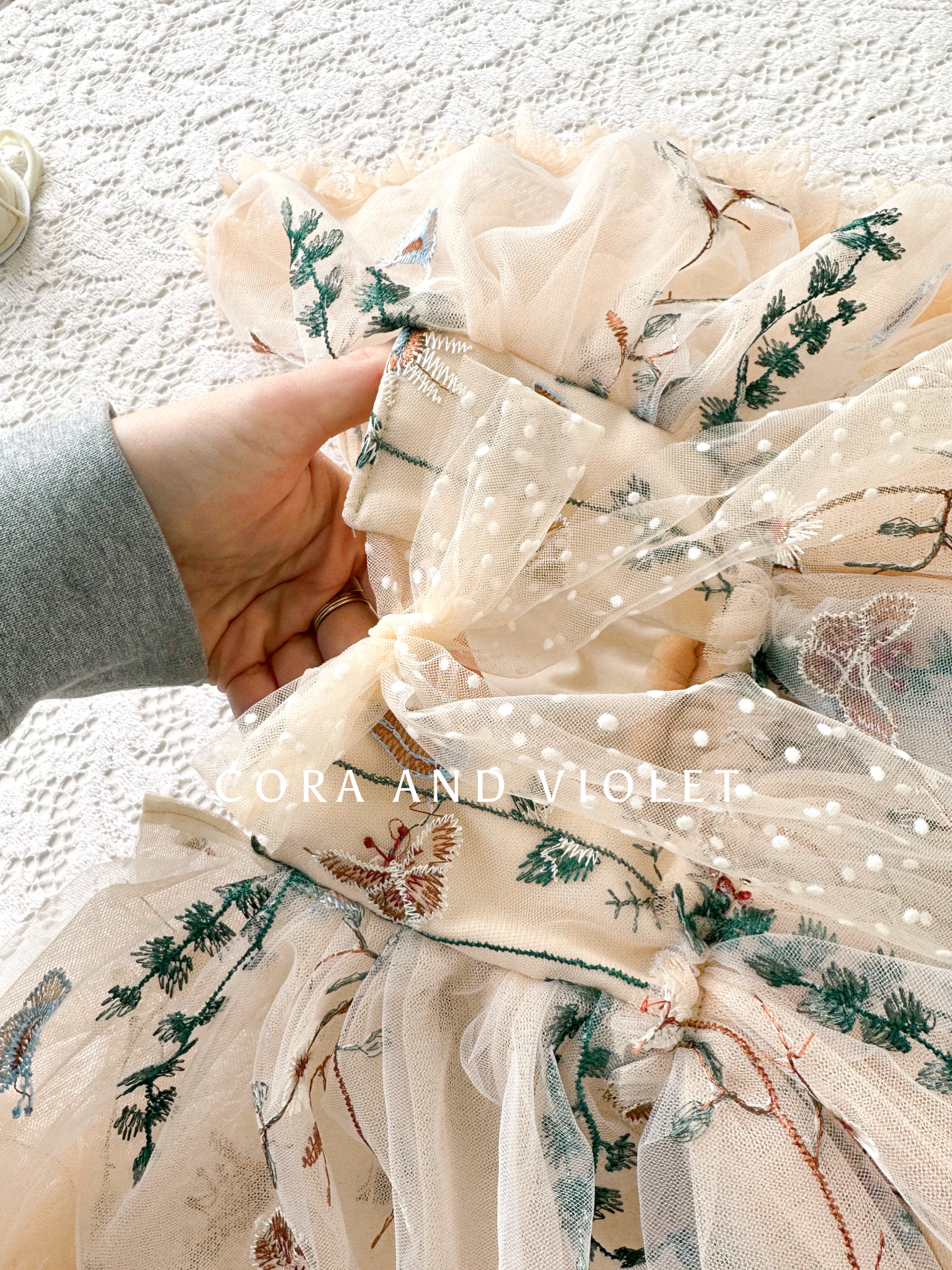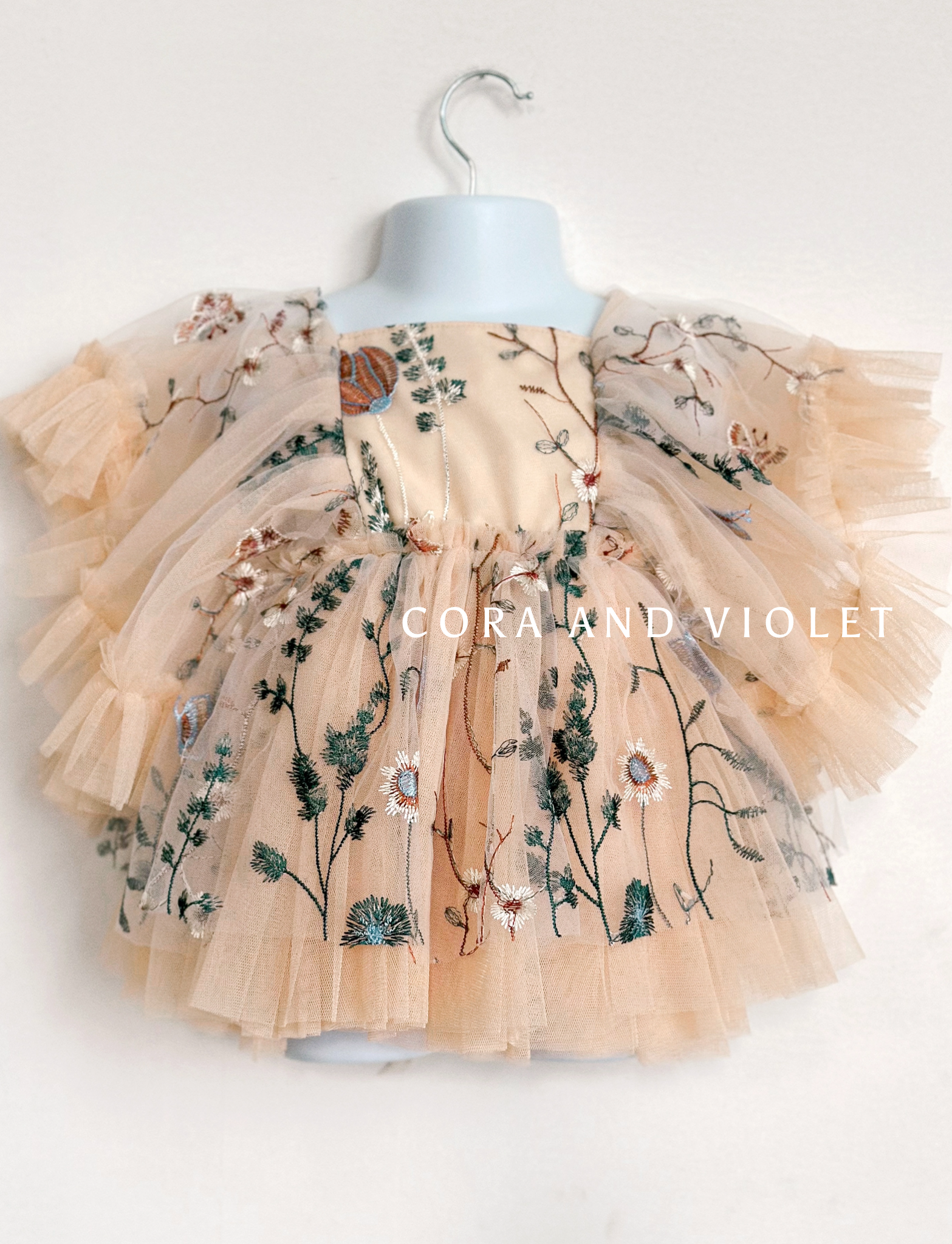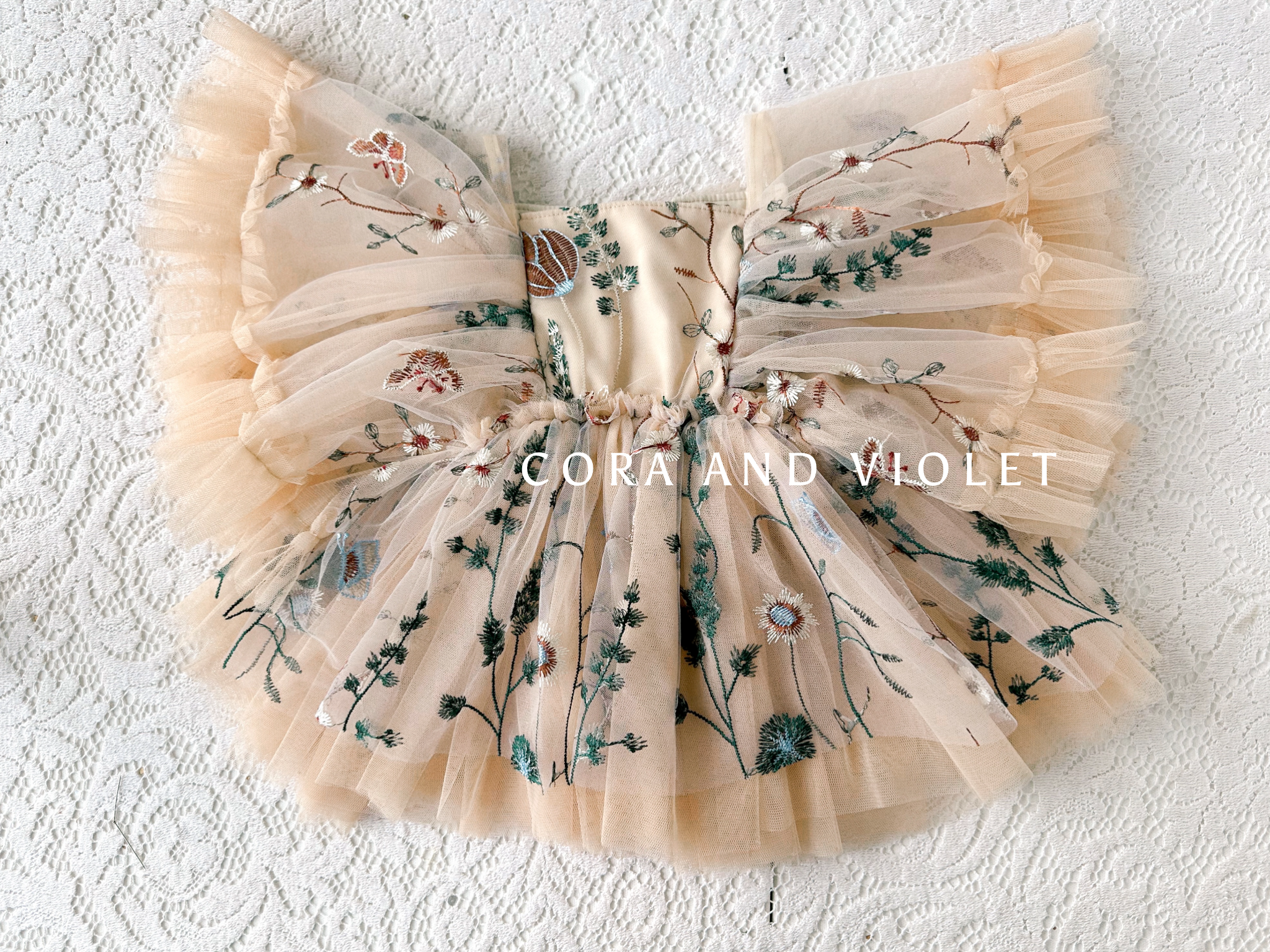 layers of soft taupe tulle under an embroidered bed of flowers & butterflies.