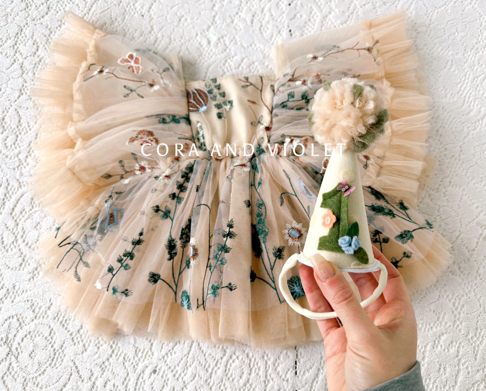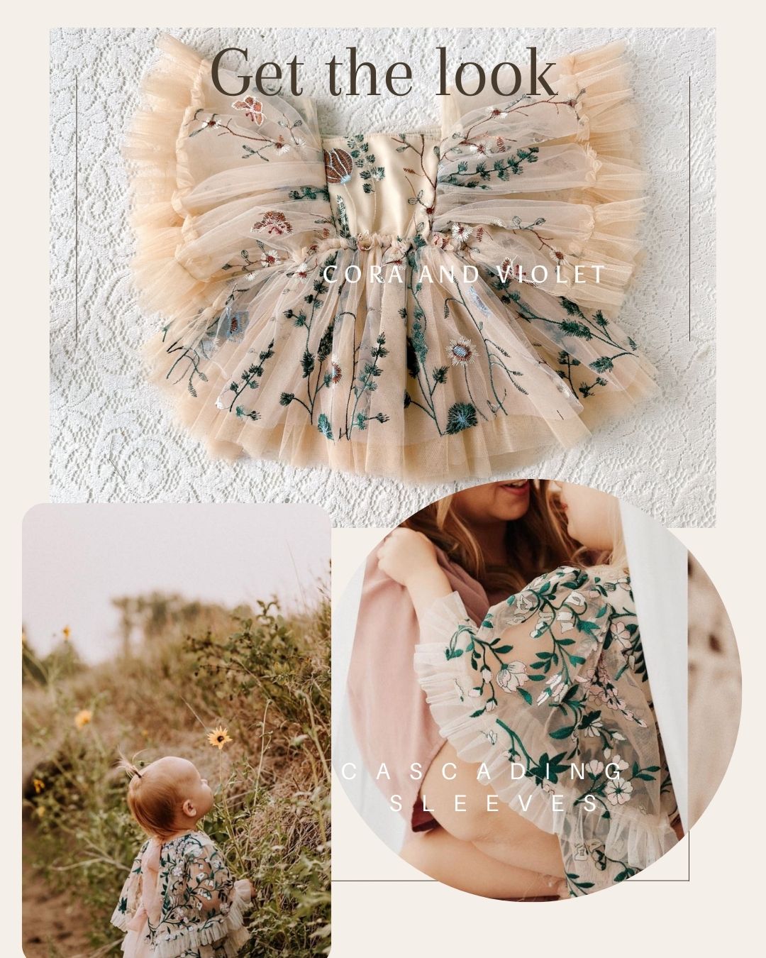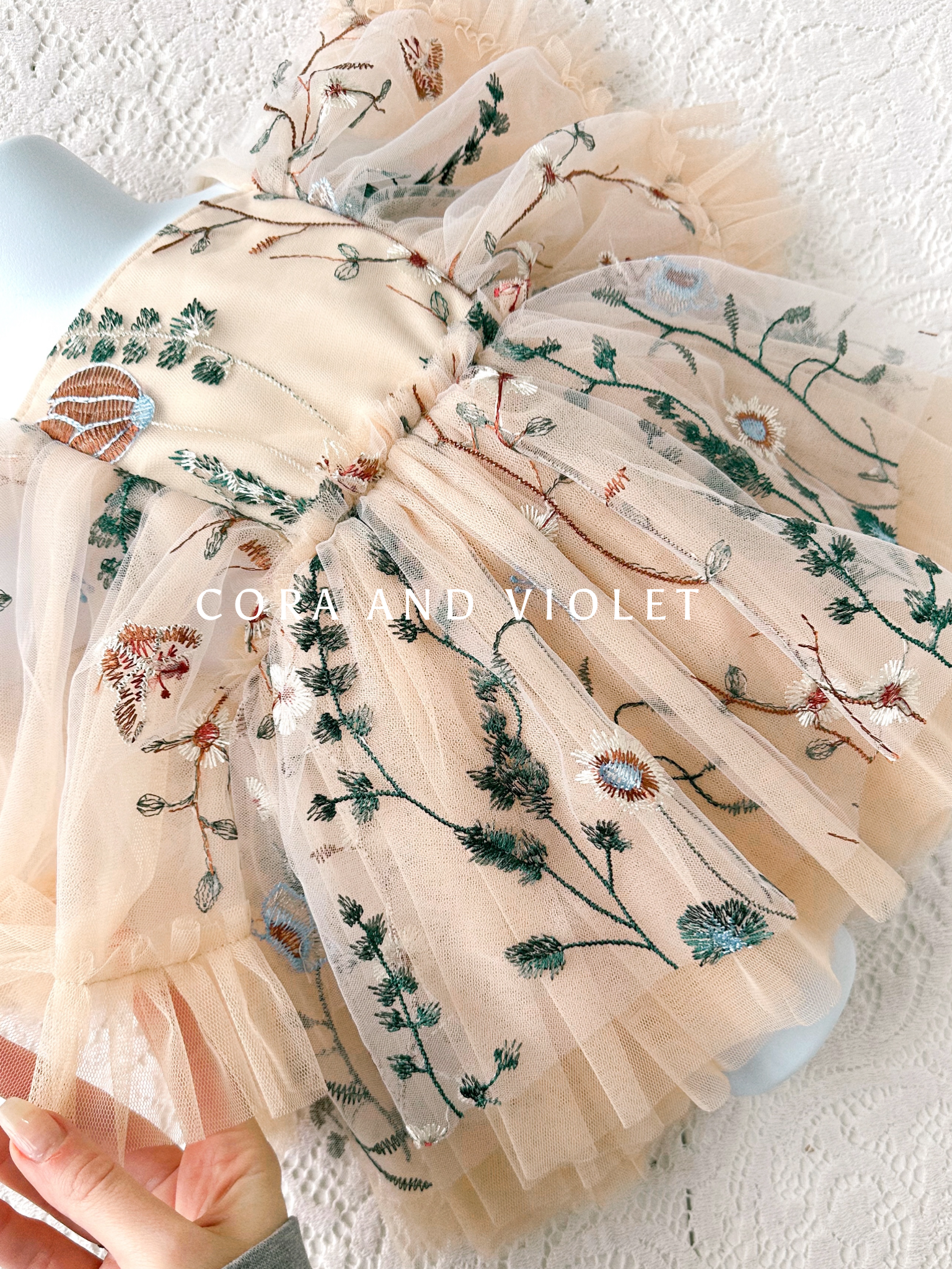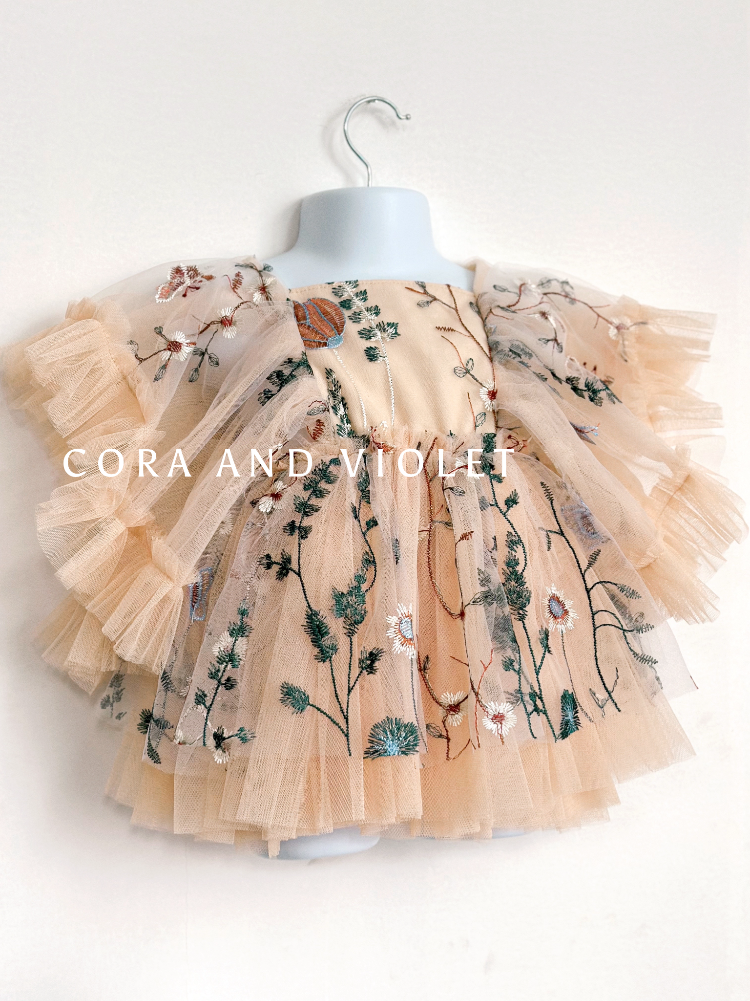 layers of soft taupe tulle under an embroidered bed of flowers & butterflies.