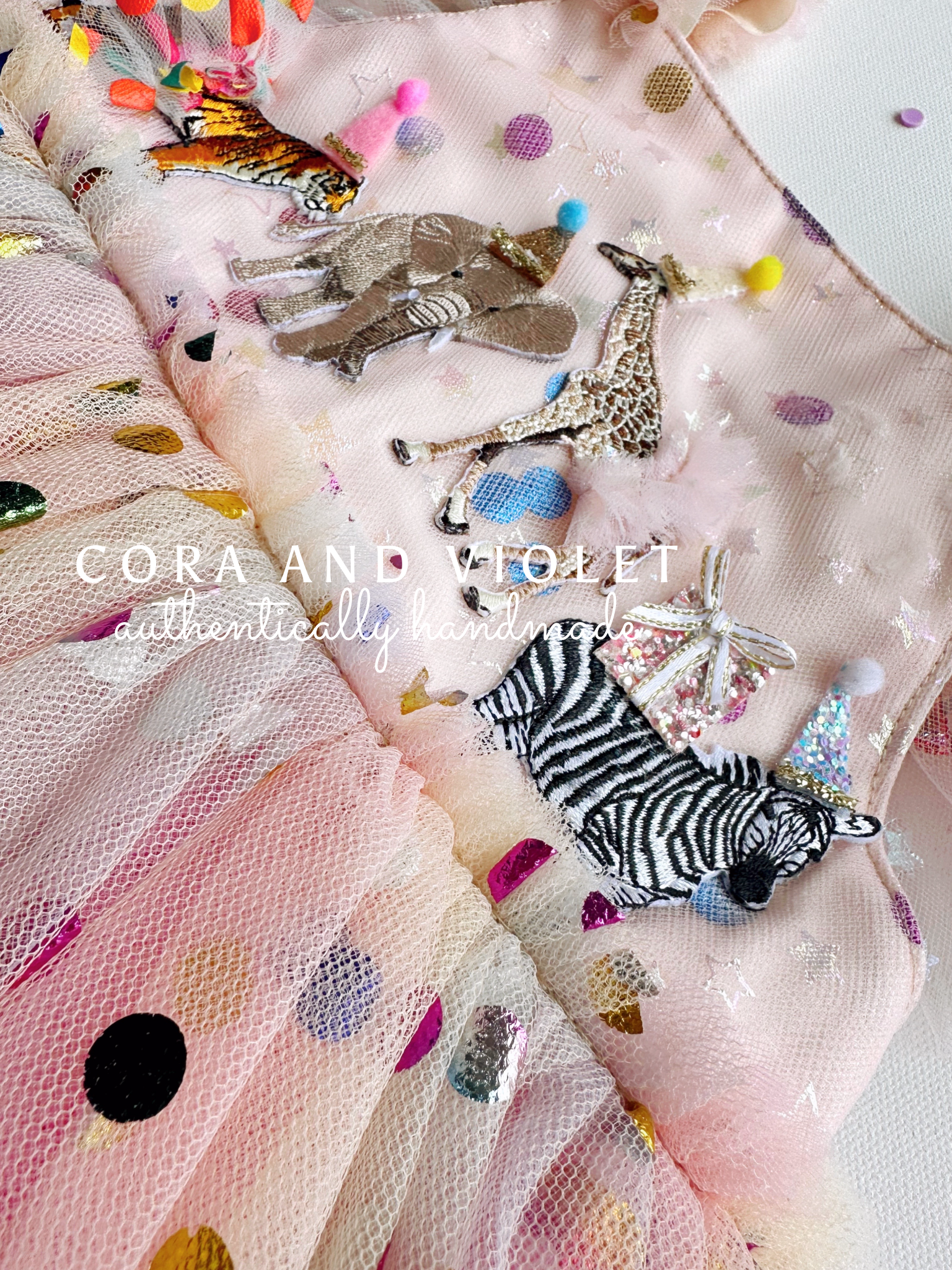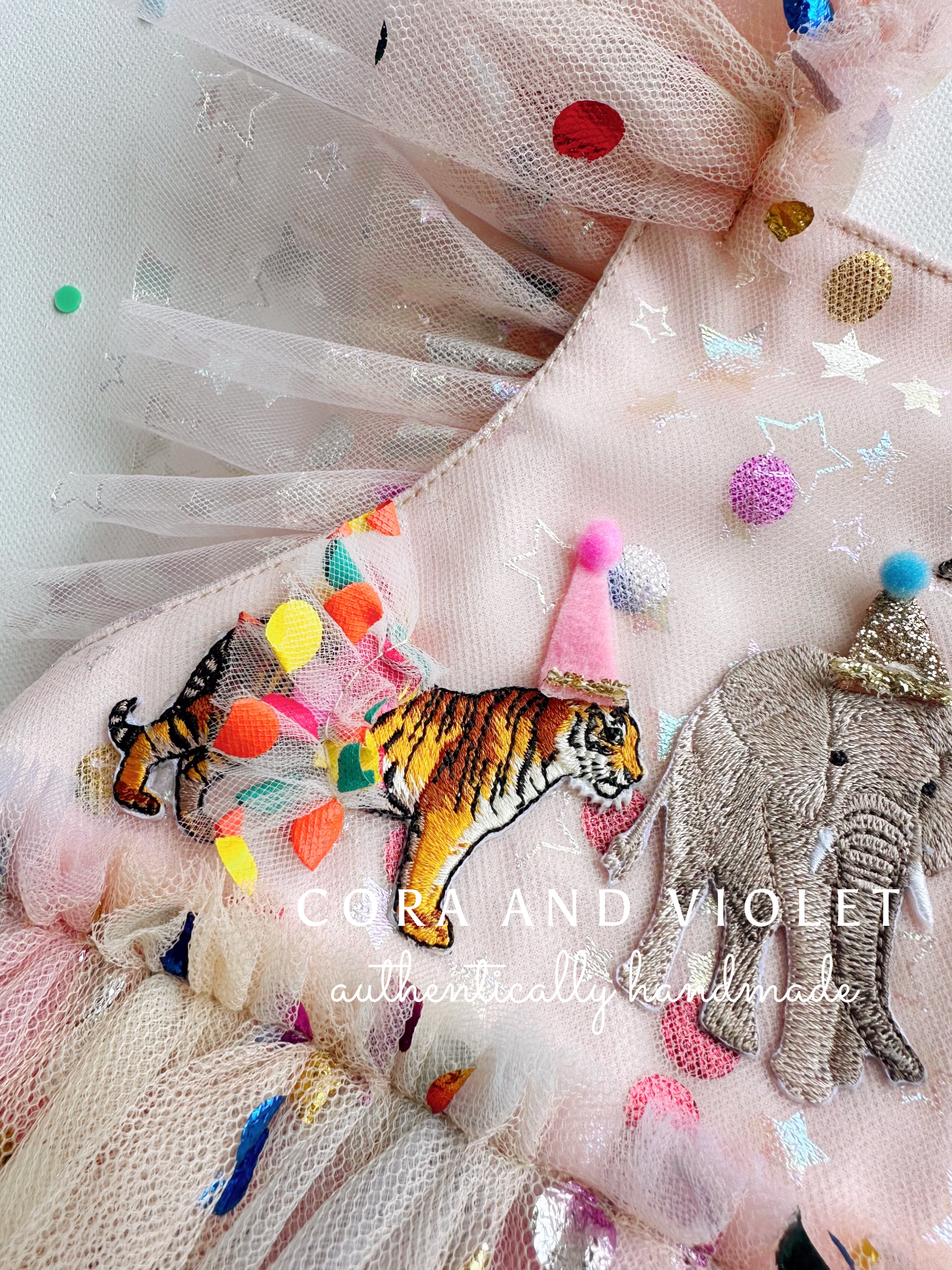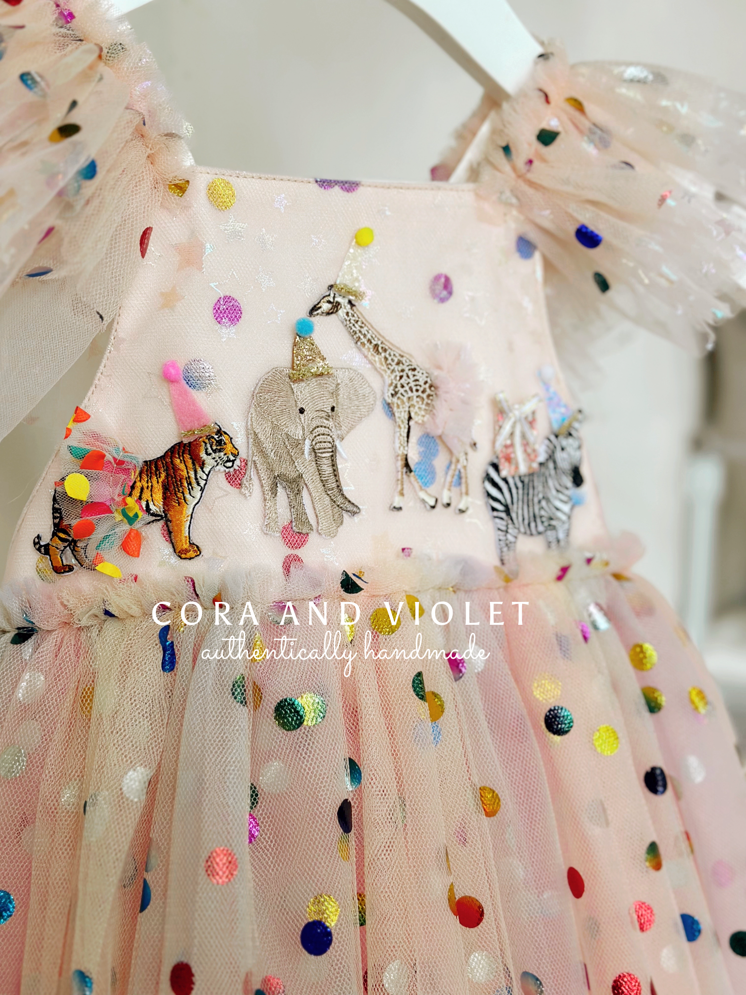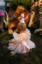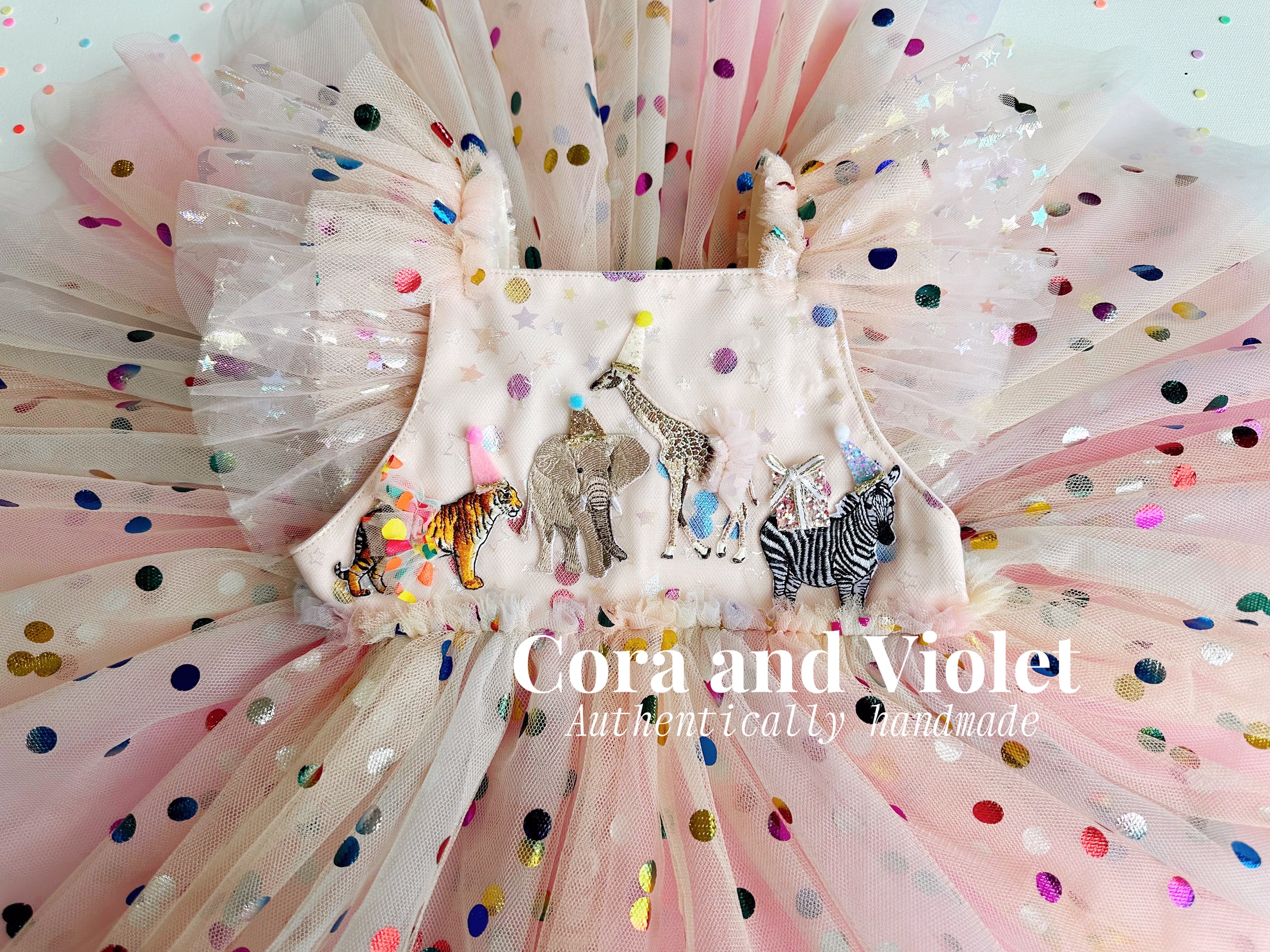 The Design: A masterpiece of playful imagination, The Party Animal dress is designed for the little one who is truly the "soul of the party." This artisan dress features a curated parade of circus animals, each brought to life with my signature handmade touch. Individually cut and sewn miniature party hats and tiny tulle tutus onto the animal motifs, creating a delightful 3D texture that captures the magic of a vintage carnival or "Wild One" celebration.