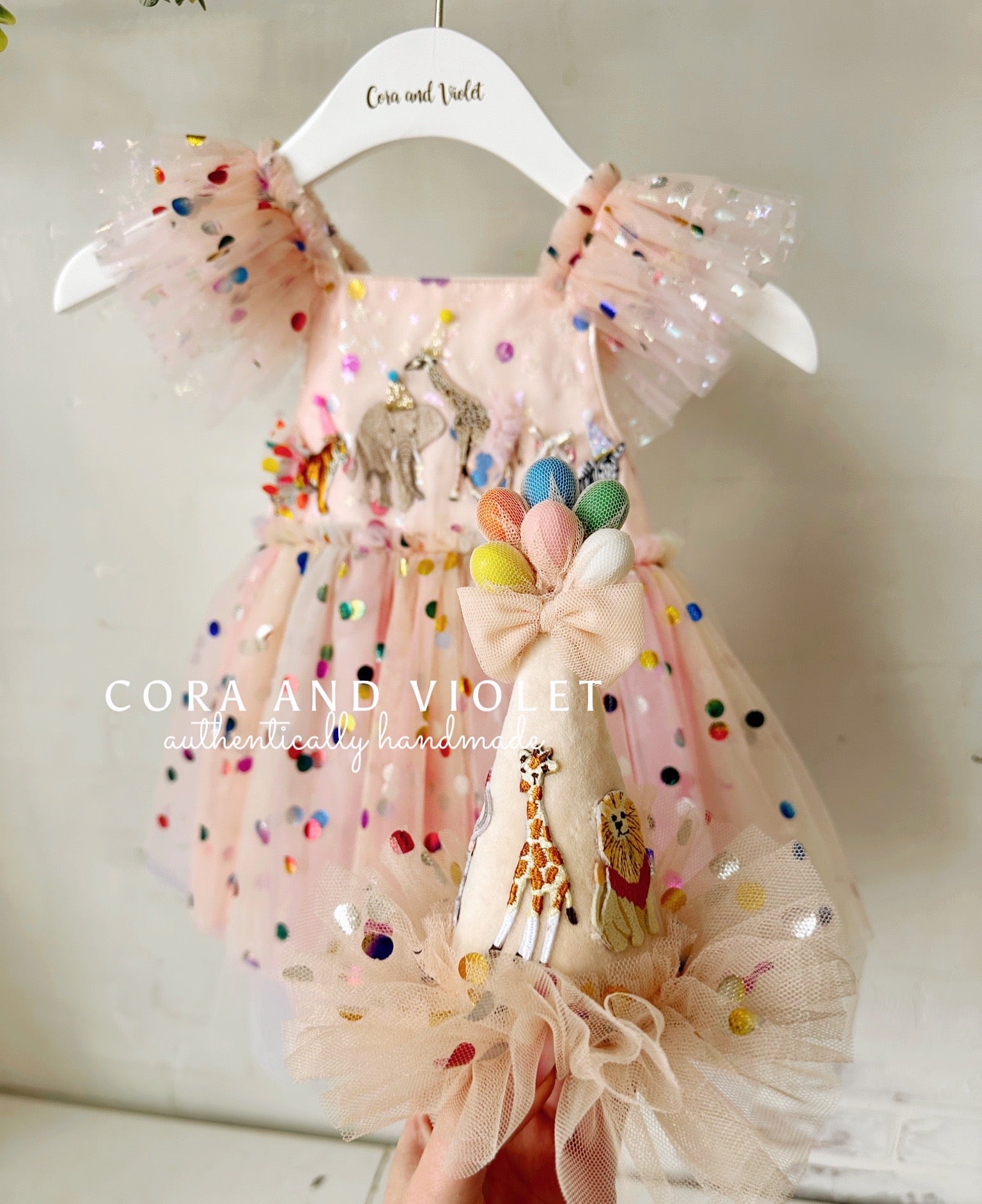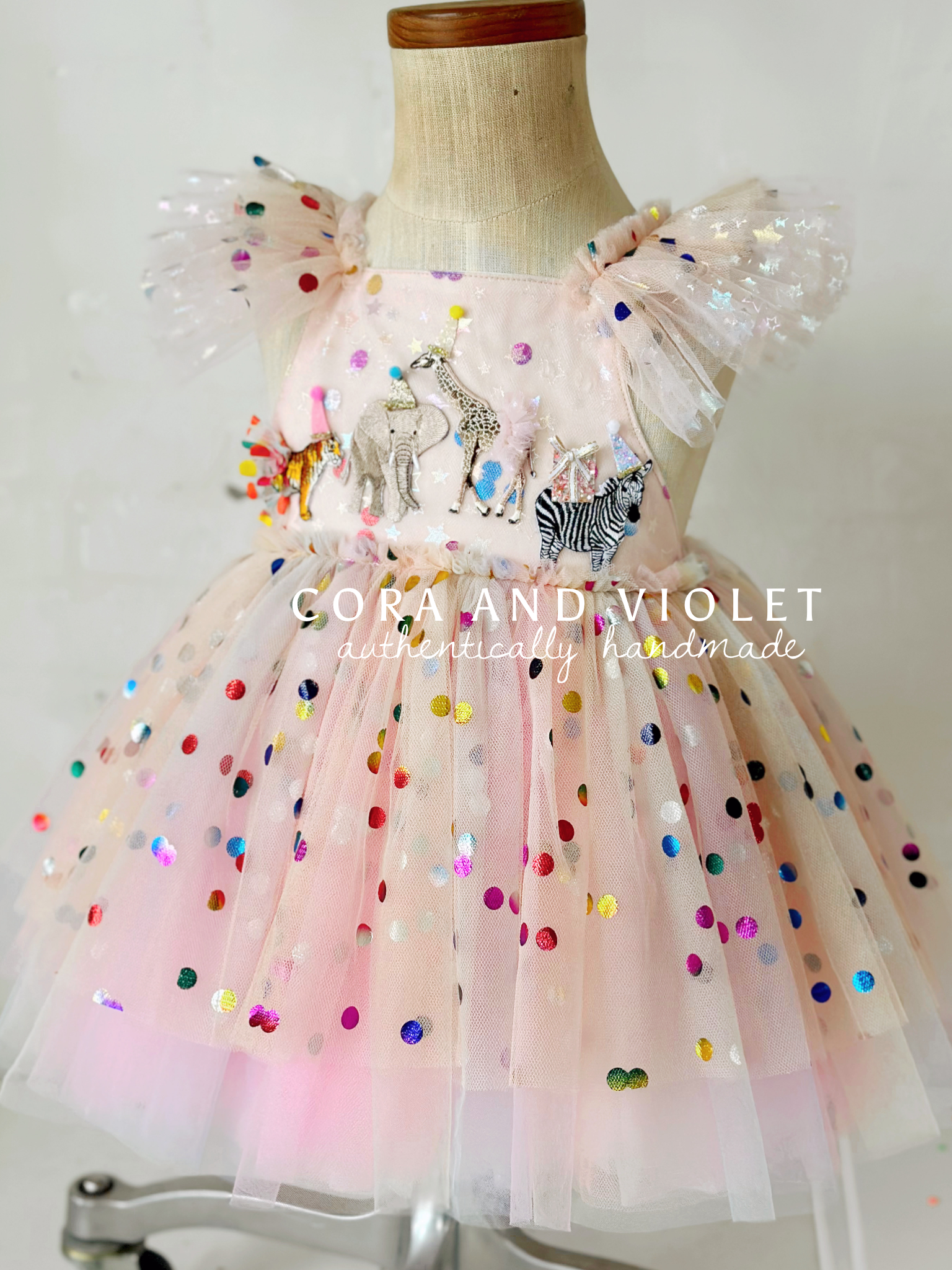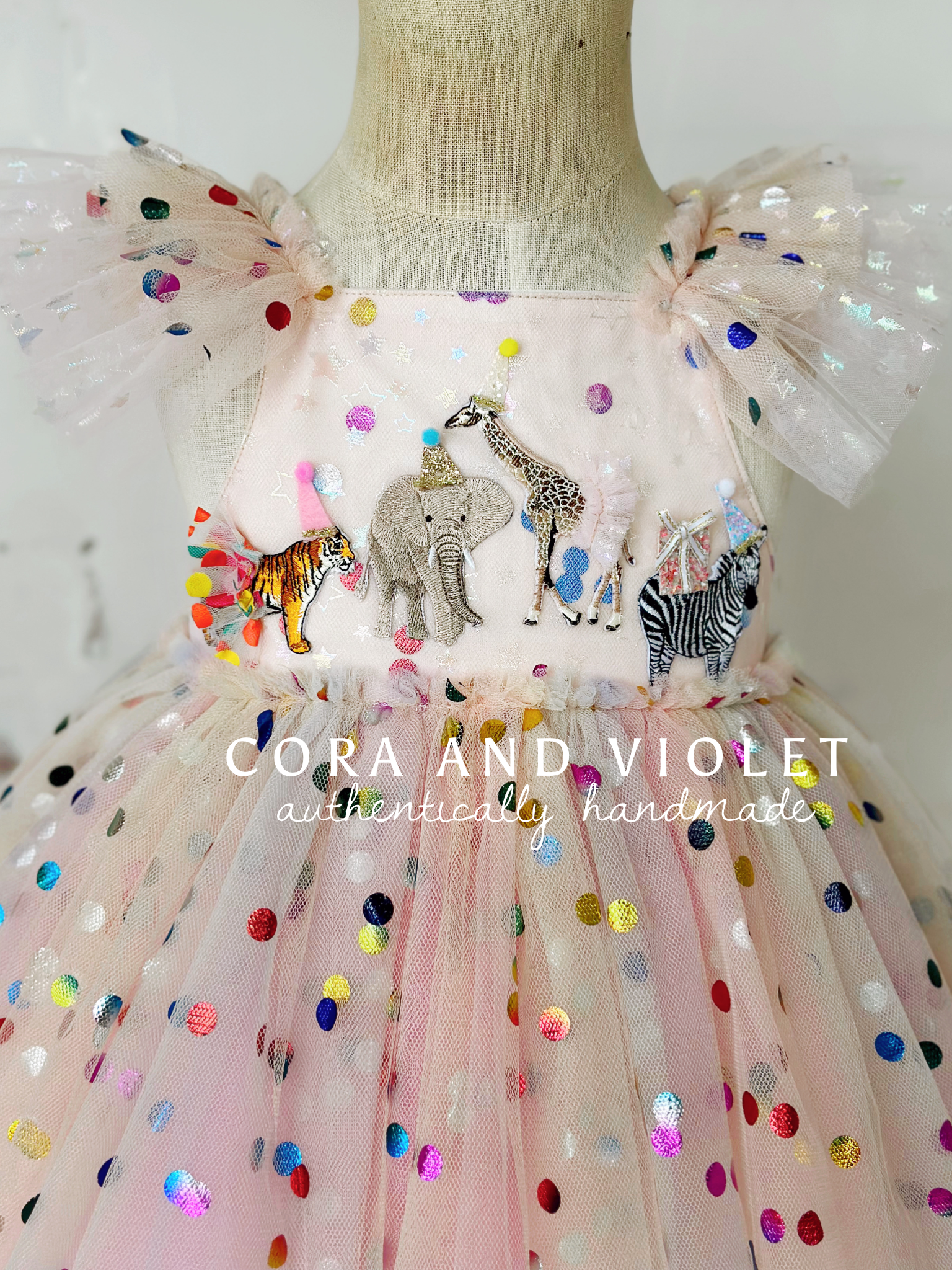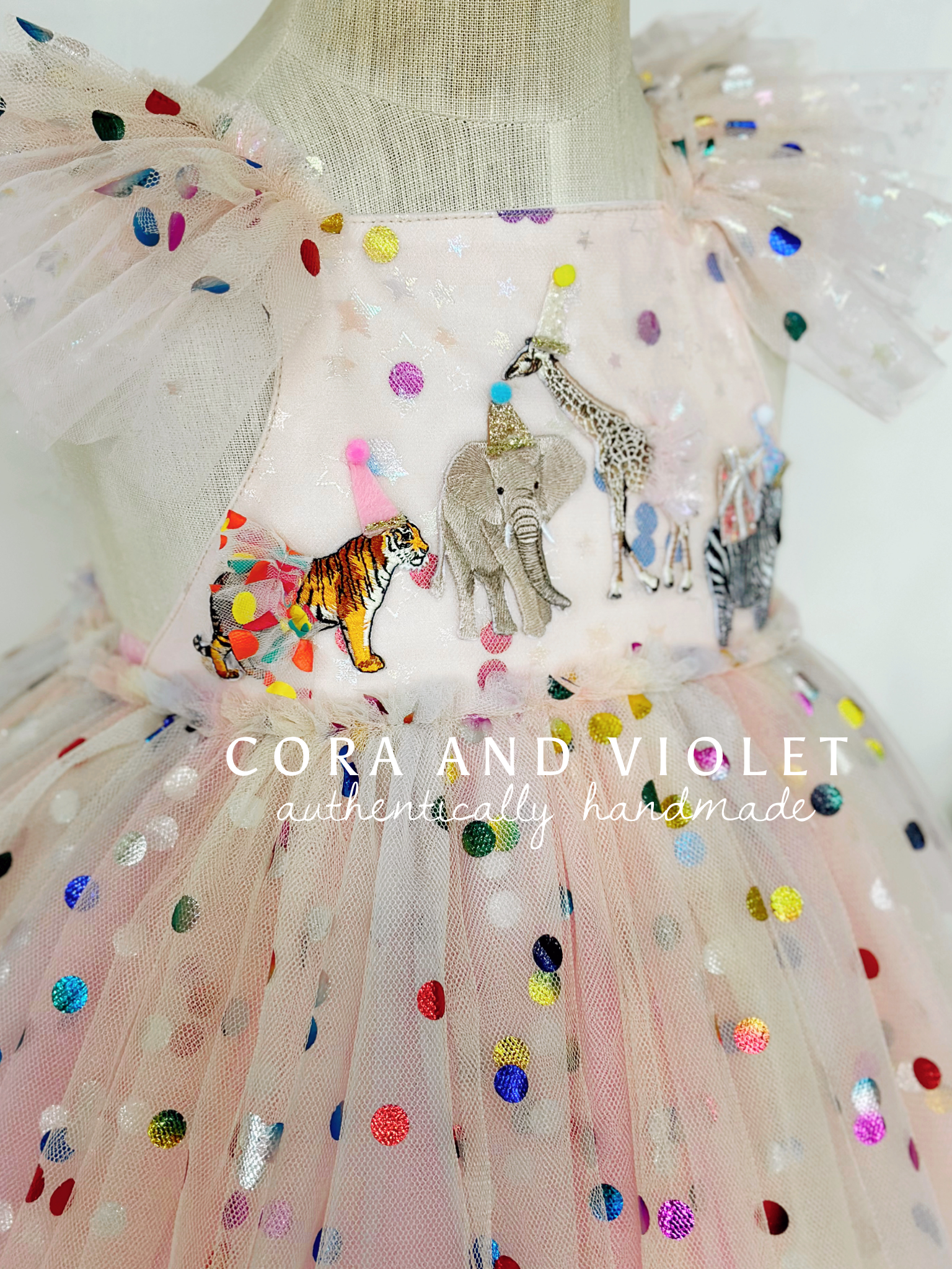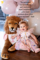 The Design: A masterpiece of playful imagination, The Party Animal dress is designed for the little one who is truly the "soul of the party." This artisan dress features a curated parade of circus animals, each brought to life with my signature handmade touch. Individually cut and sewn miniature party hats and tiny tulle tutus onto the animal motifs, creating a delightful 3D texture that captures the magic of a vintage carnival or "Wild One" celebration.