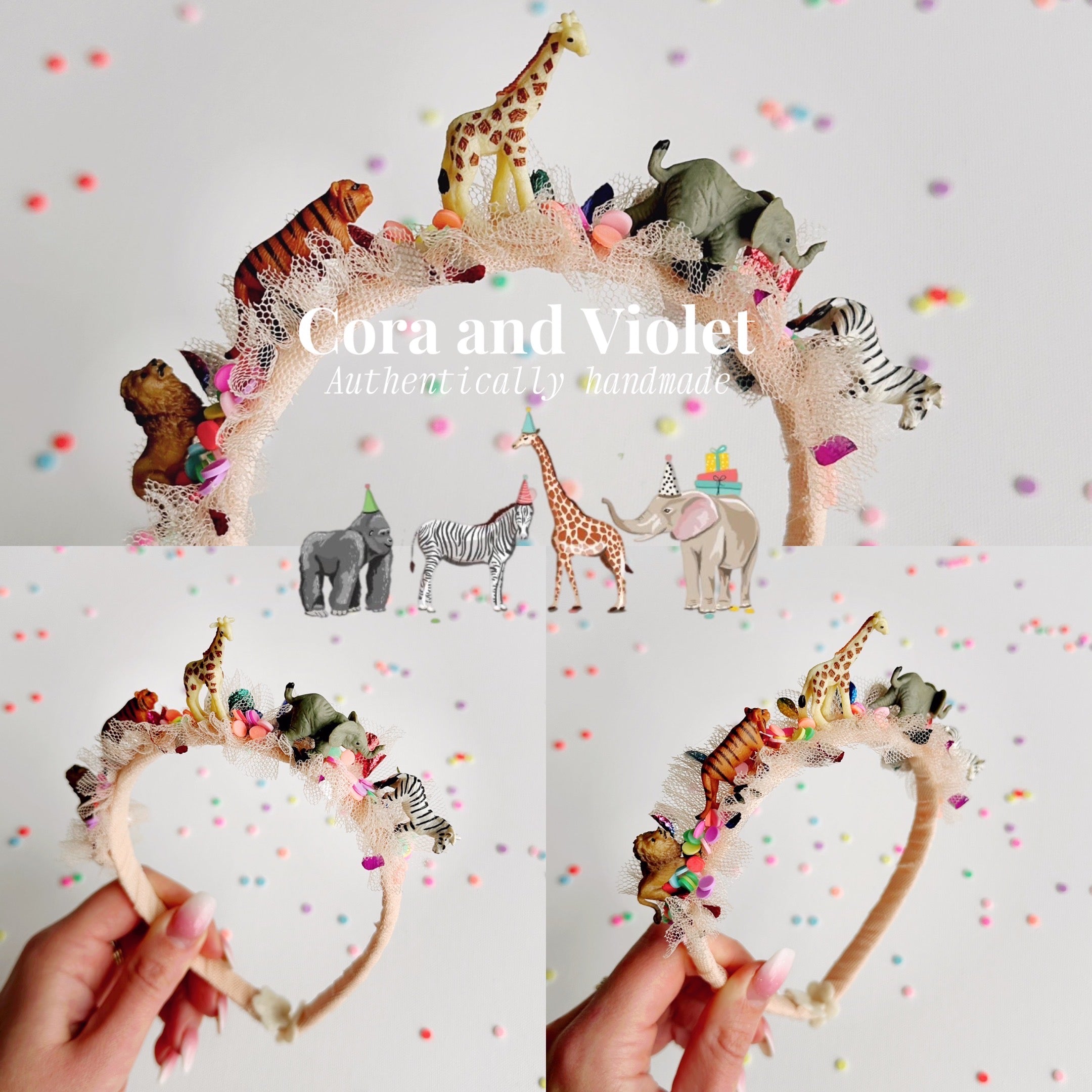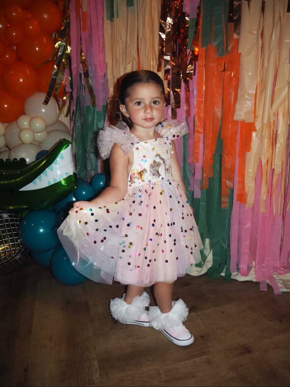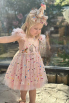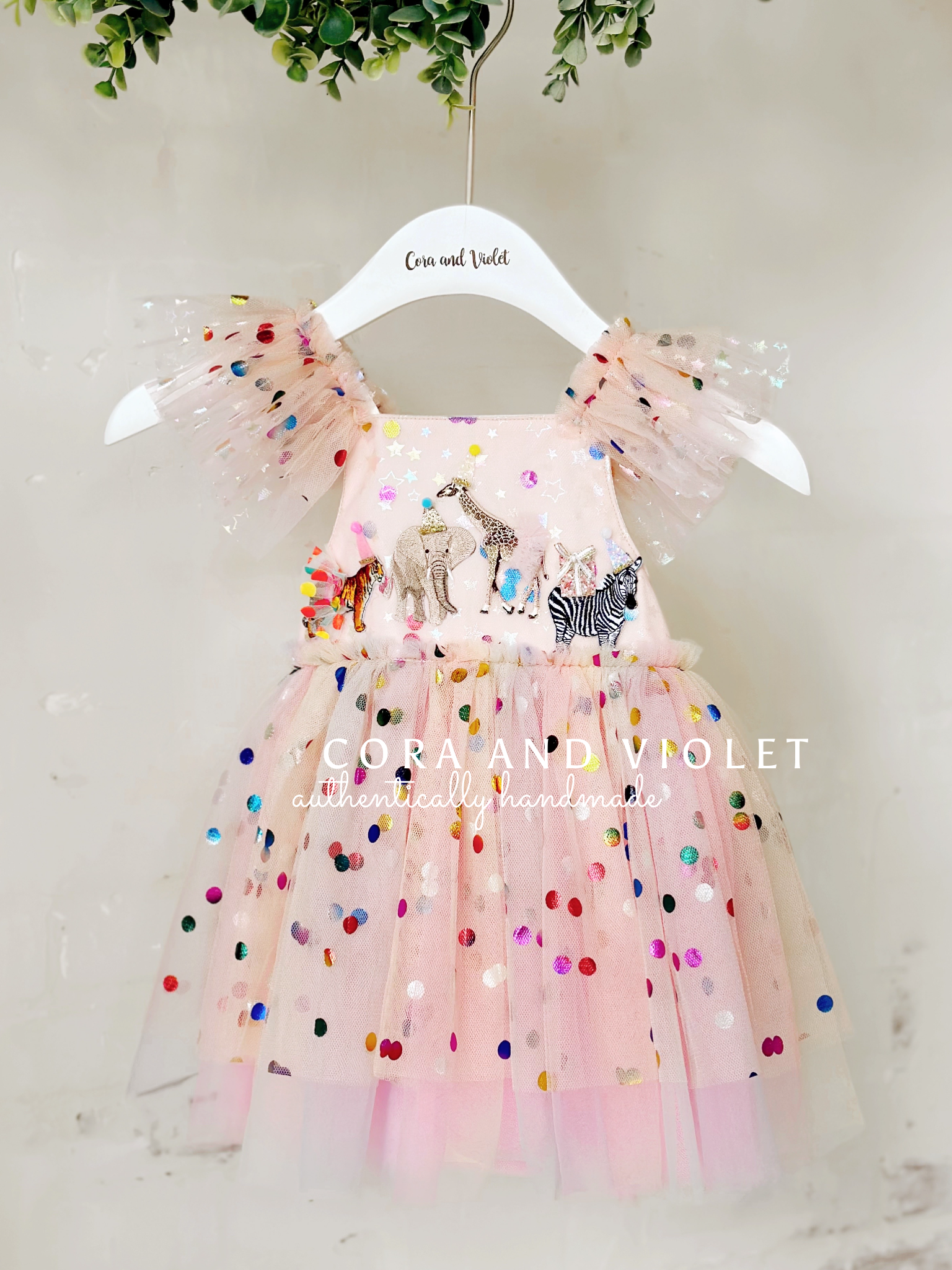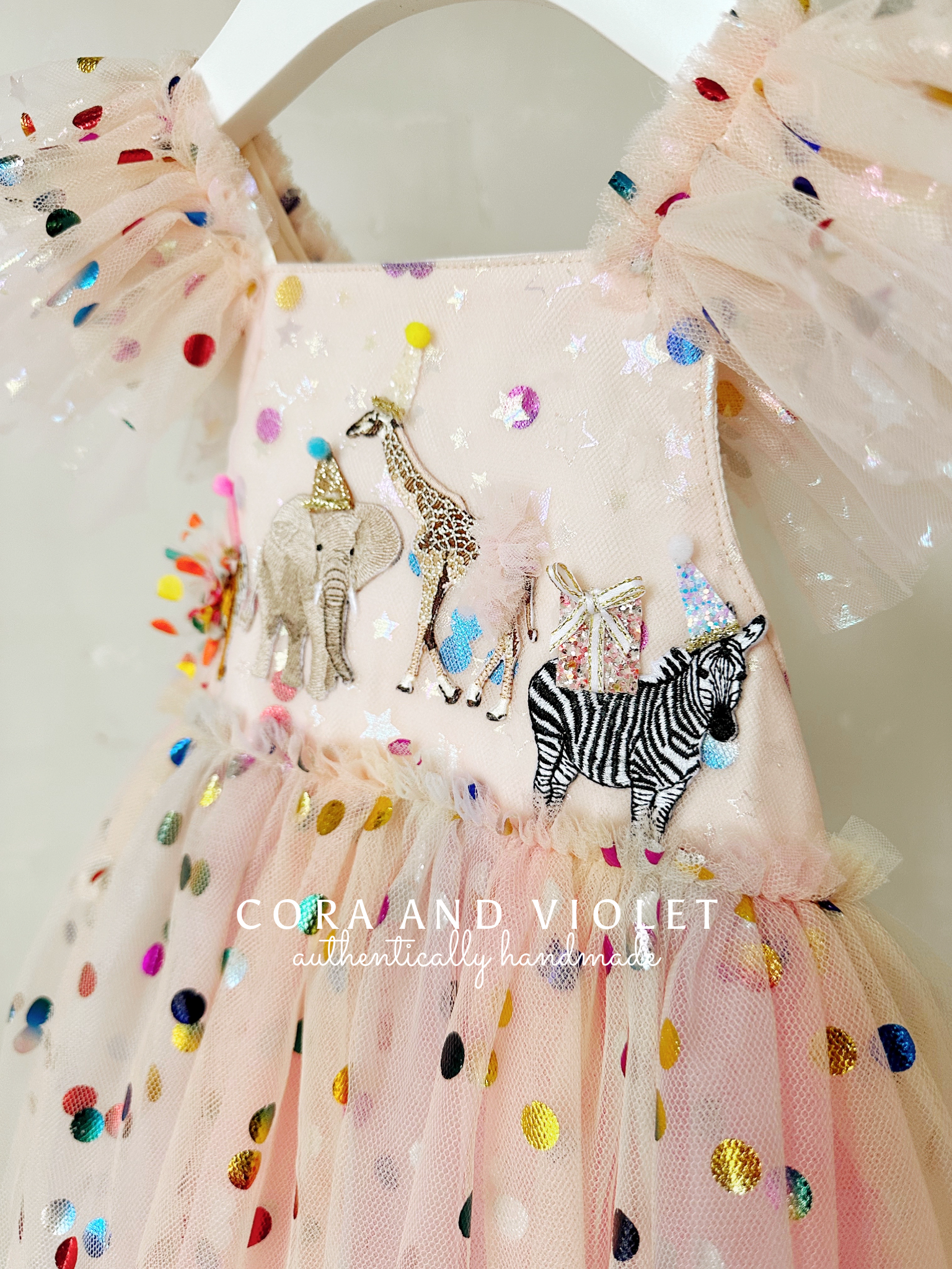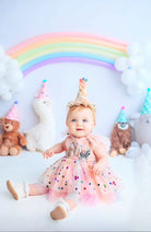 The Design: A masterpiece of playful imagination, The Party Animal dress is designed for the little one who is truly the "soul of the party." This artisan dress features a curated parade of circus animals, each brought to life with my signature handmade touch. Individually cut and sewn miniature party hats and tiny tulle tutus onto the animal motifs, creating a delightful 3D texture that captures the magic of a vintage carnival or "Wild One" celebration.
