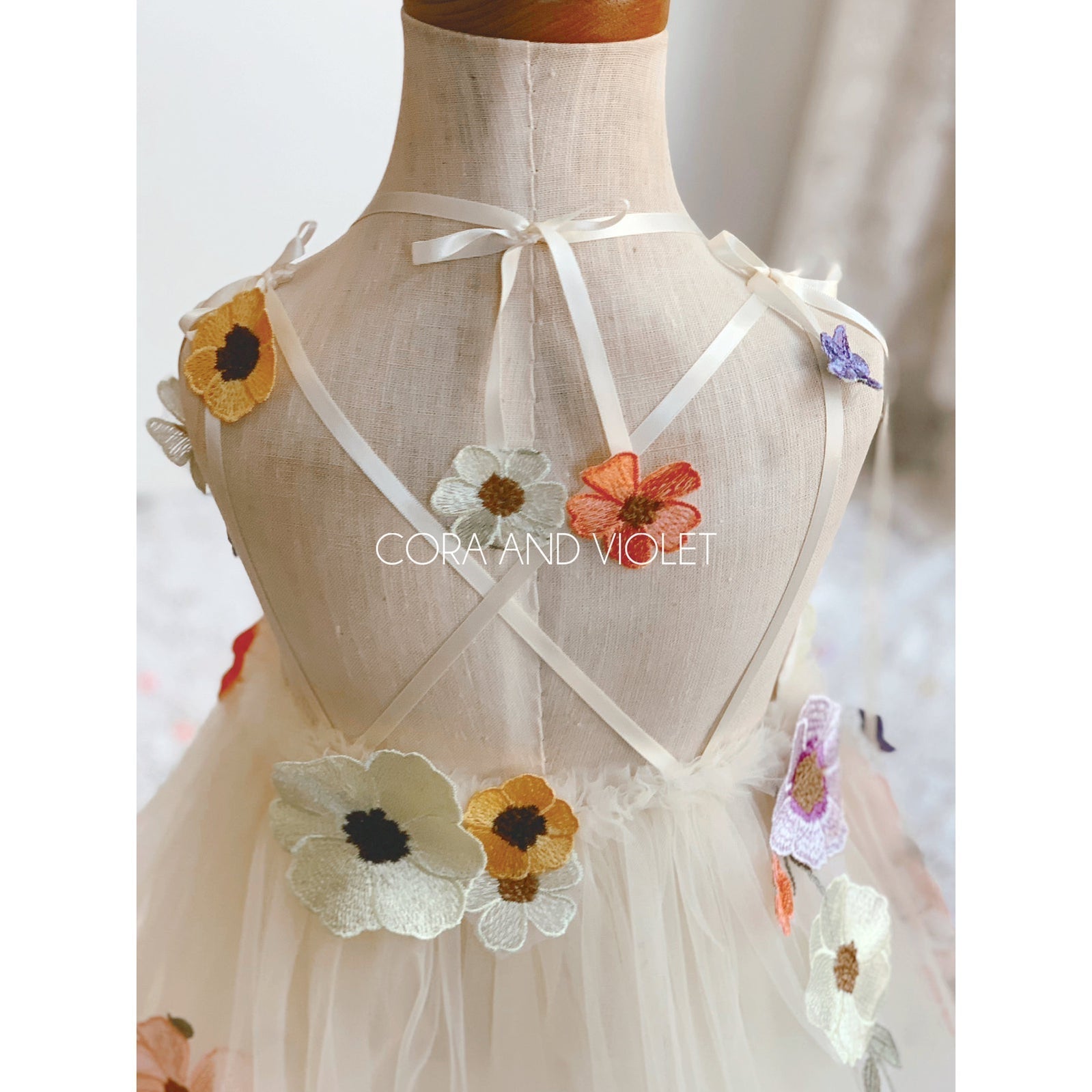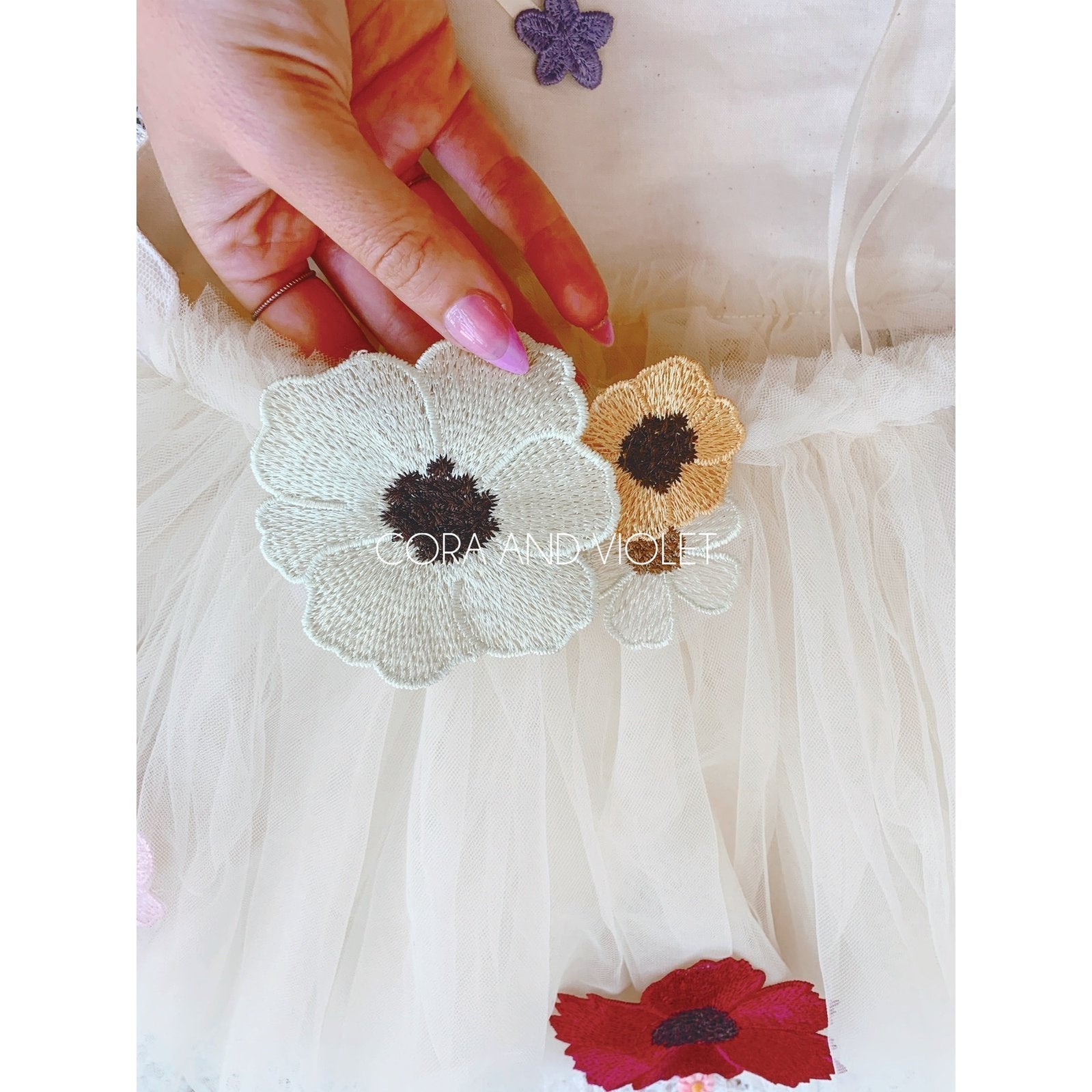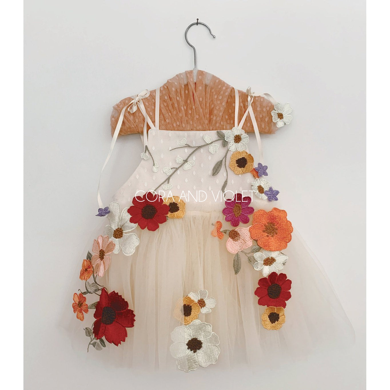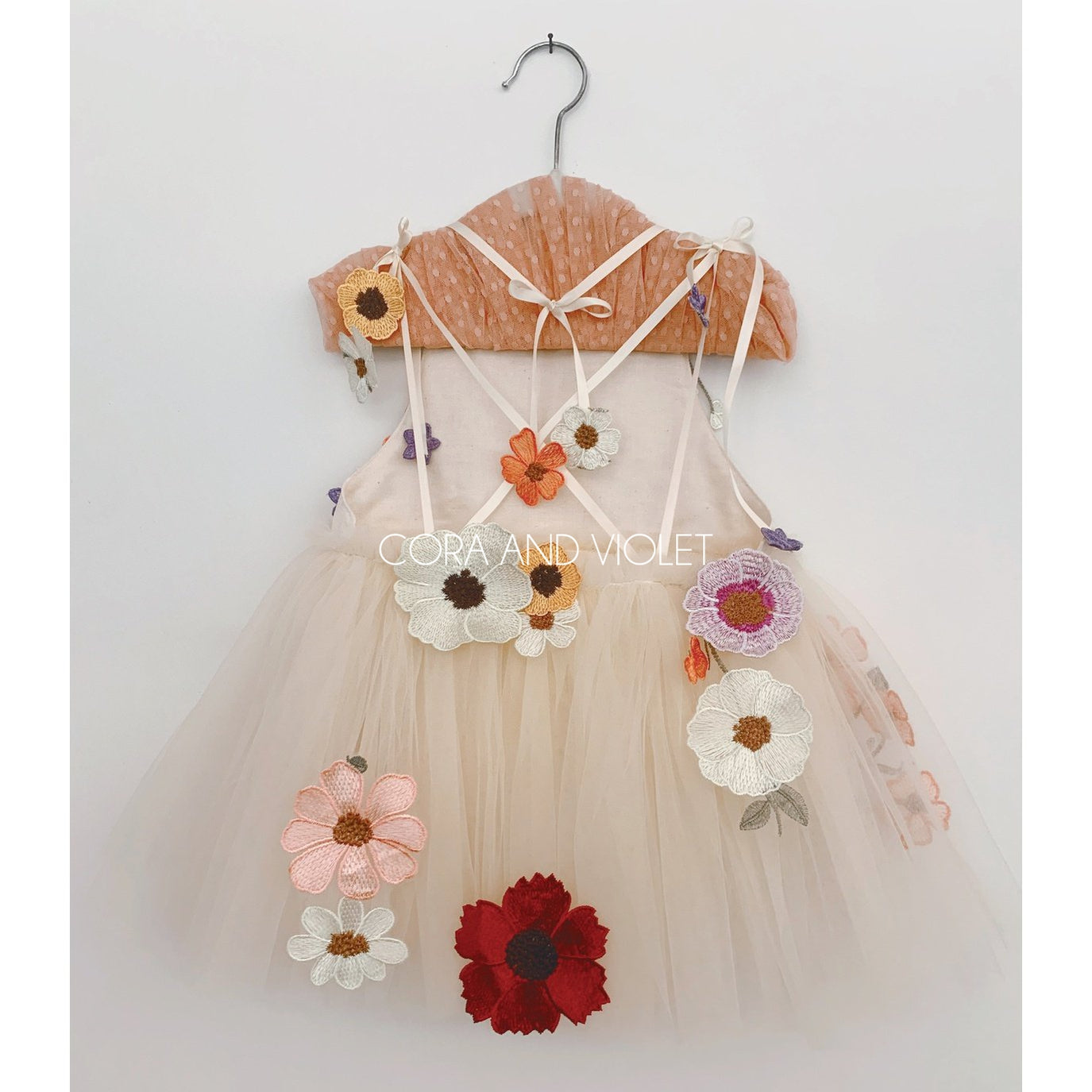 Say hello to this magical delight of embroidered 3d flowers atop layered and ruched creamy tulle. flirting under a delightful bed of daisies with our layers of tulle skirt and a Swiss dot bodice.