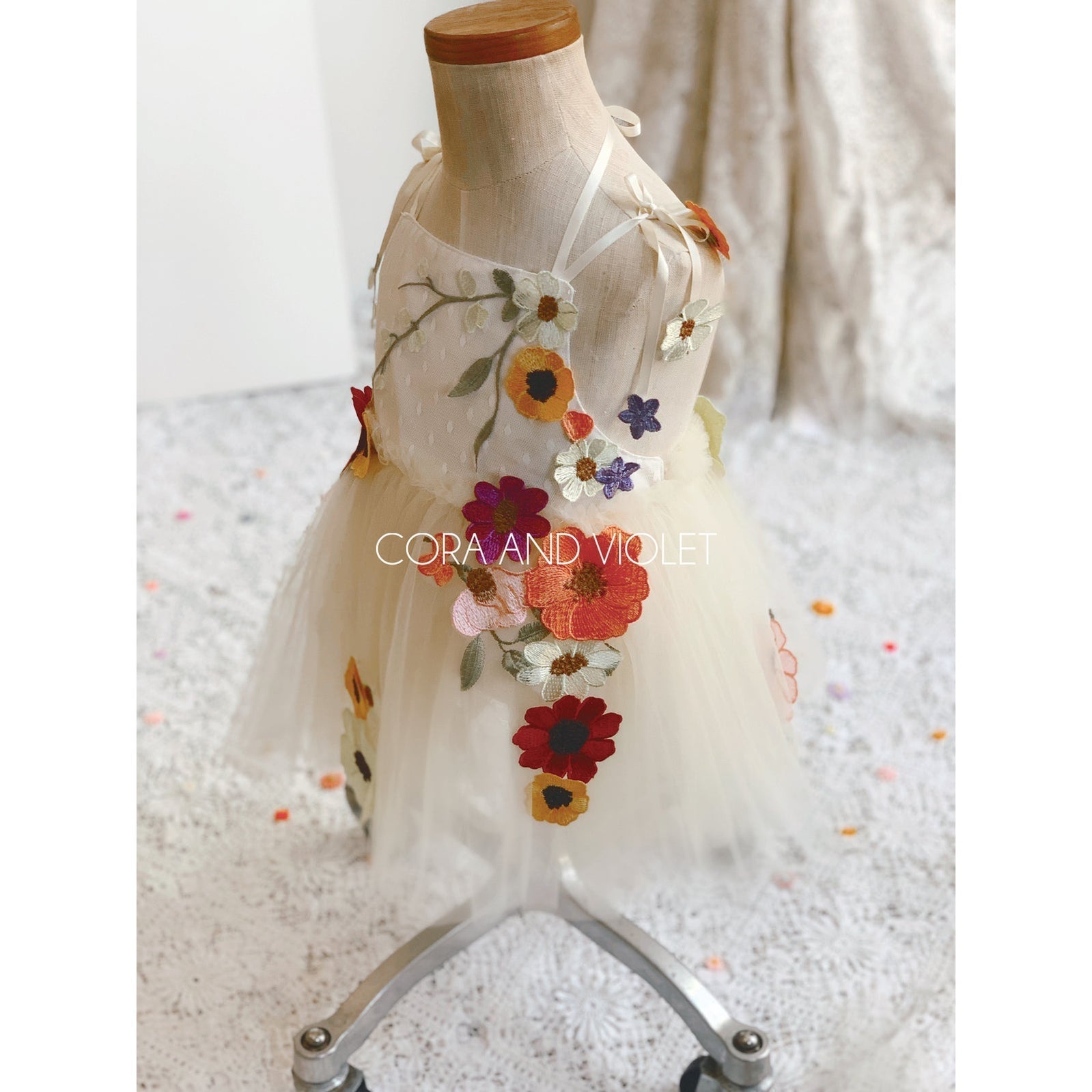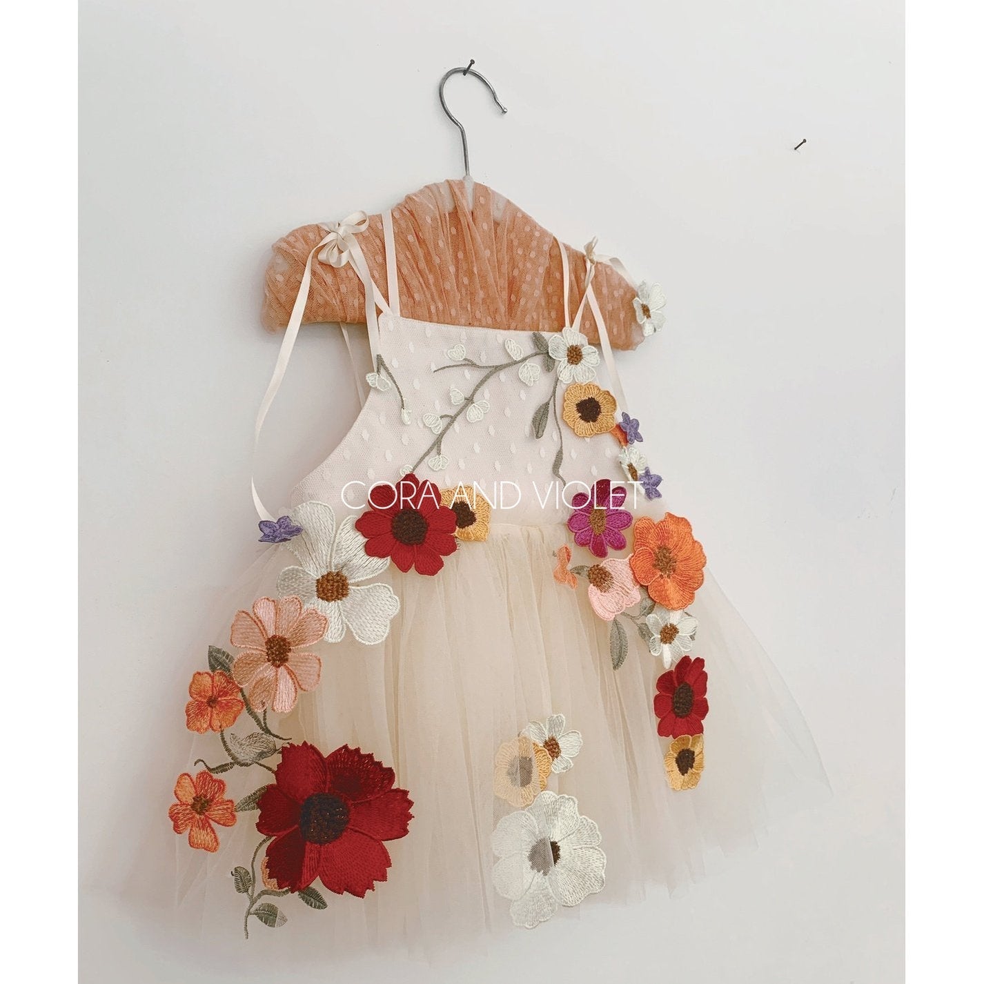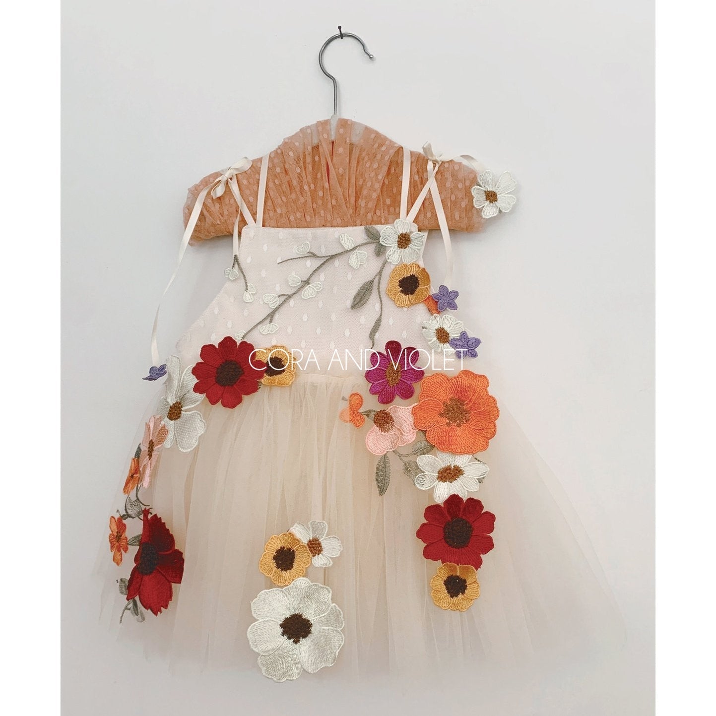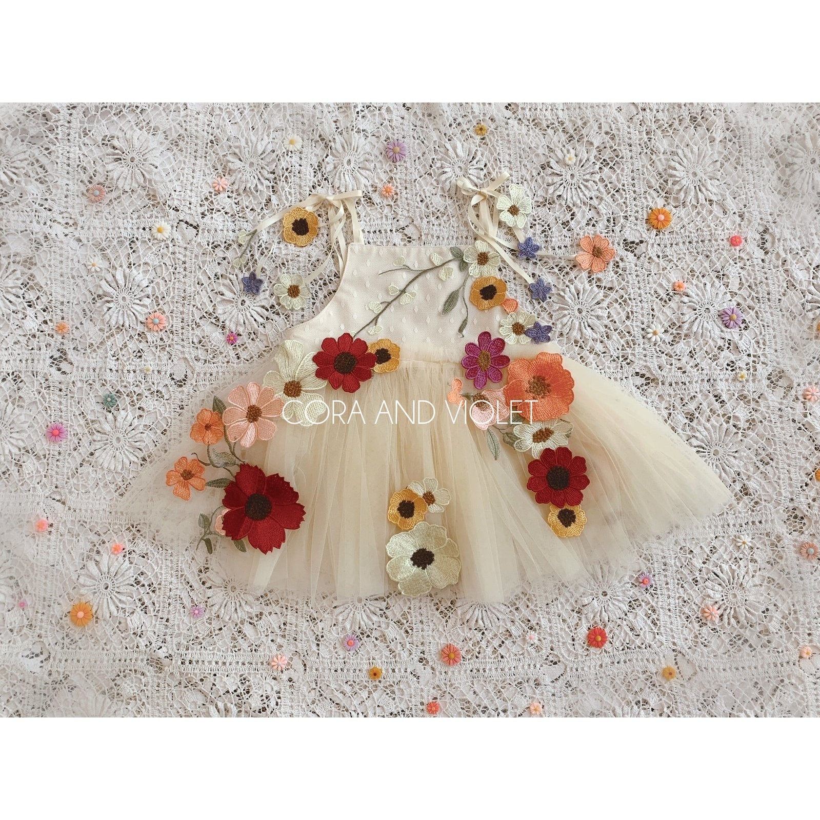 Say hello to this magical delight of embroidered 3d flowers atop layered and ruched creamy tulle. flirting under a delightful bed of daisies with our layers of tulle skirt and a Swiss dot bodice.