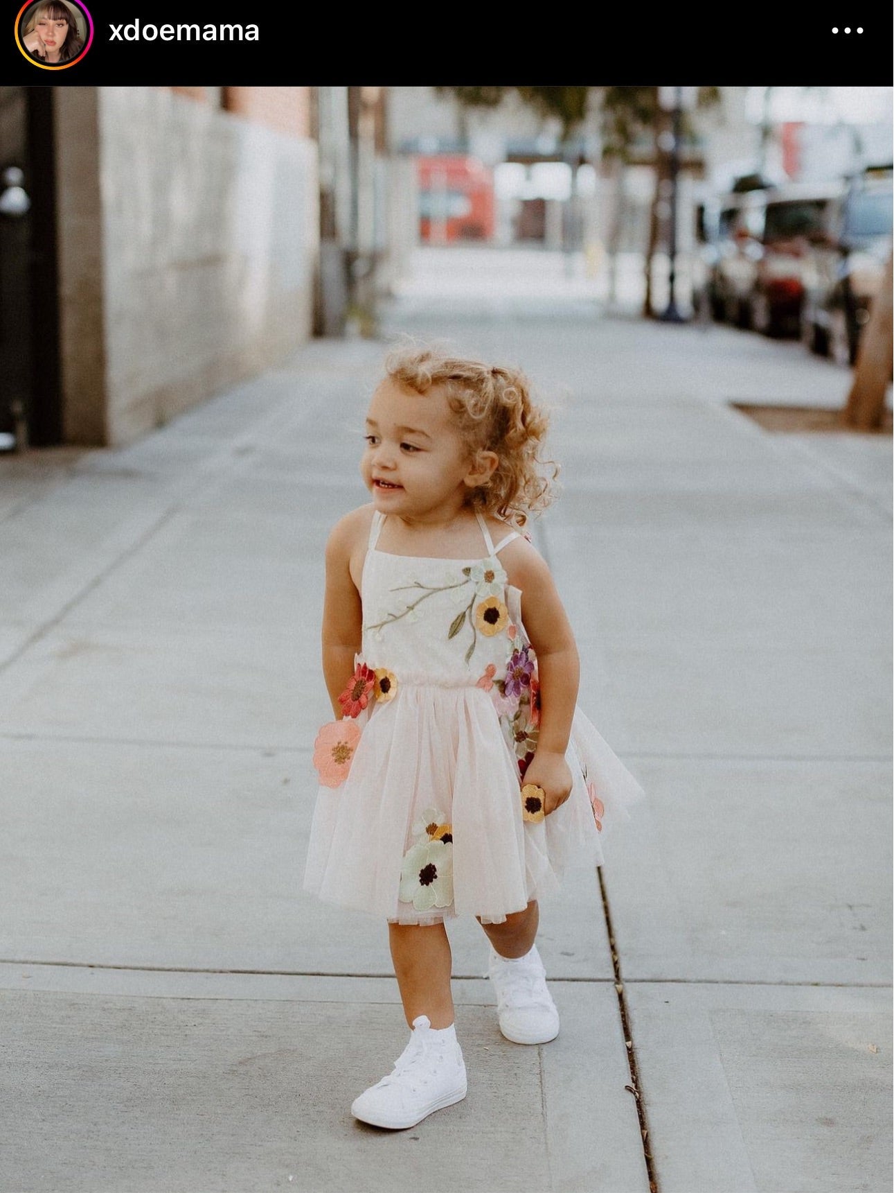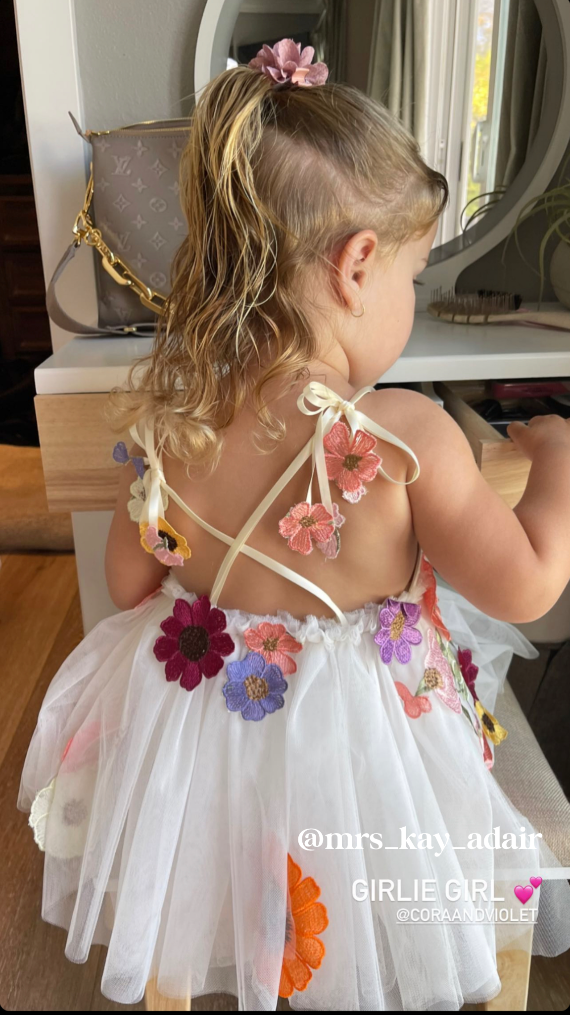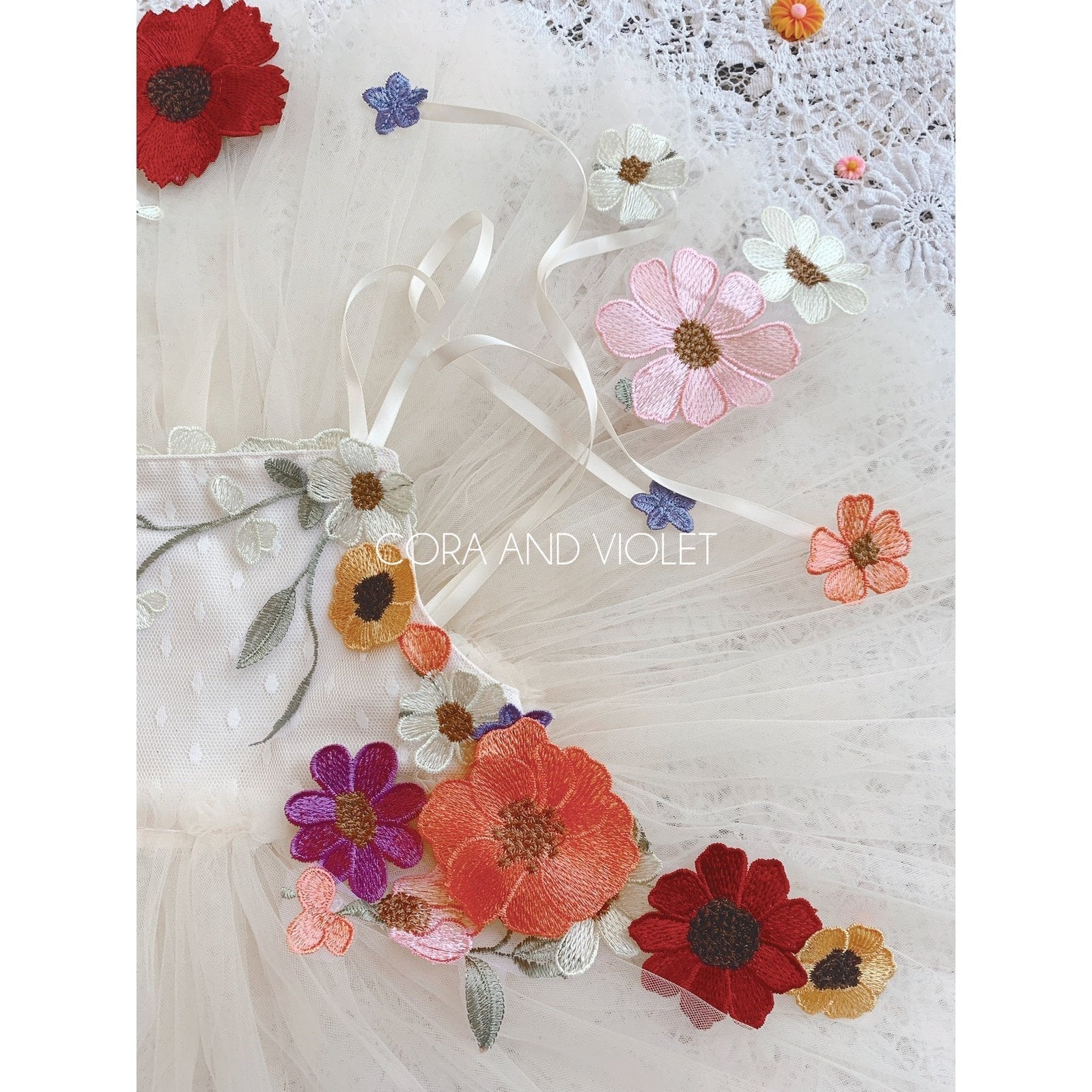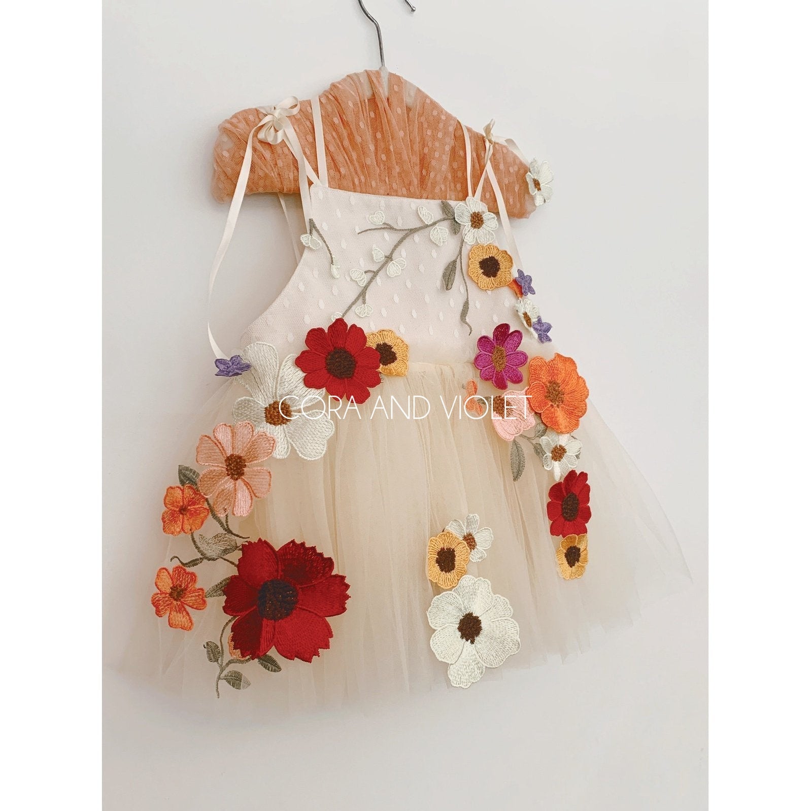 Say hello to this magical delight of embroidered 3d flowers atop layered and ruched creamy tulle. flirting under a delightful bed of daisies with our layers of tulle skirt and a Swiss dot bodice.