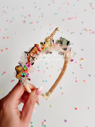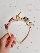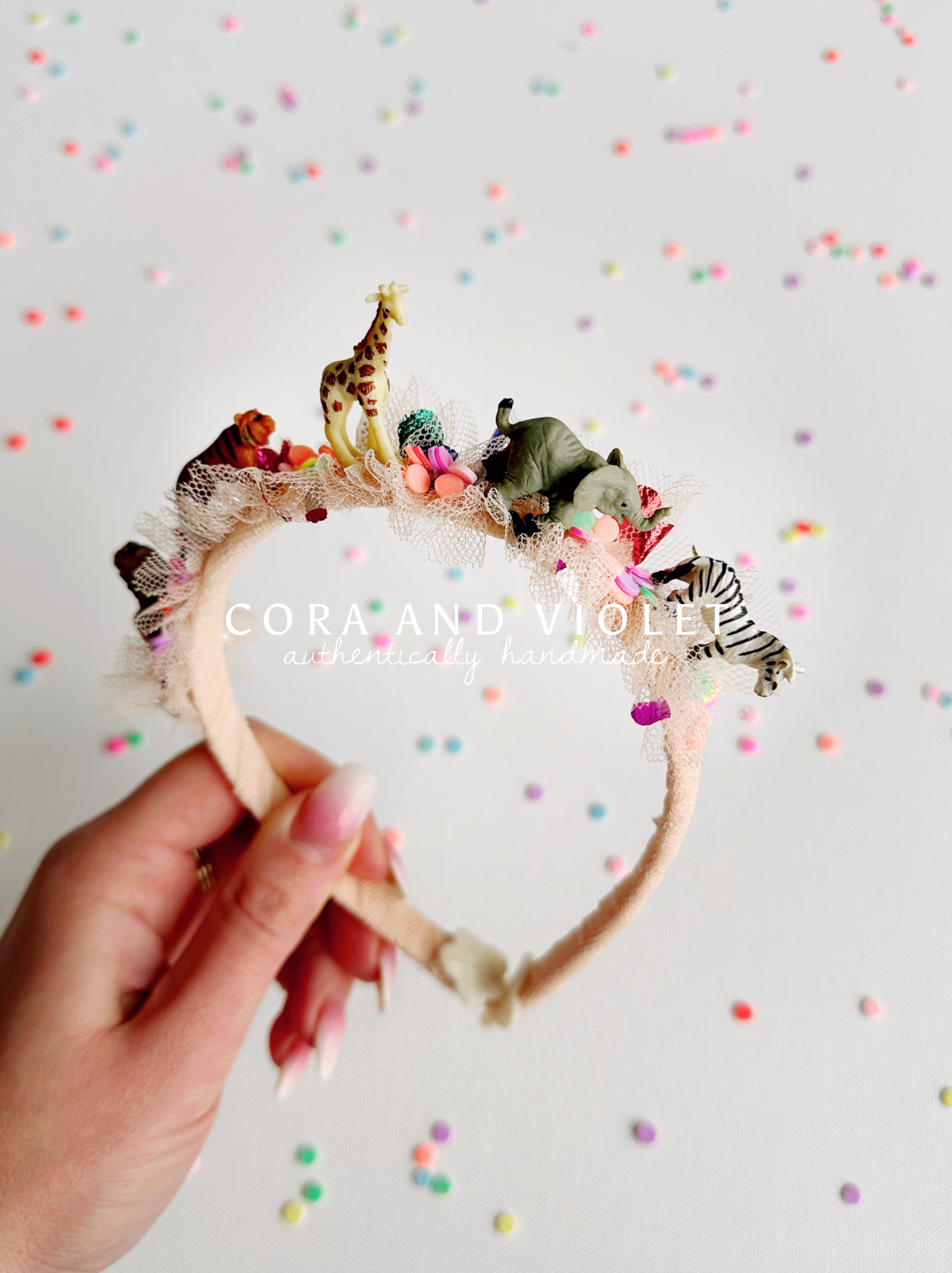 Stylish and comfortable, tulle lined headband with soft felt grips behind the ears. Ruffled confetti and the cutest mini parade of animals on a bed of soft confetti.