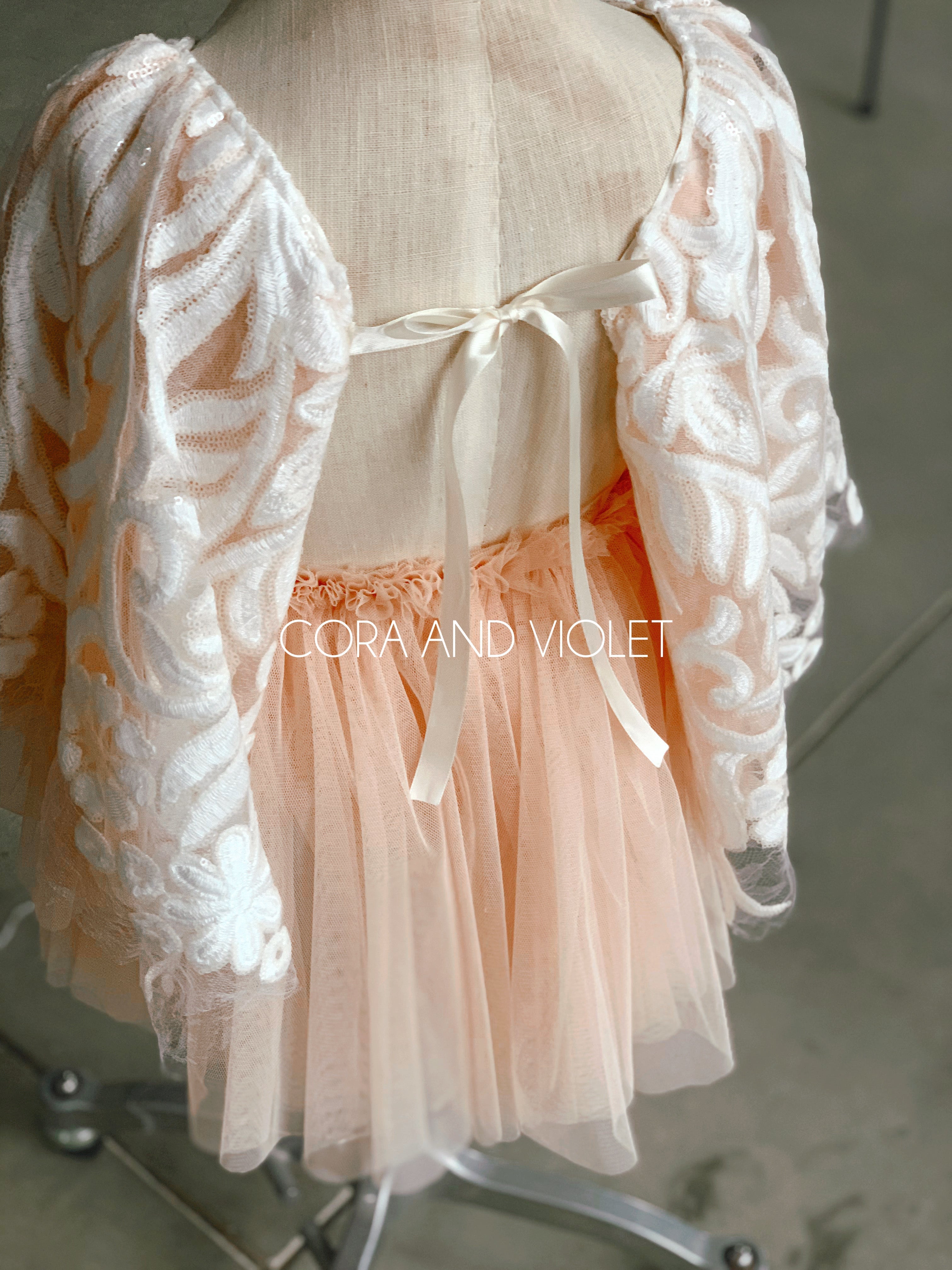 Full billowing sleeves cascade down the shoulders and are secured in the back with a delicate satin bow.