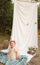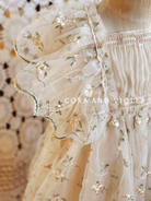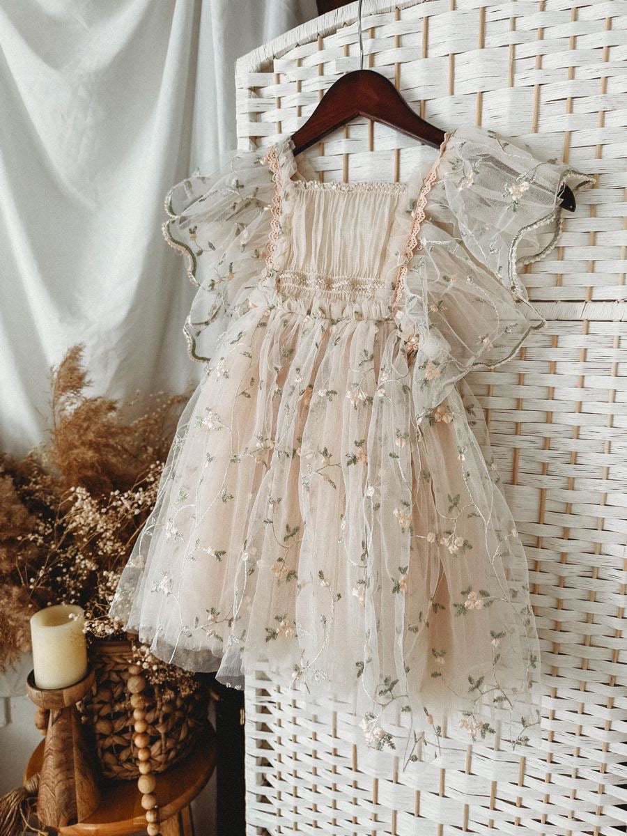 Say hello to this spring delight of embroidered flowers atop layered beige and cream tulle. flirting under a delightful bed of embroidered pale blush and gold flower buds.