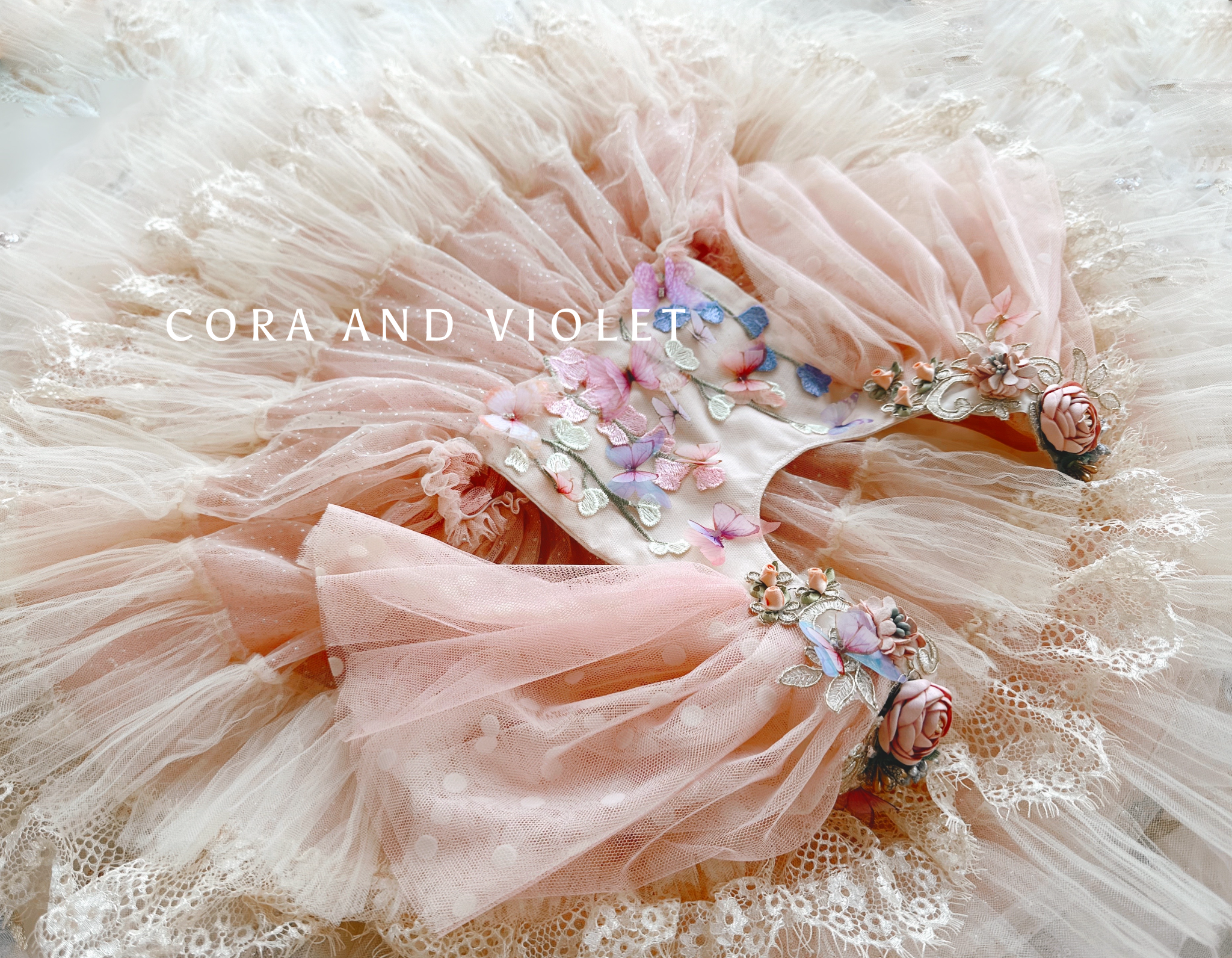 Say hello to this spring delight of embroidered flowers atop layered blush and cream tulle, flirting under a delightful bed of lavender, wildflowers and butterflies cresting over the adorned sleeves.