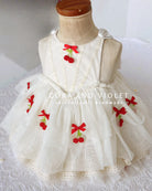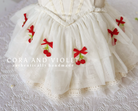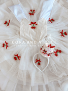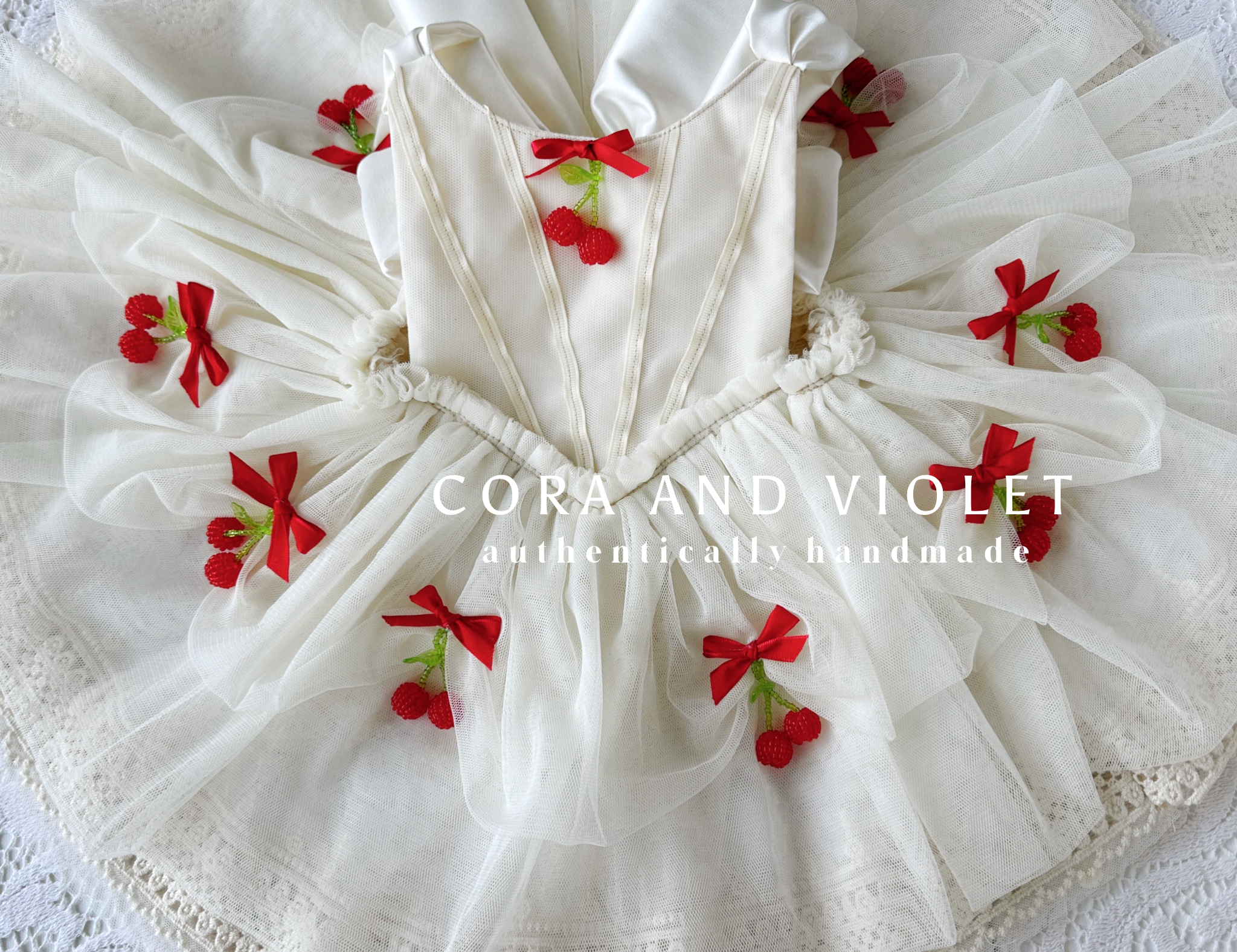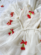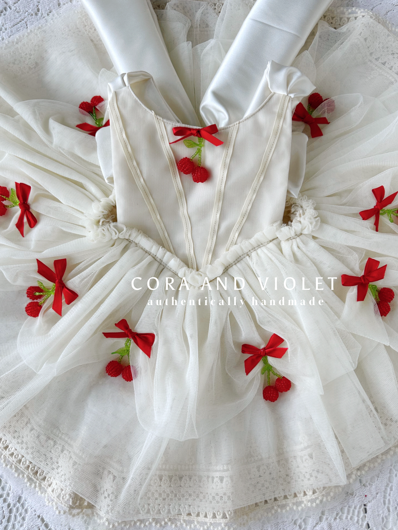layers of soft tulle ruched for a full skirt. Ruched scallops gathered by hand sewn bows and hand beaded cherries.