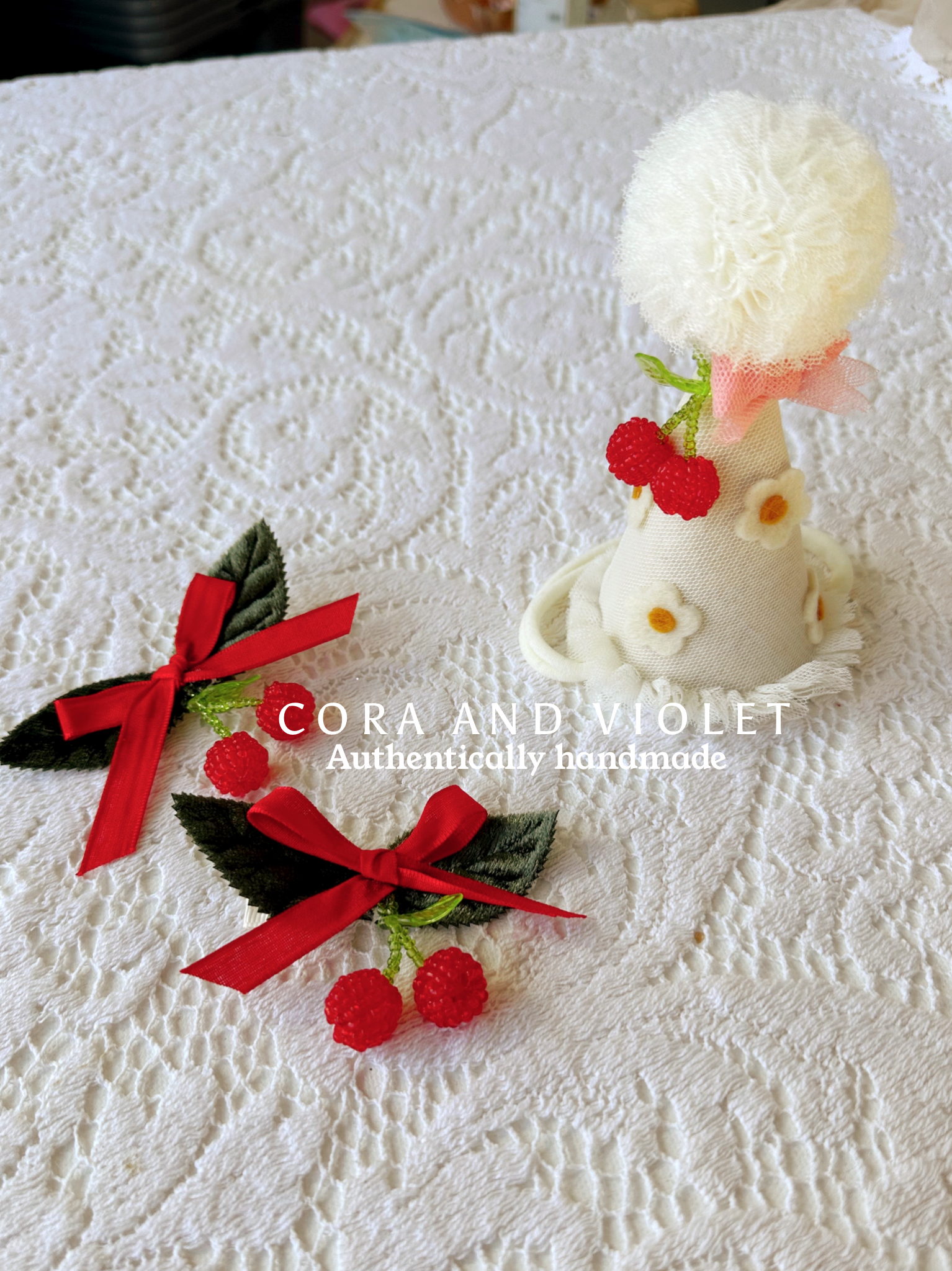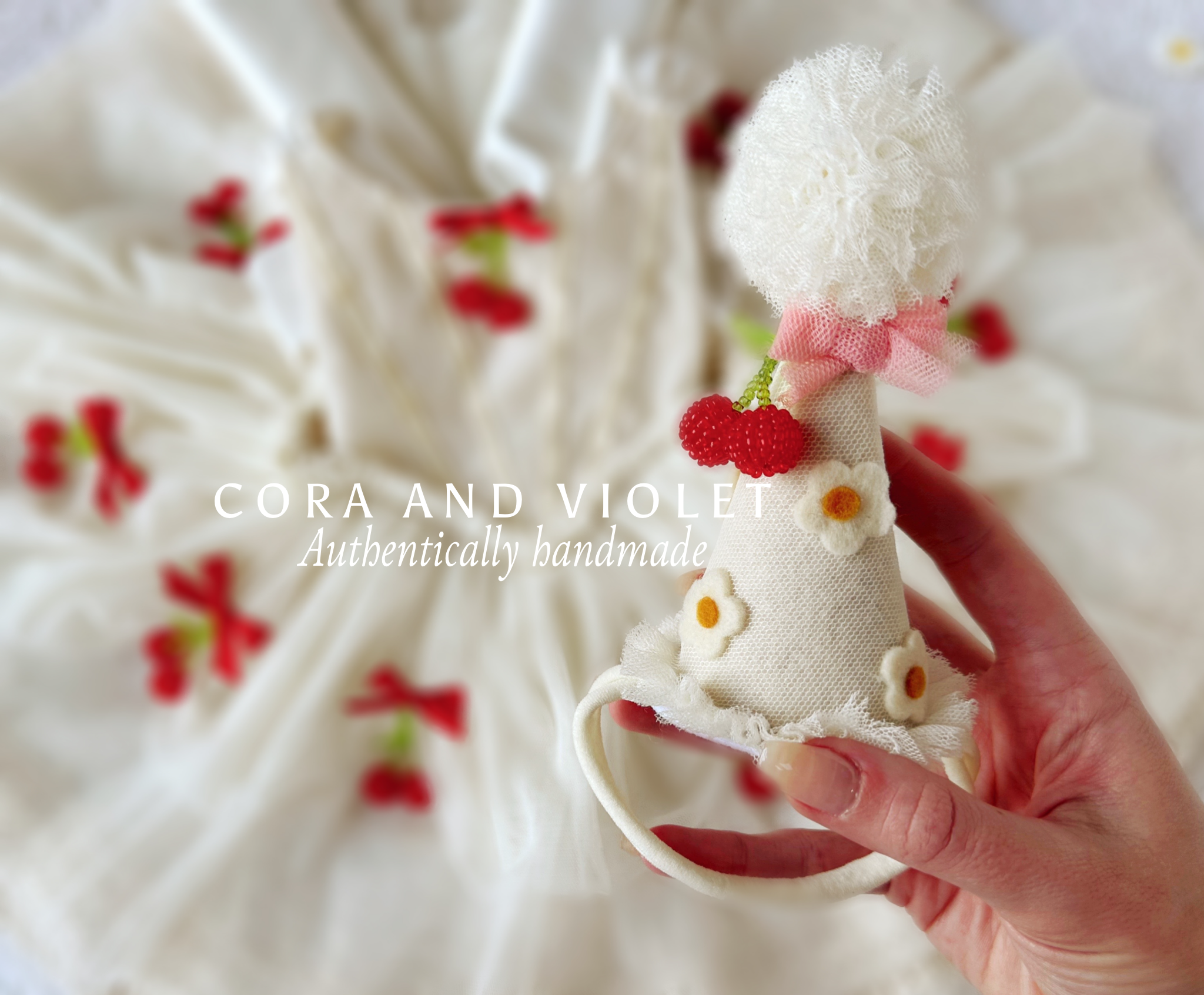 soft tulle and structured hat. Individually hand made flowers are placed below a pink hand tied bow. Hand beaded cherries under a soft full pom. TOO CUTE!