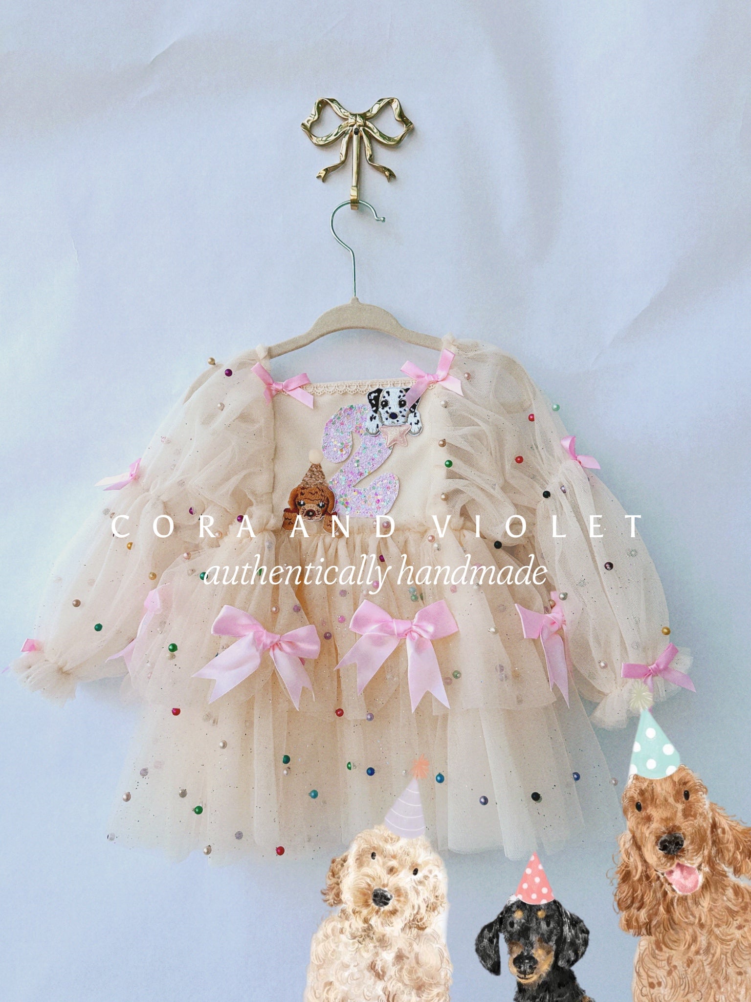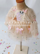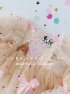 • Fluttering Whimsy: silk bows and delicate, pastel pearls and glitter “float" across cascading layers of premium tulle, dancing with every giggle and twirl.