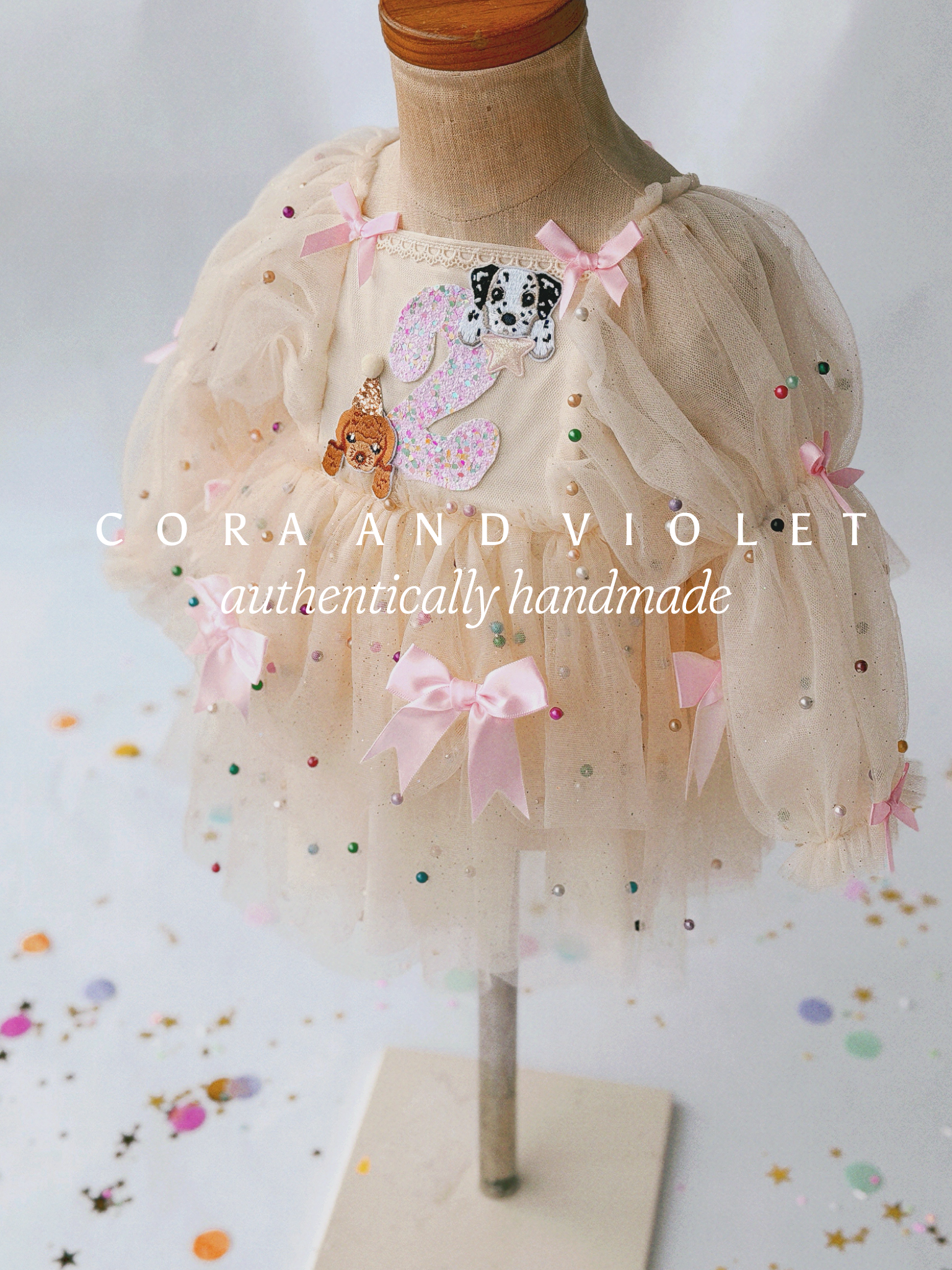 • Textured Artistry: Featuring artisanal embroidered puppy dogs and intricate ruching, every puppy-inspired element is hand-placed to ensure your piece is a one-of-a-kind original.