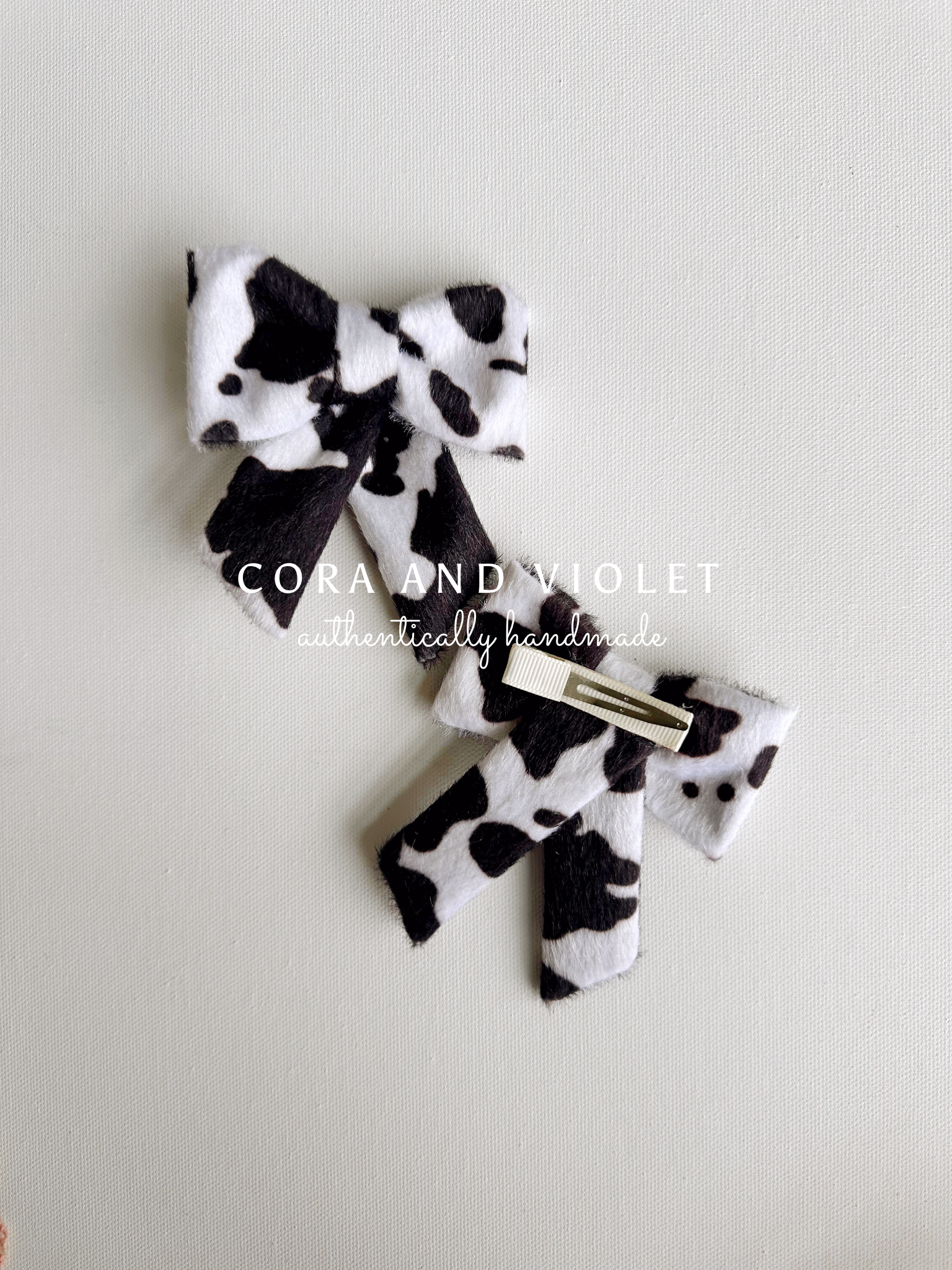 the cutest bows, faux cow hide soft canvas, satin lined clips. sold as a set of two.