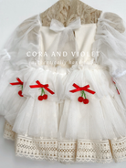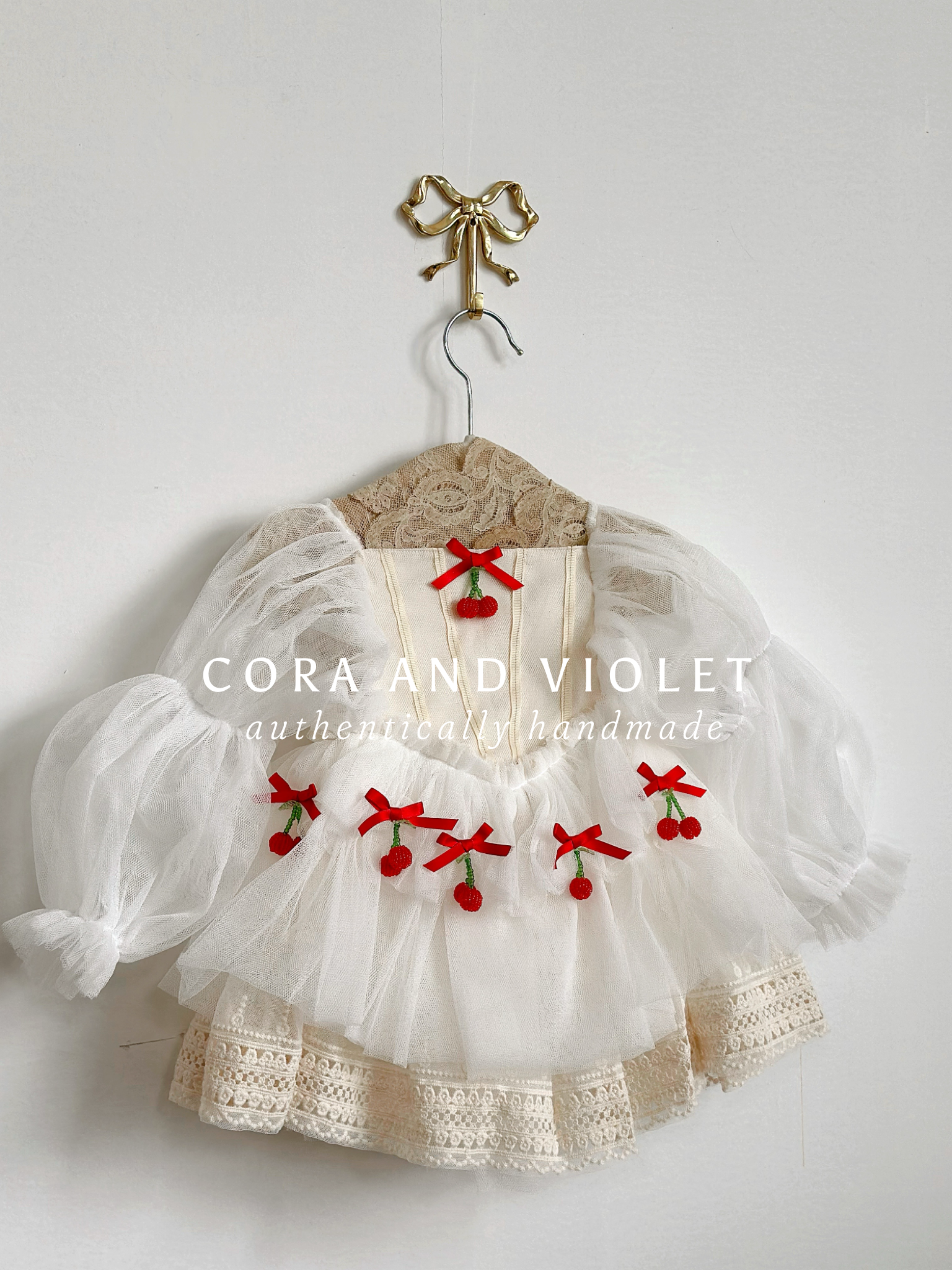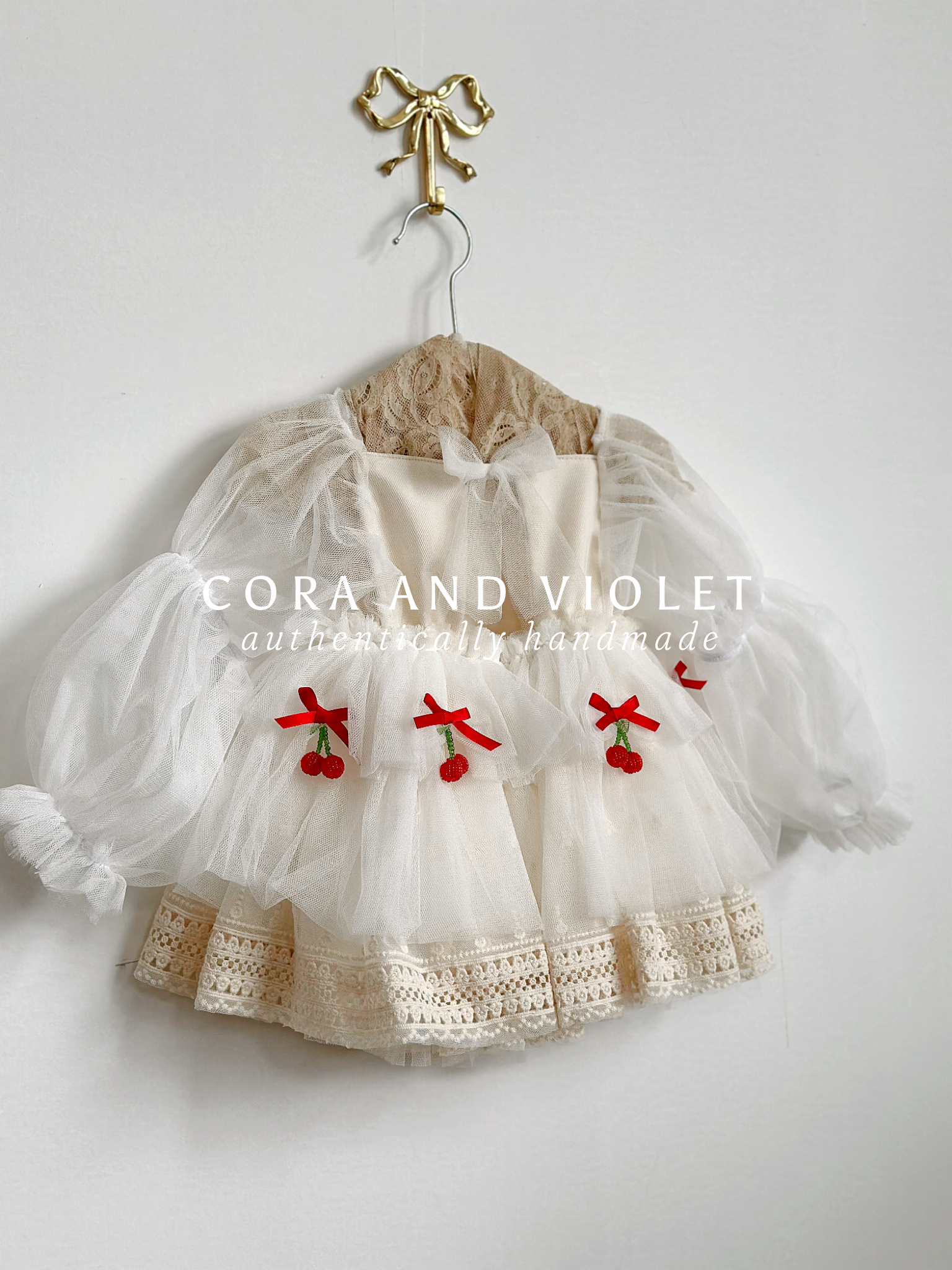 layers of soft tulle ruched for a full skirt. Ruched scallops gathered by hand sewn bows and hand beaded cherries.