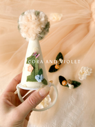 Made from a soft felt and tulle base, raised velvet polka dots.