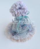 Individually placed 3D butterflies atop a pale blue ruffled lace. hand-stitched pom, made from a few dozen layers of handspun yarn.