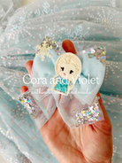 Atop a soft bed of blue hand-gathered and glitter adorned- a satin-lined alligator clip.