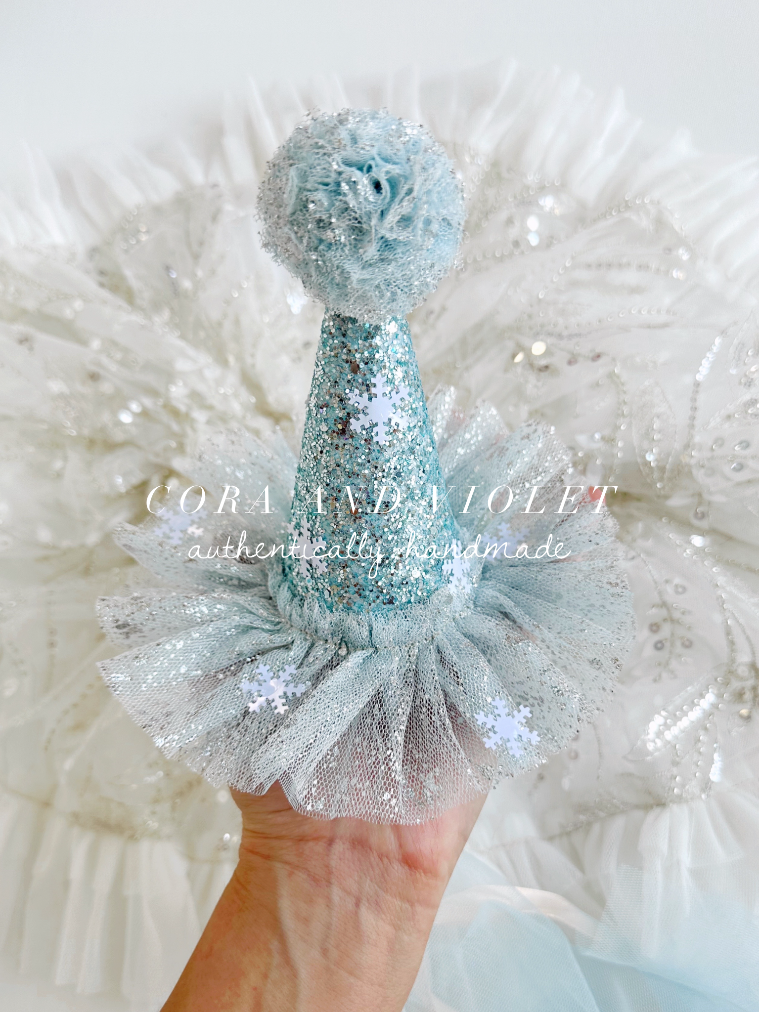 Hand-placed snowflakes, sequins for a sweet flair, soft fit! hand-stitched pom, made from a few dozen layers of mixed tulle and fibers.