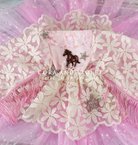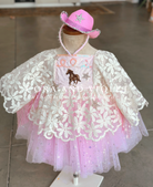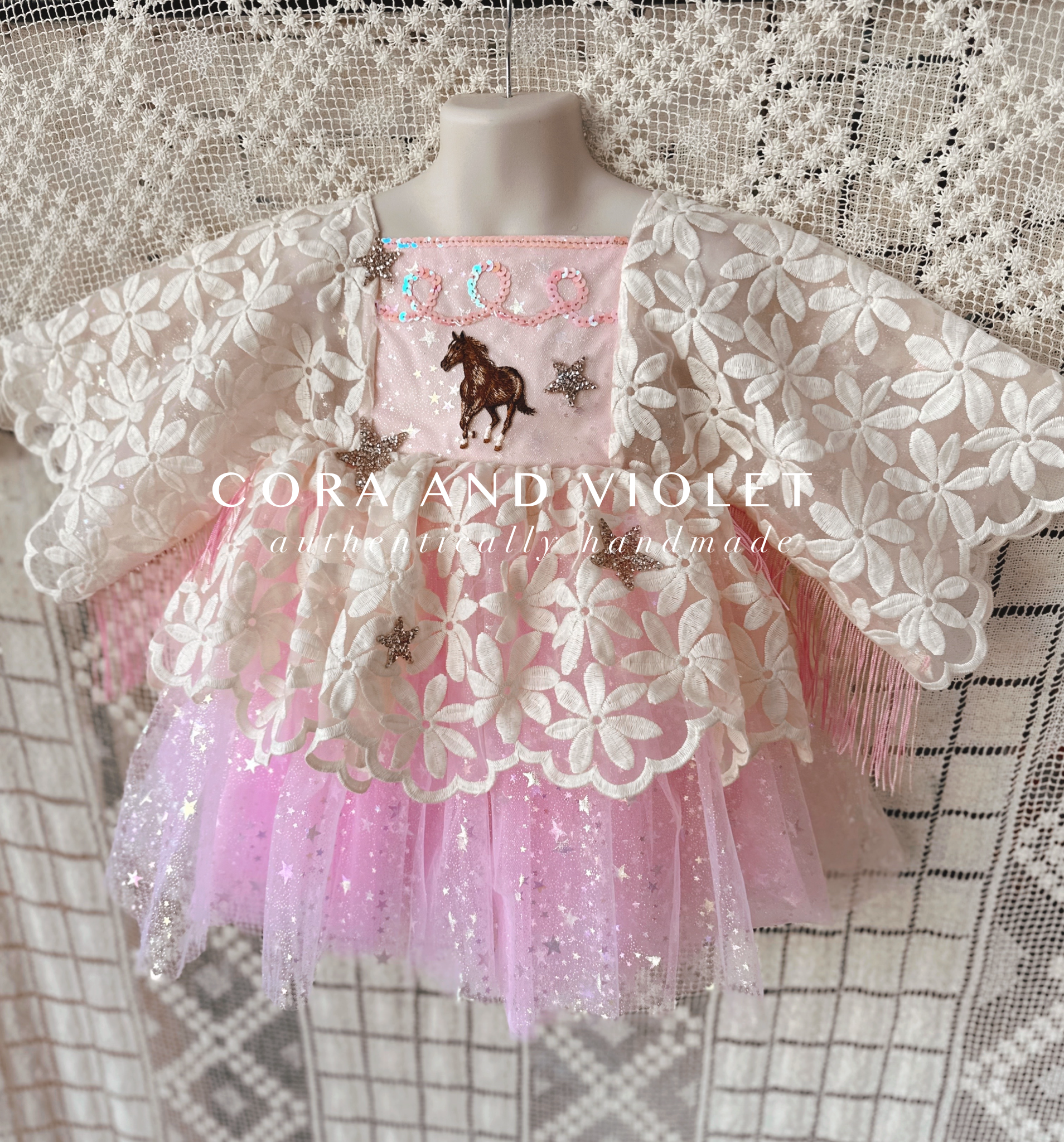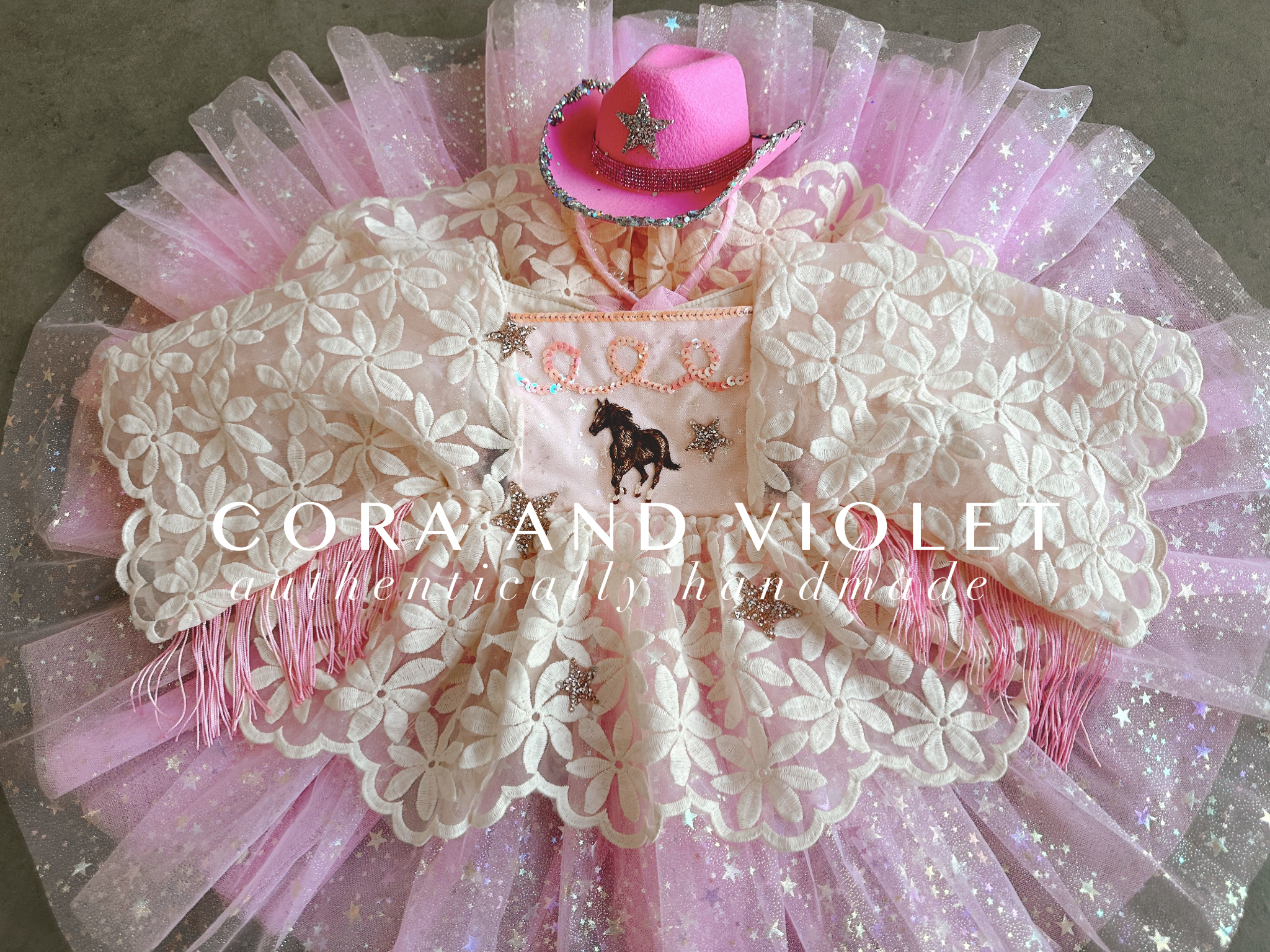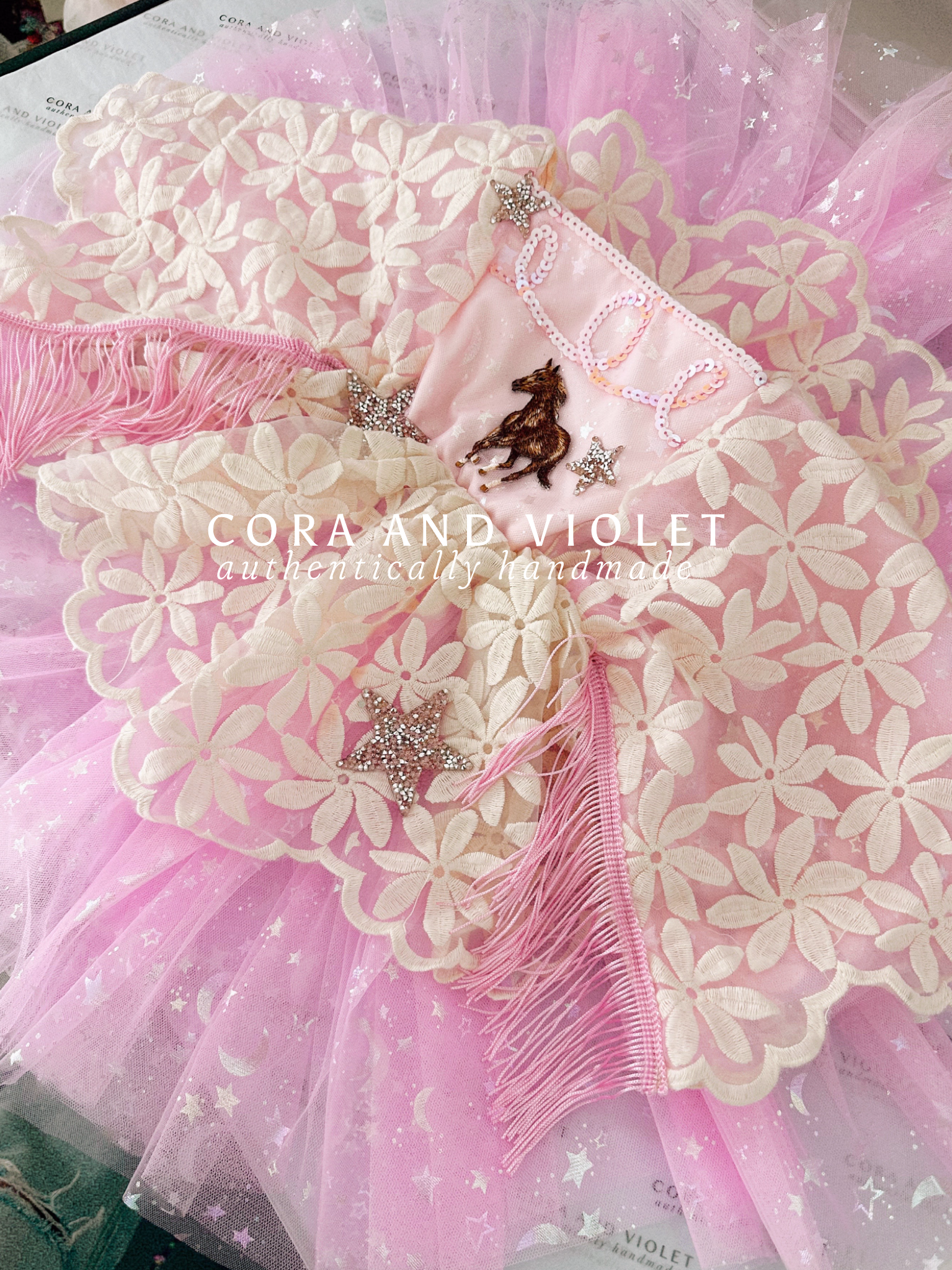 Why we Love her: layers of soft pink with iridescent stars. My personal favorite touch is the pink tassel trimmed sleeves, scalloped embroidery edge & the pink sequins shaped as a western lasso - Fit for your country cutie.  Functionally cute!