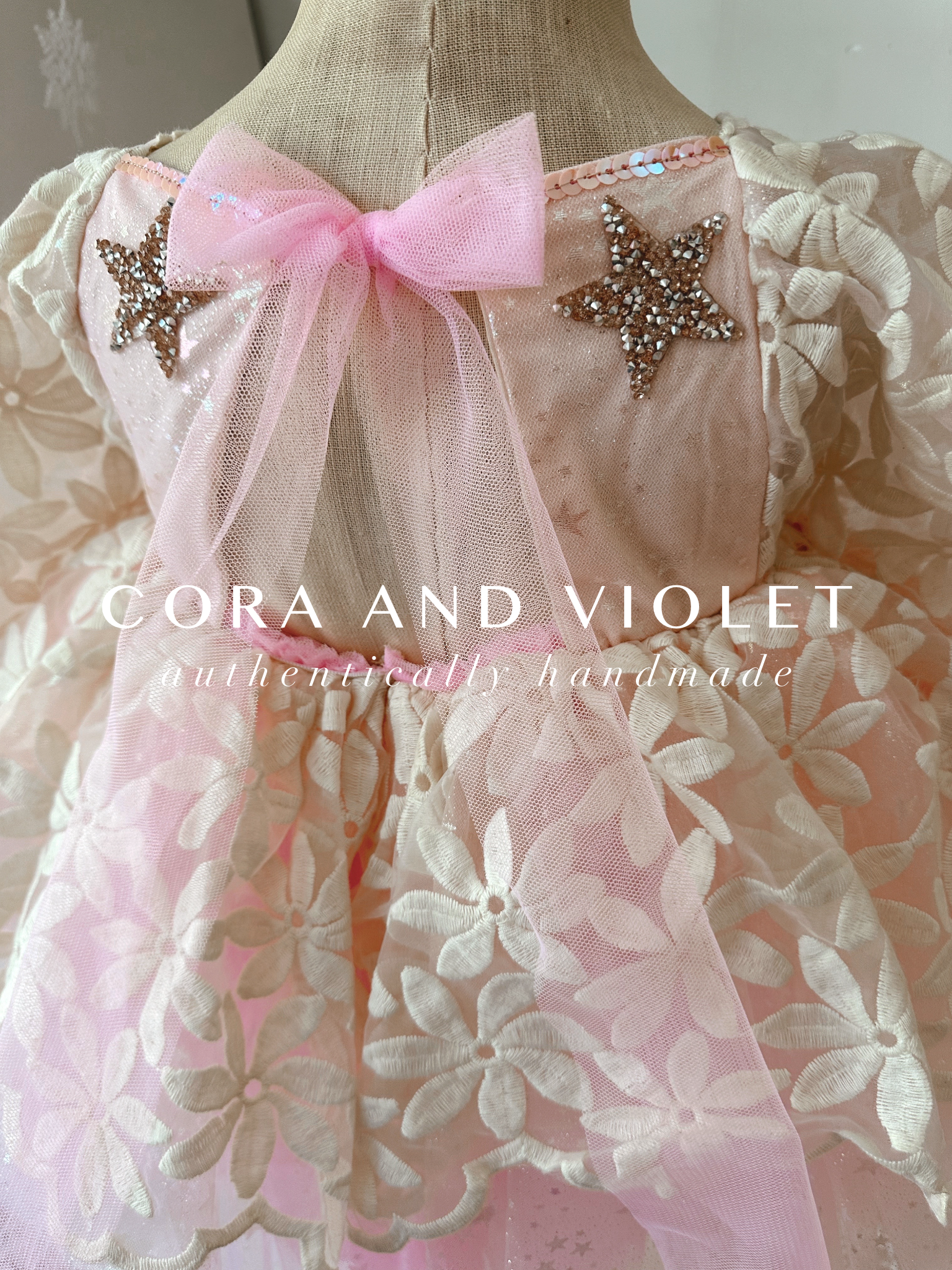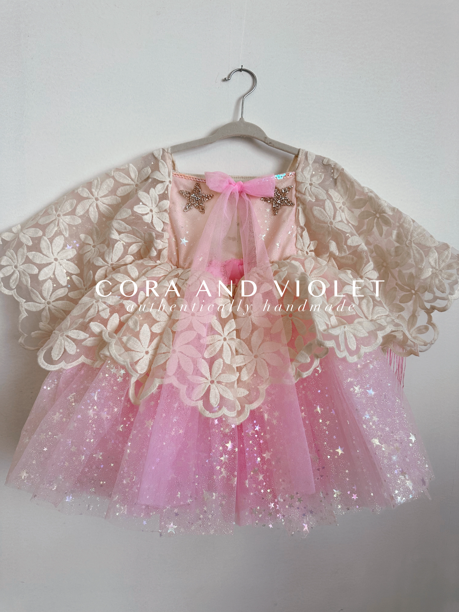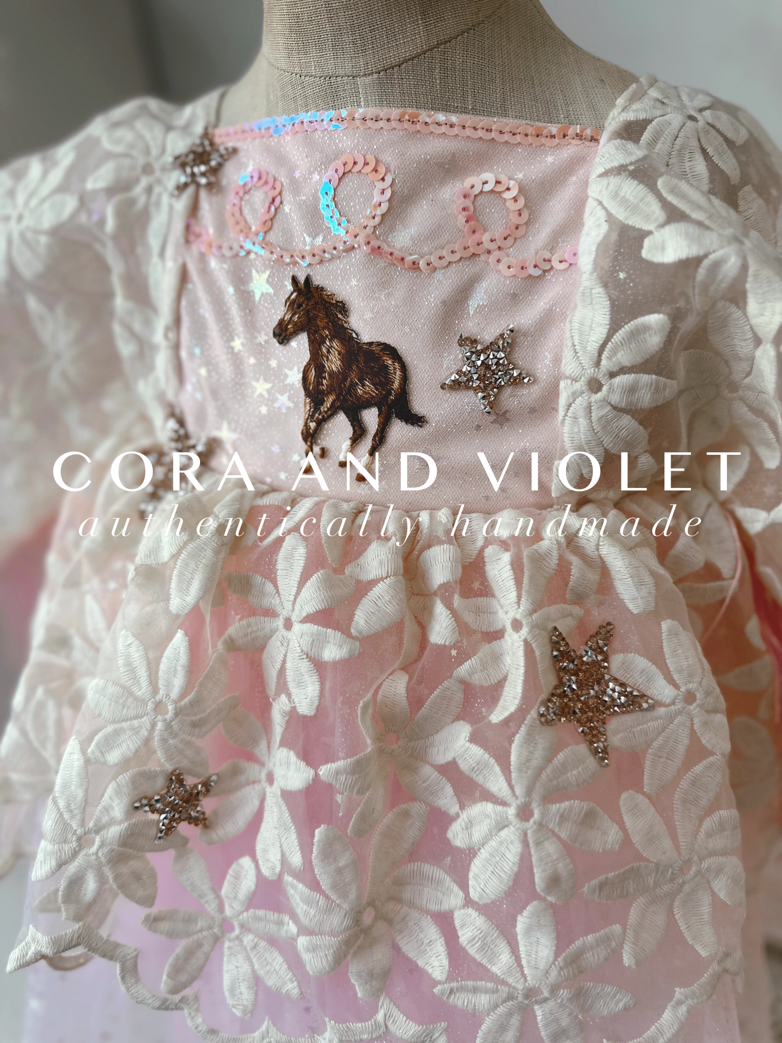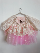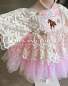 Why we Love her: layers of soft pink with iridescent stars. My personal favorite touch is the pink tassel trimmed sleeves, scalloped embroidery edge & the pink sequins shaped as a western lasso - Fit for your country cutie.  Functionally cute!