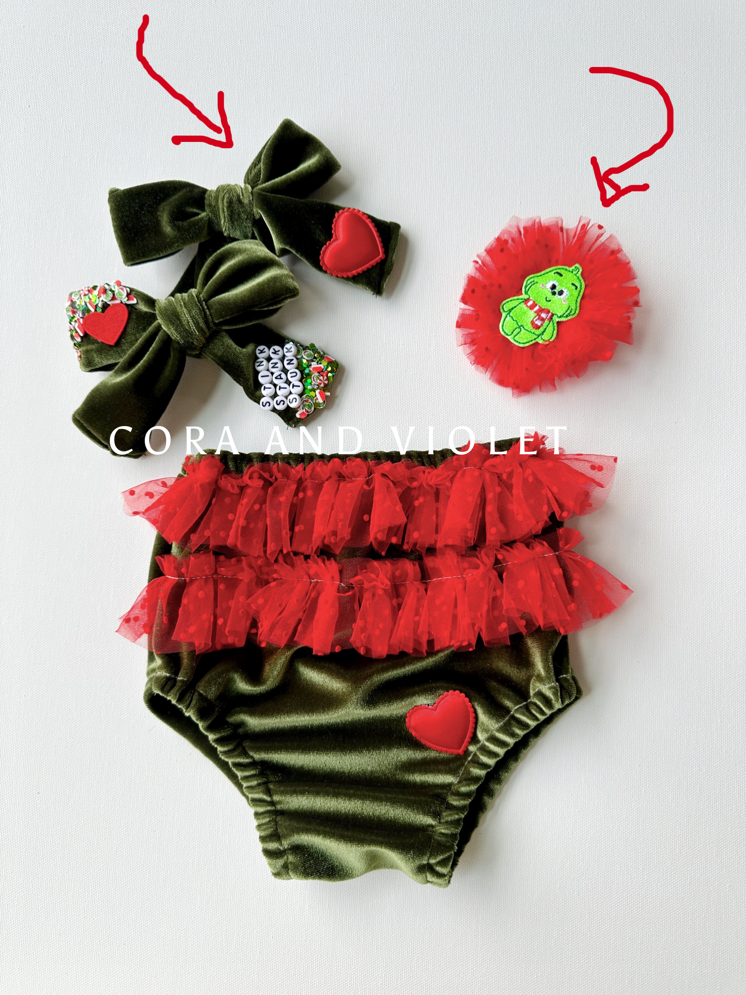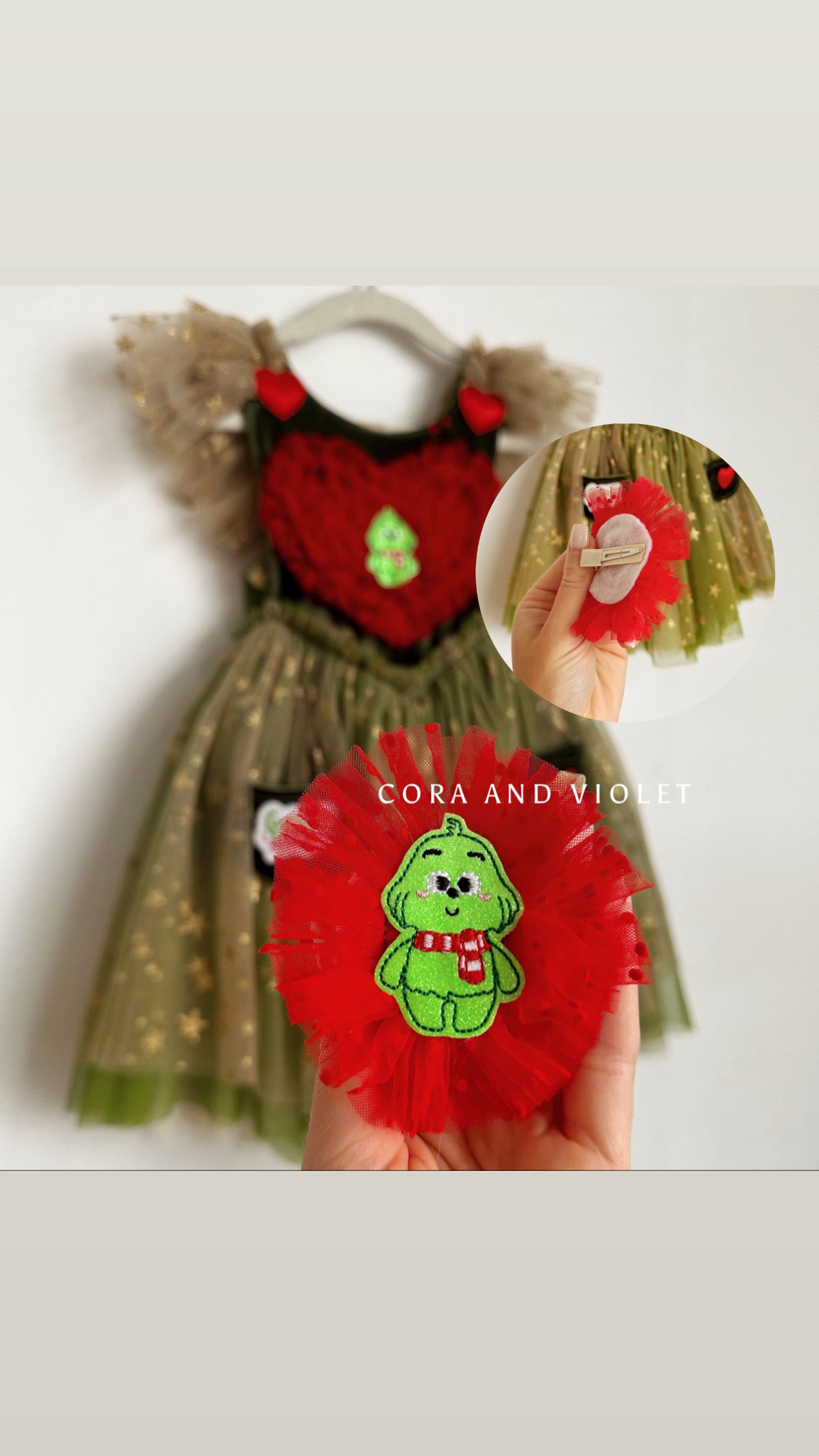Approximately 4x5” for the bow and 3" for the lil'grinch clip