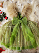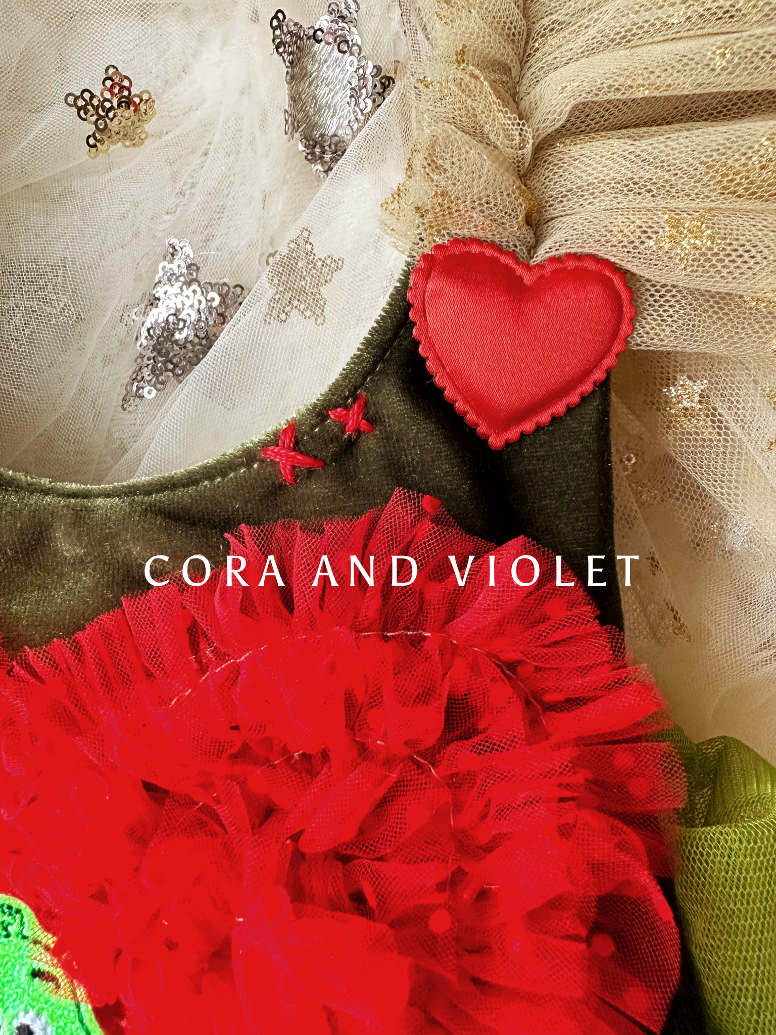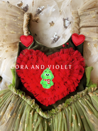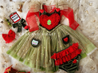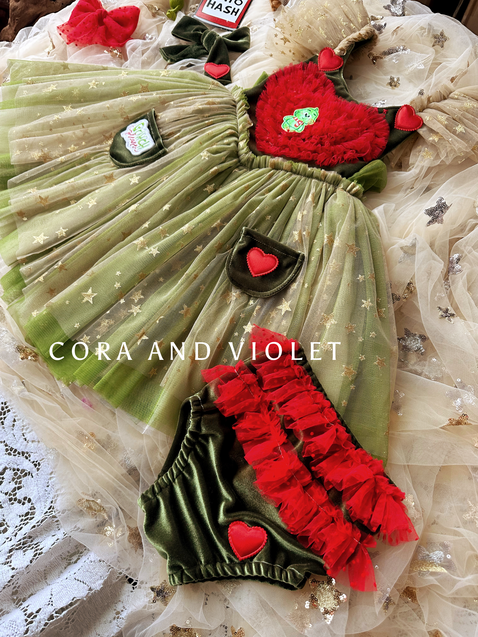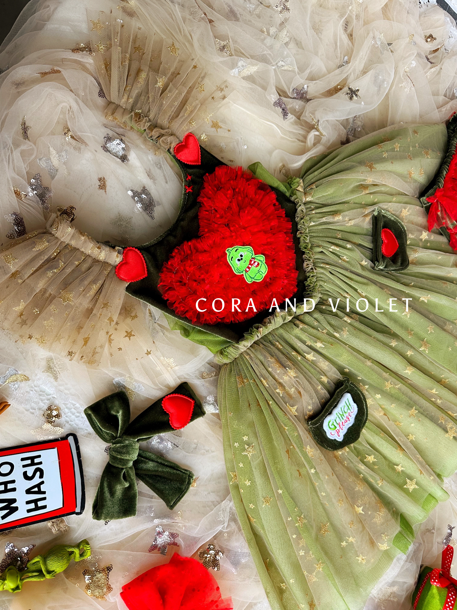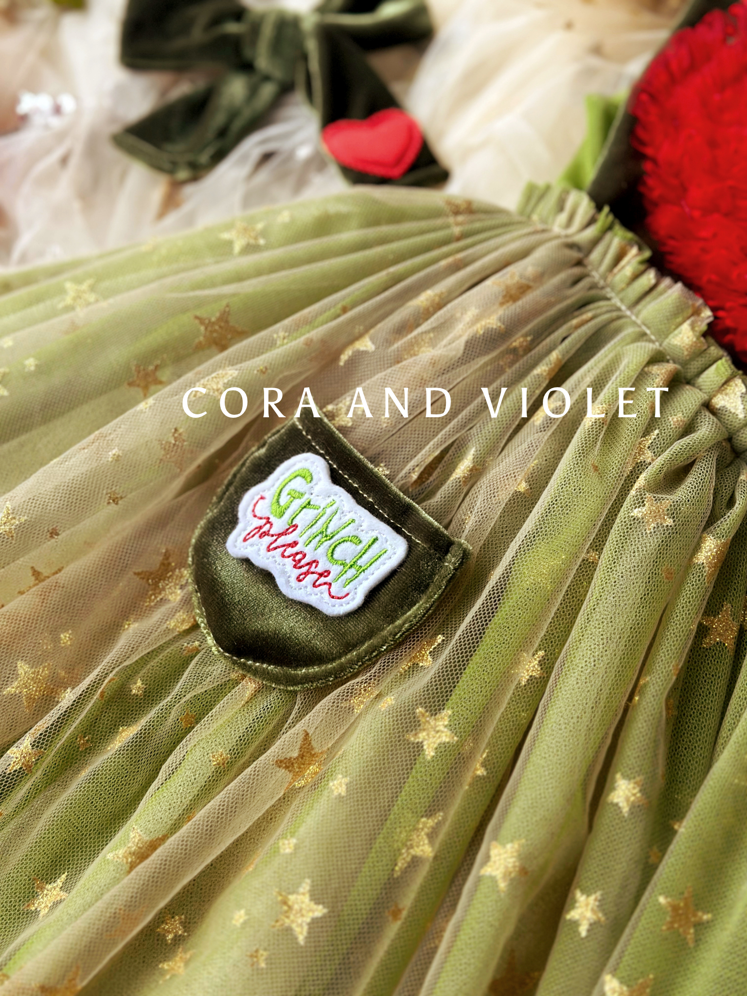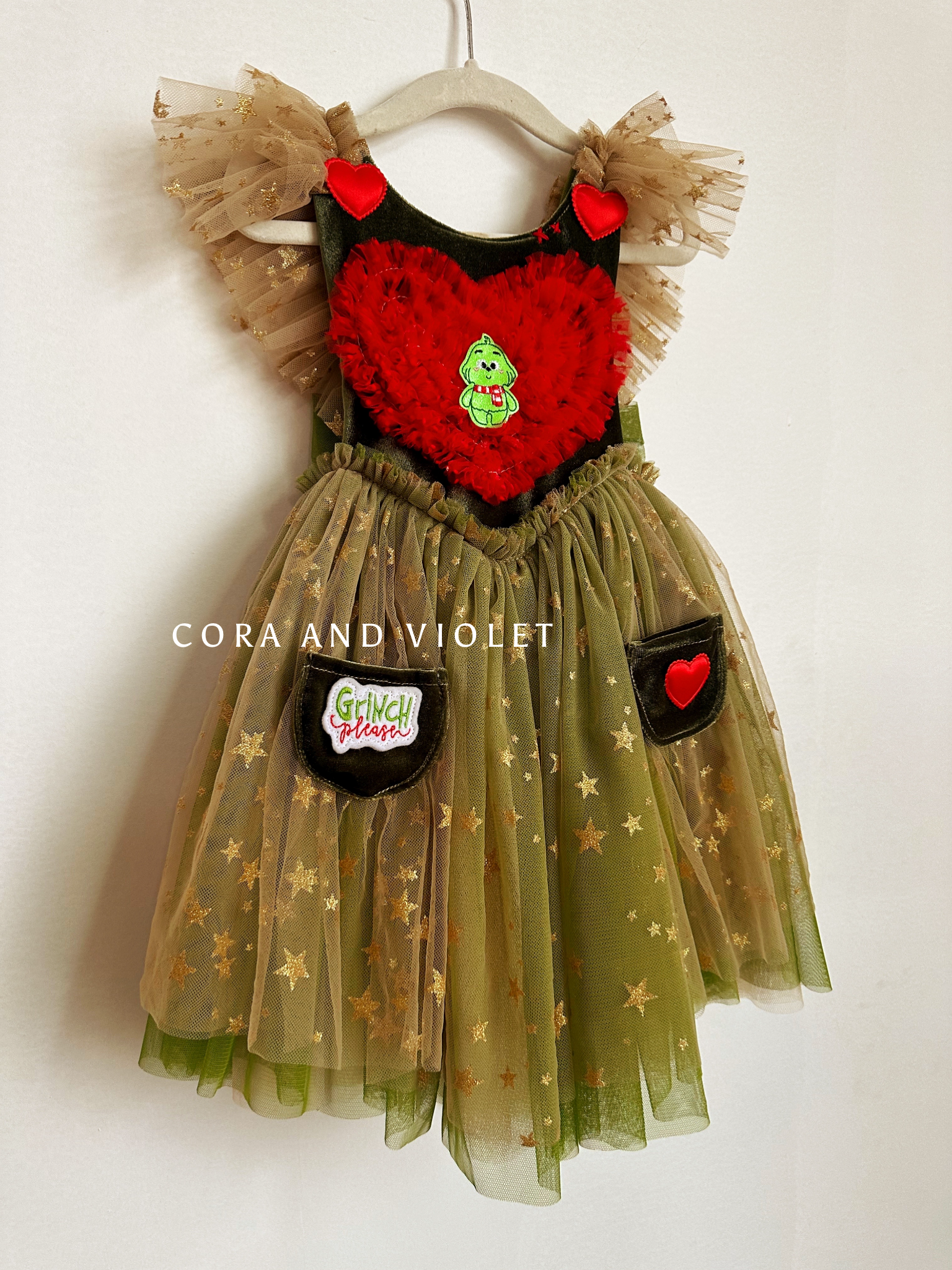 ****Can be bought with Grinch embellishments or left green and gold. if you choose no grinch embellishments you will not have: patches on the pockets, red heart capped sleeves, and a plain green velvet bib. embellishments do not come separately or removable.