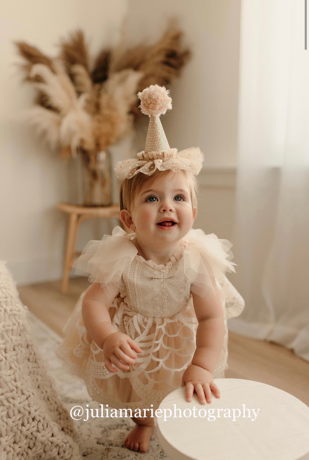 Two layers of tulle ruffled for a sweet flair, soft fit! hand-stitched pom, made from a handspun yarn and glitter.