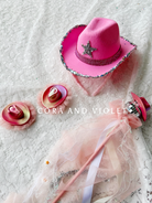 Sold in a set of two- holographic pink cowgirl hat atop a soft bed of pink tulle and a satin-lined alligator clip.