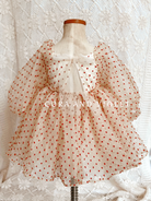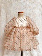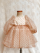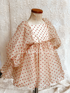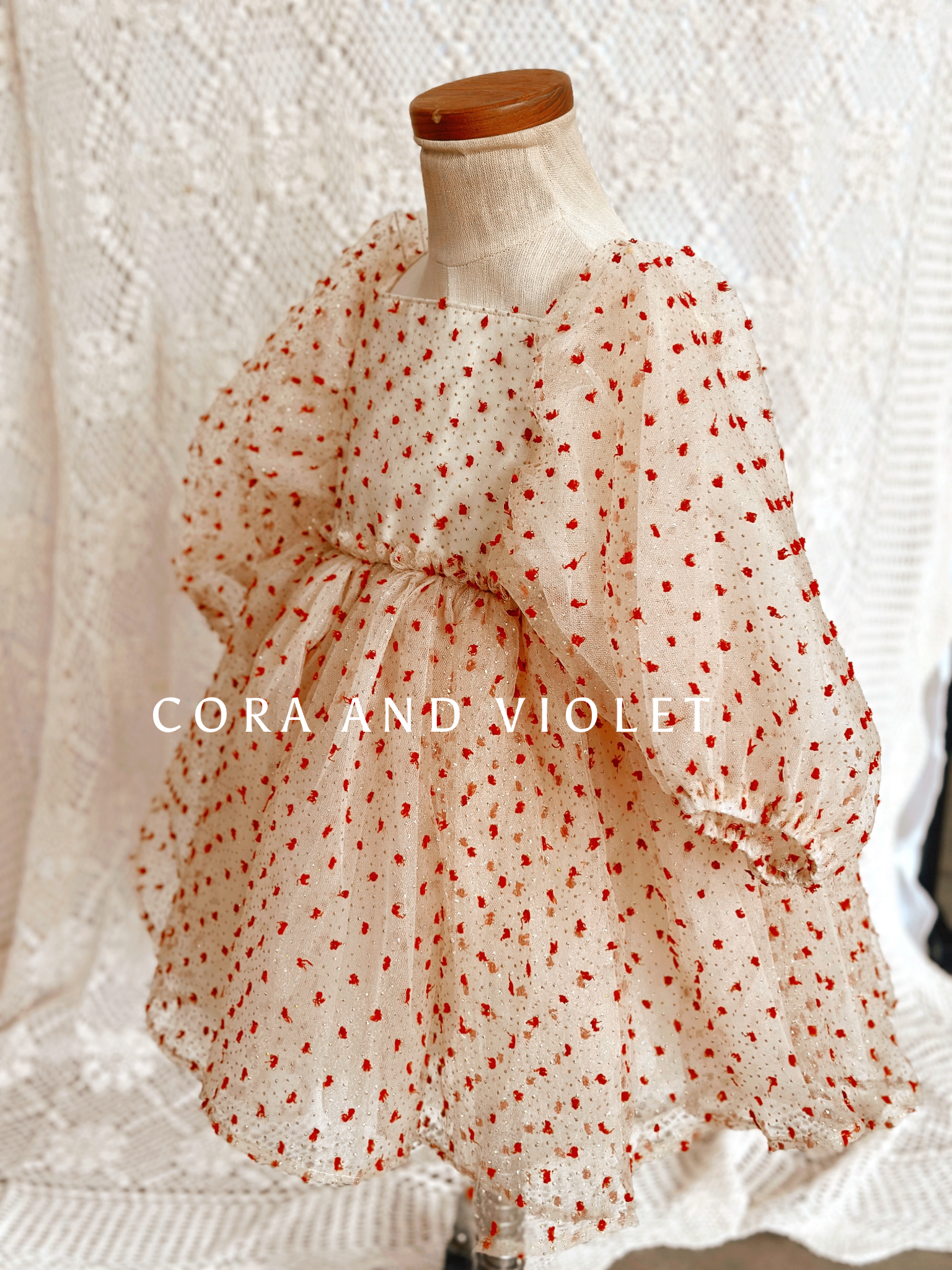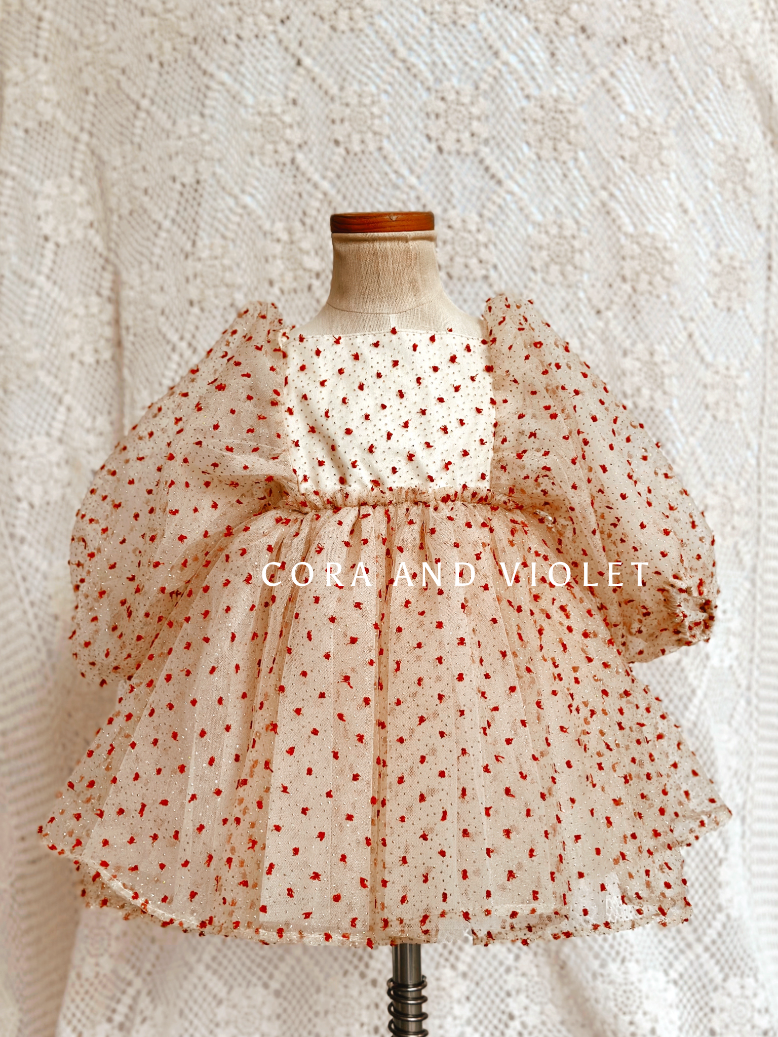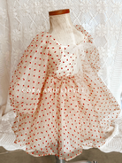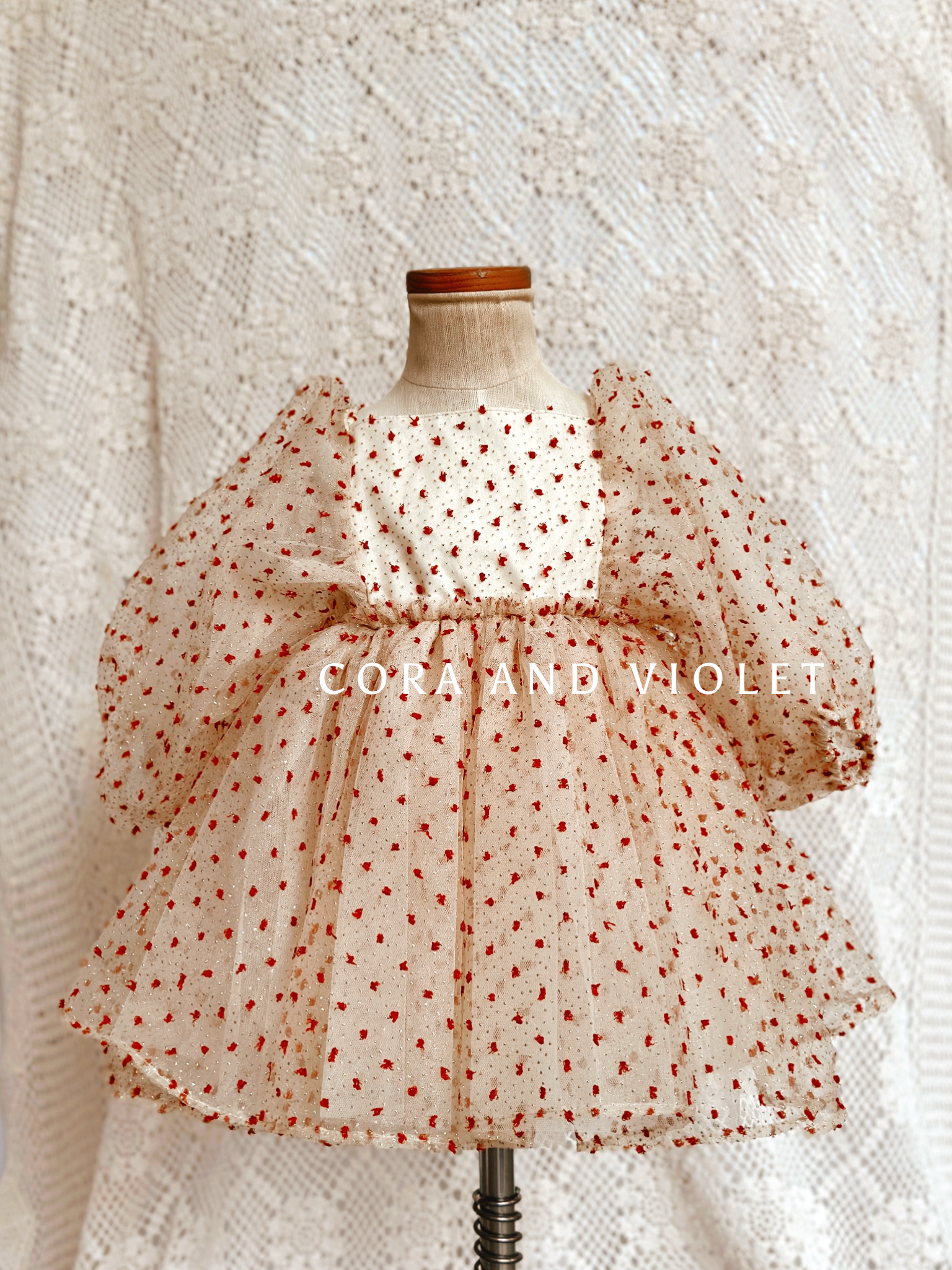 Embroidered red dots and gold flecked chiffon for this darling dress