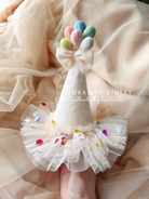 Three layers of tulle & lace ruffled for a sweet flair, soft fit! hand-stitched pom, made from a few dozen layers of tulle.