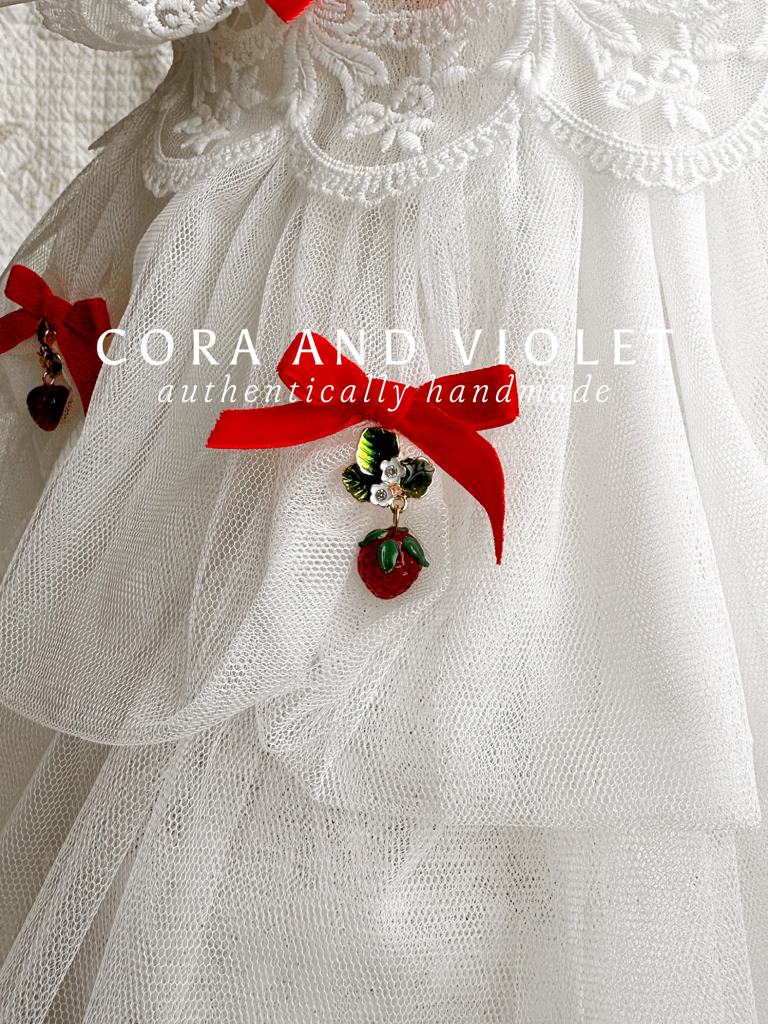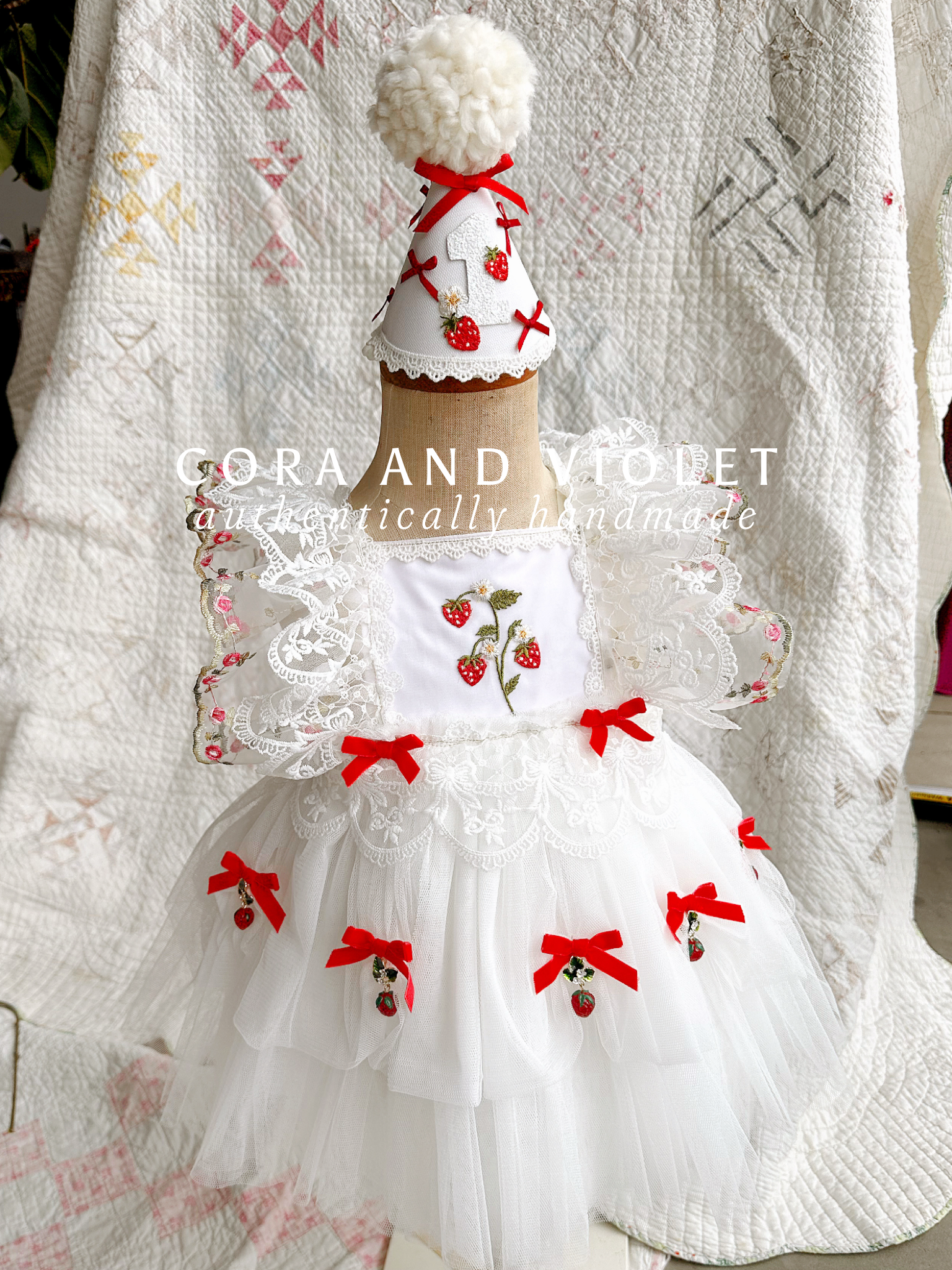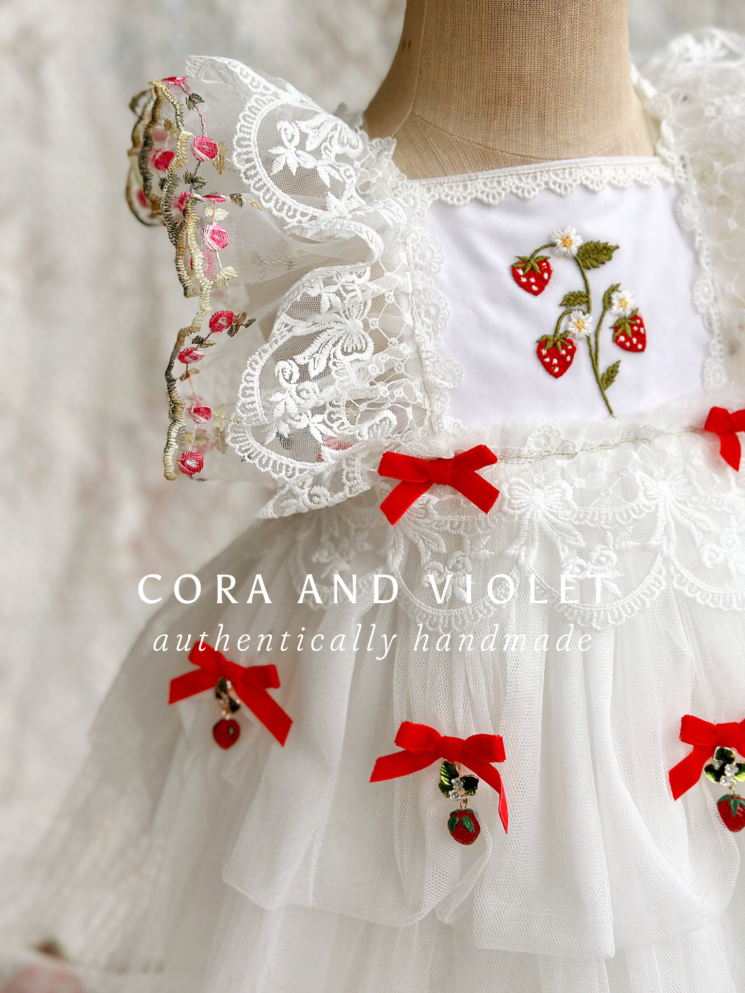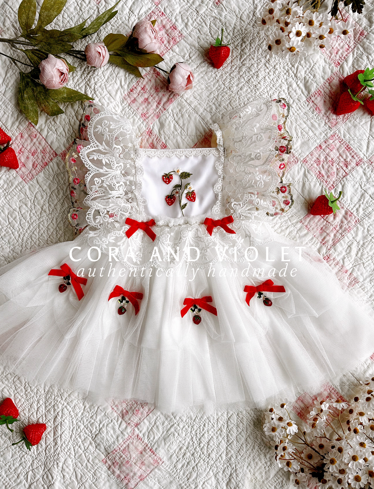 embroidered strawberries and daises, hand tied bows and beautiful display of berries, ripe from the vine!