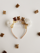 size is a standard OS headband the poms are approx. 2.5-3” inches