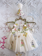 flowers may vary by placement. Each embroidered flower is individually cut, edges are reinforced and a blend of stitching and specialty adhesive is applied to the delicate flowers for this one of a kind look. These are a dimensional flower, some leaves and flowers are intended to have a 3D effect. This outfit is a labor of labor, each piece has several hours poured into it.