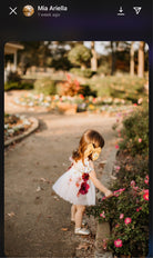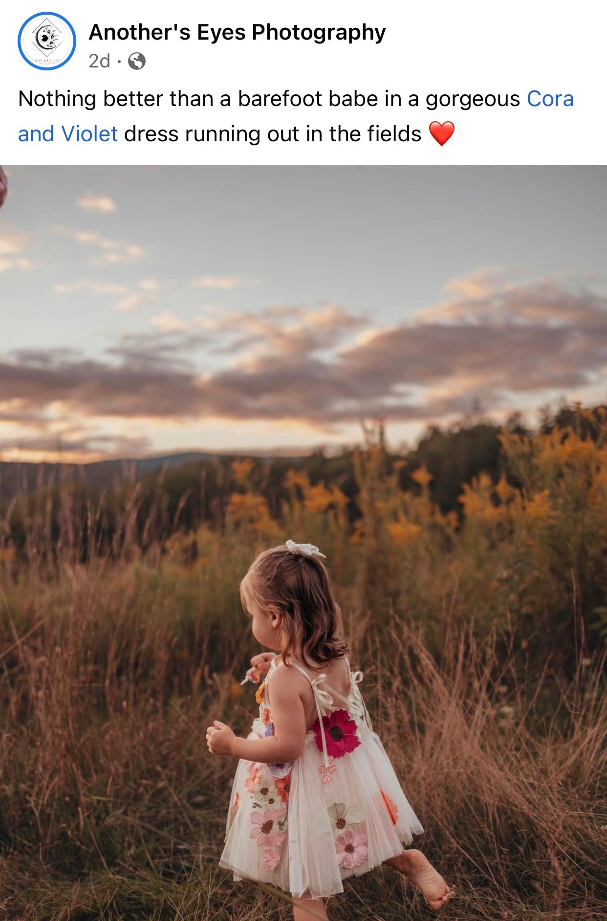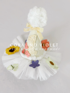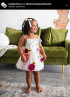 Say hello to this magical delight of embroidered 3d flowers atop layered and ruched creamy tulle. flirting under a delightful bed of daisies with our layers of tulle skirt and a Swiss dot bodice.