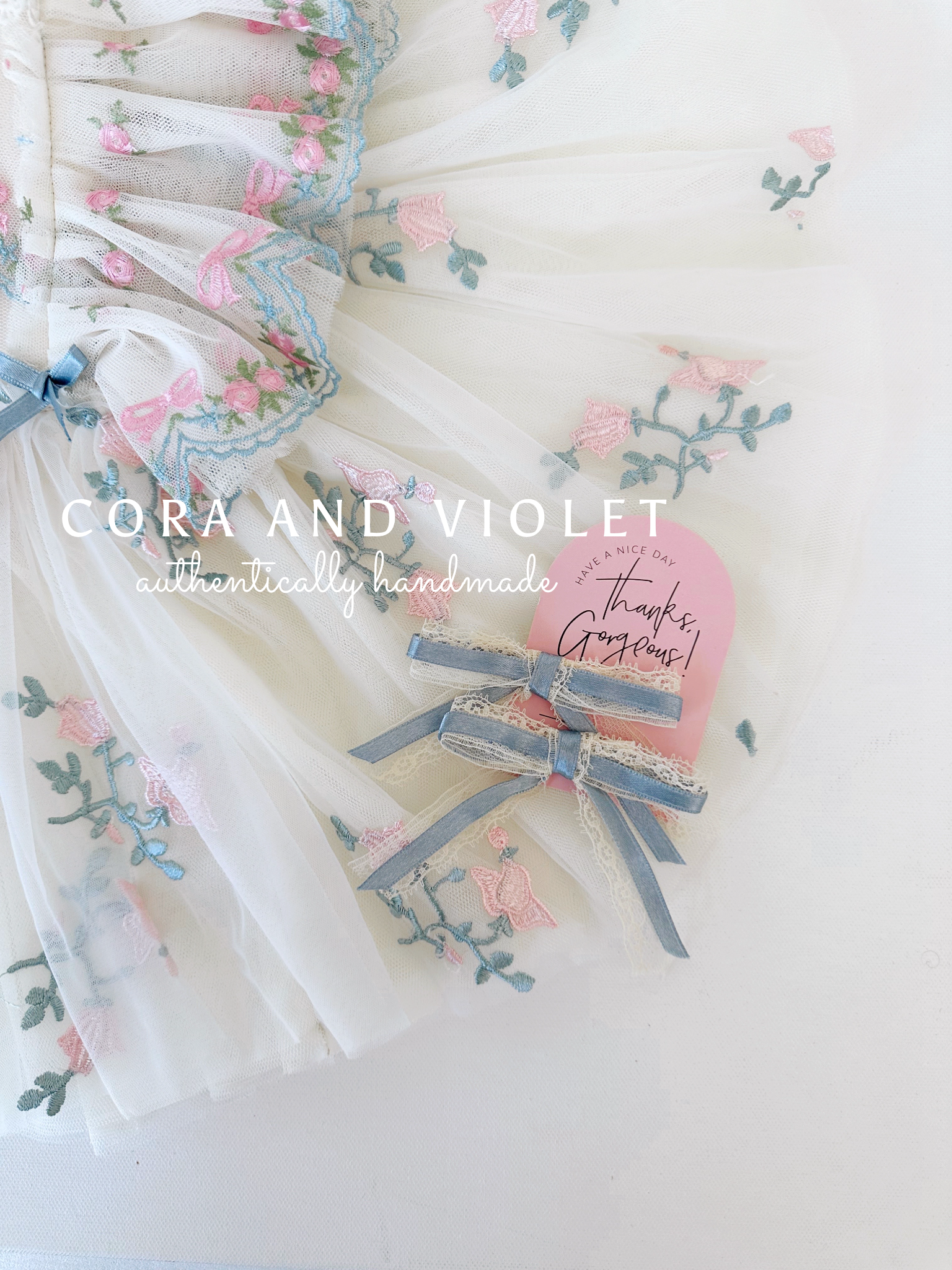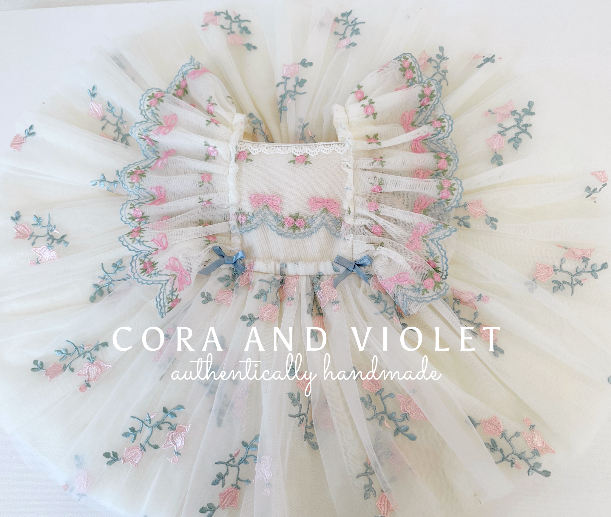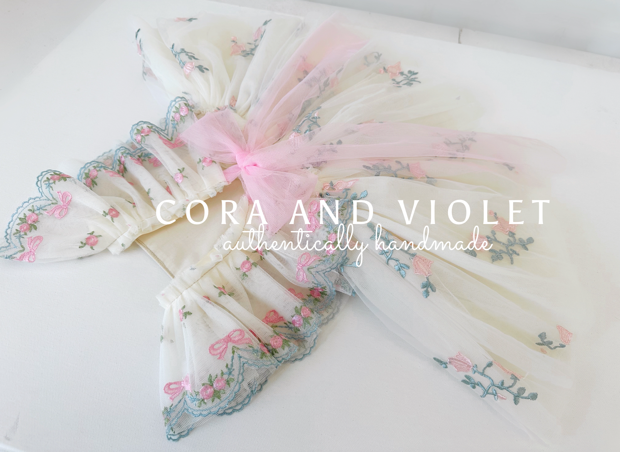 Handcrafted for Memories: Cora and Violet creations are artisan-made photography props and milestone garments designed for supervised use. Because each piece is a bespoke work of art—often incorporating vintage textiles, delicate laces, and hand-applied adornments—they are not intended for sleepwear or unsupervised play.
