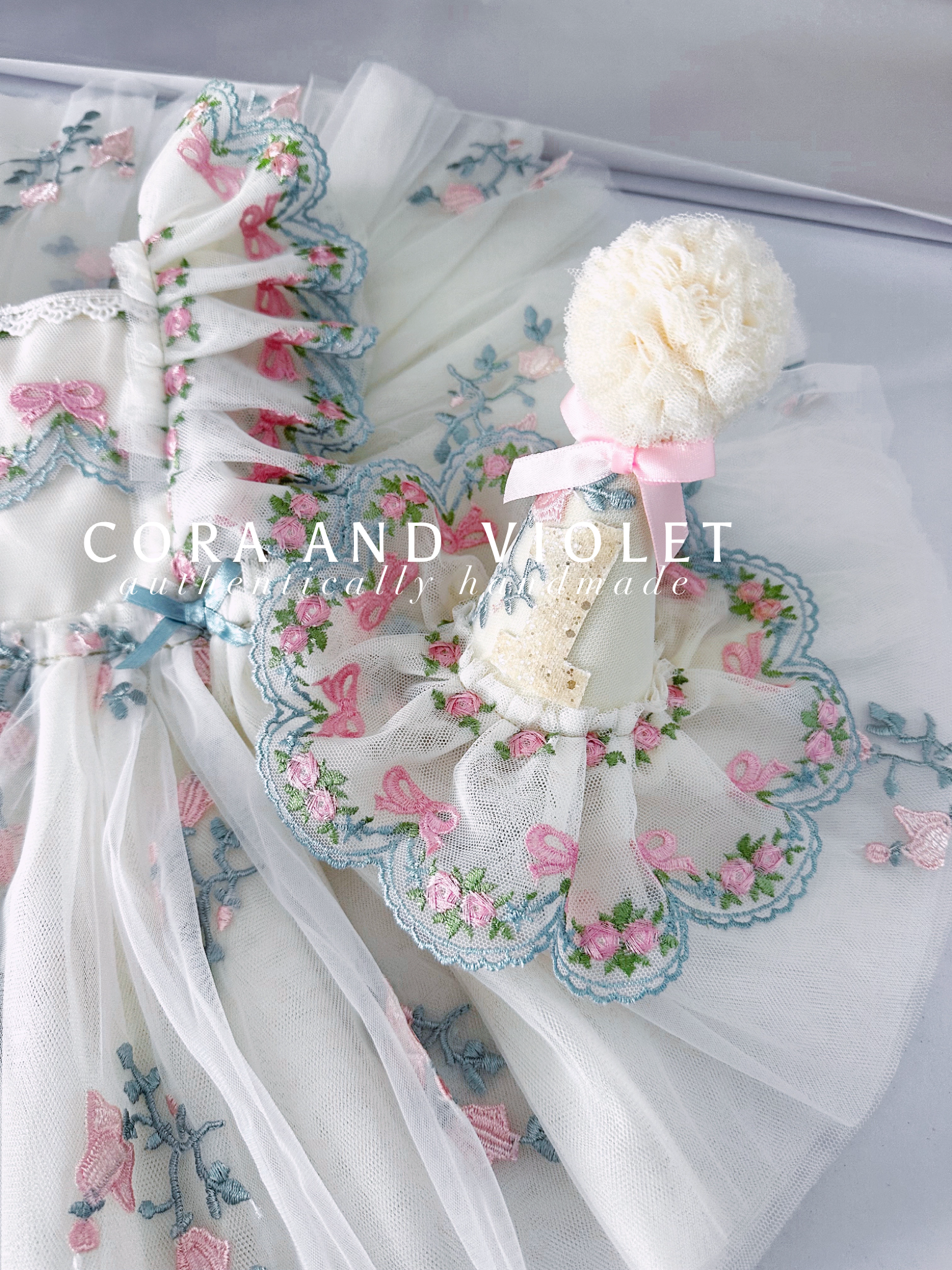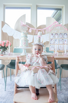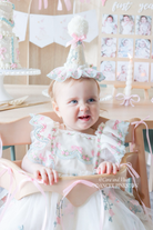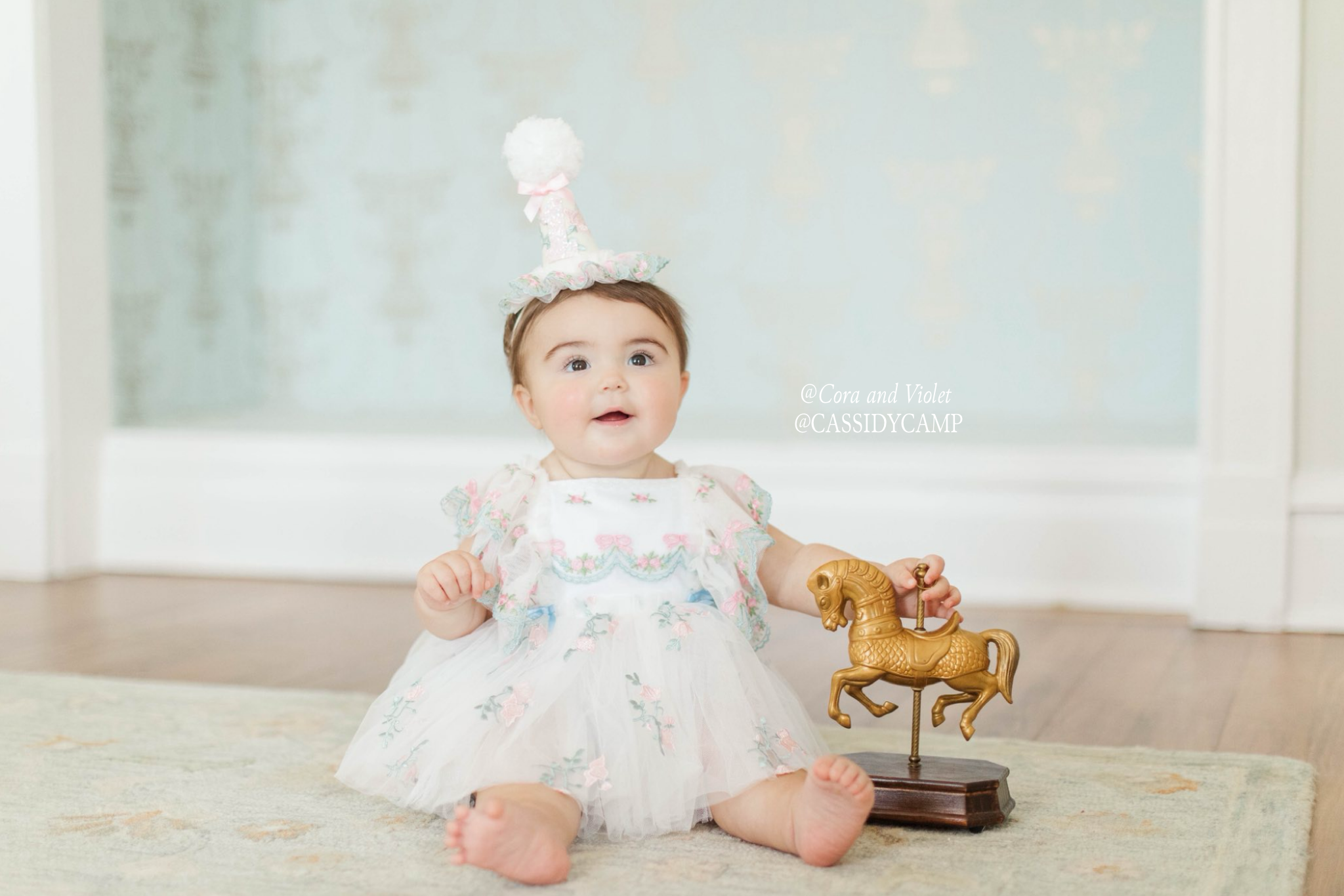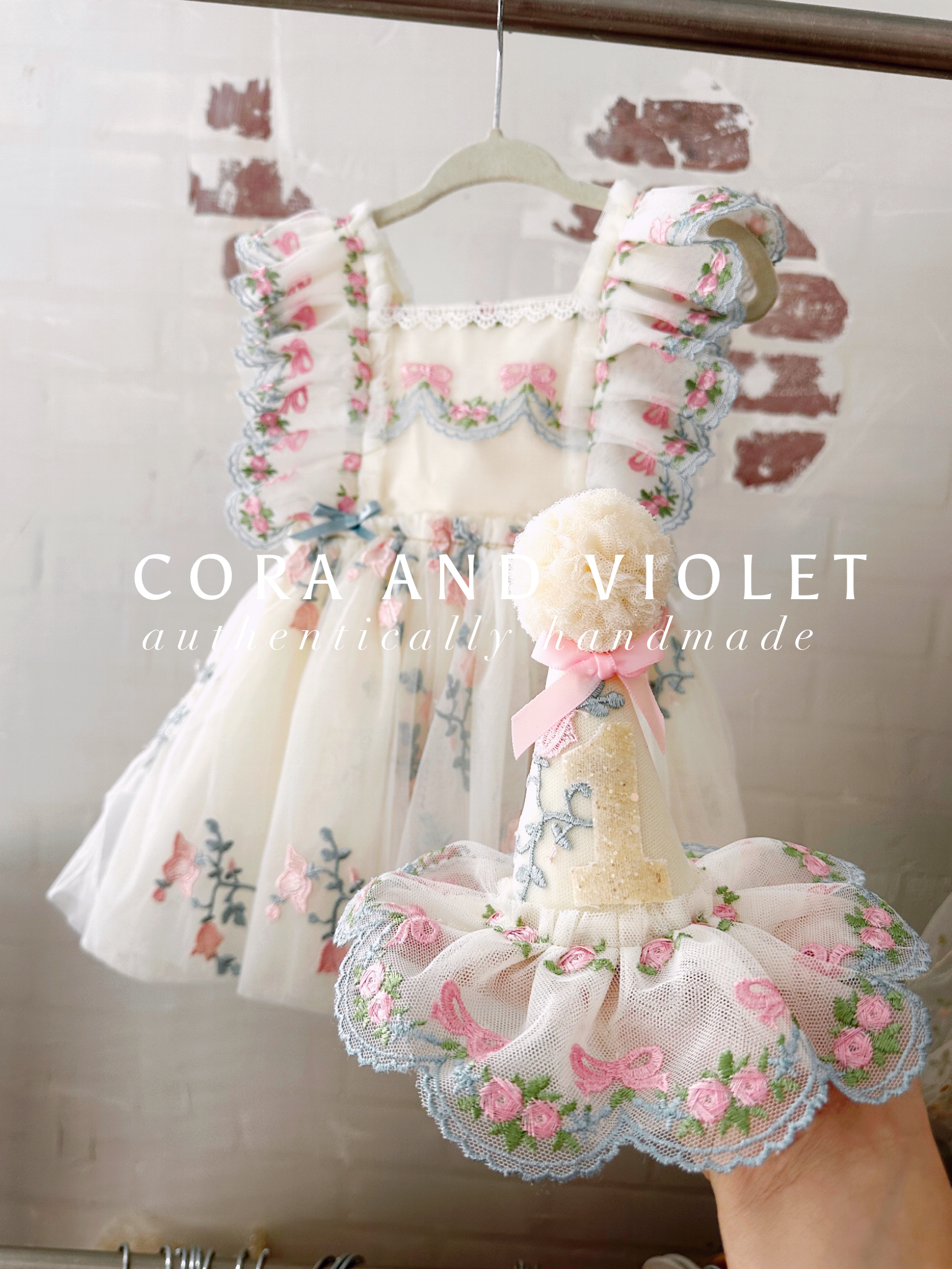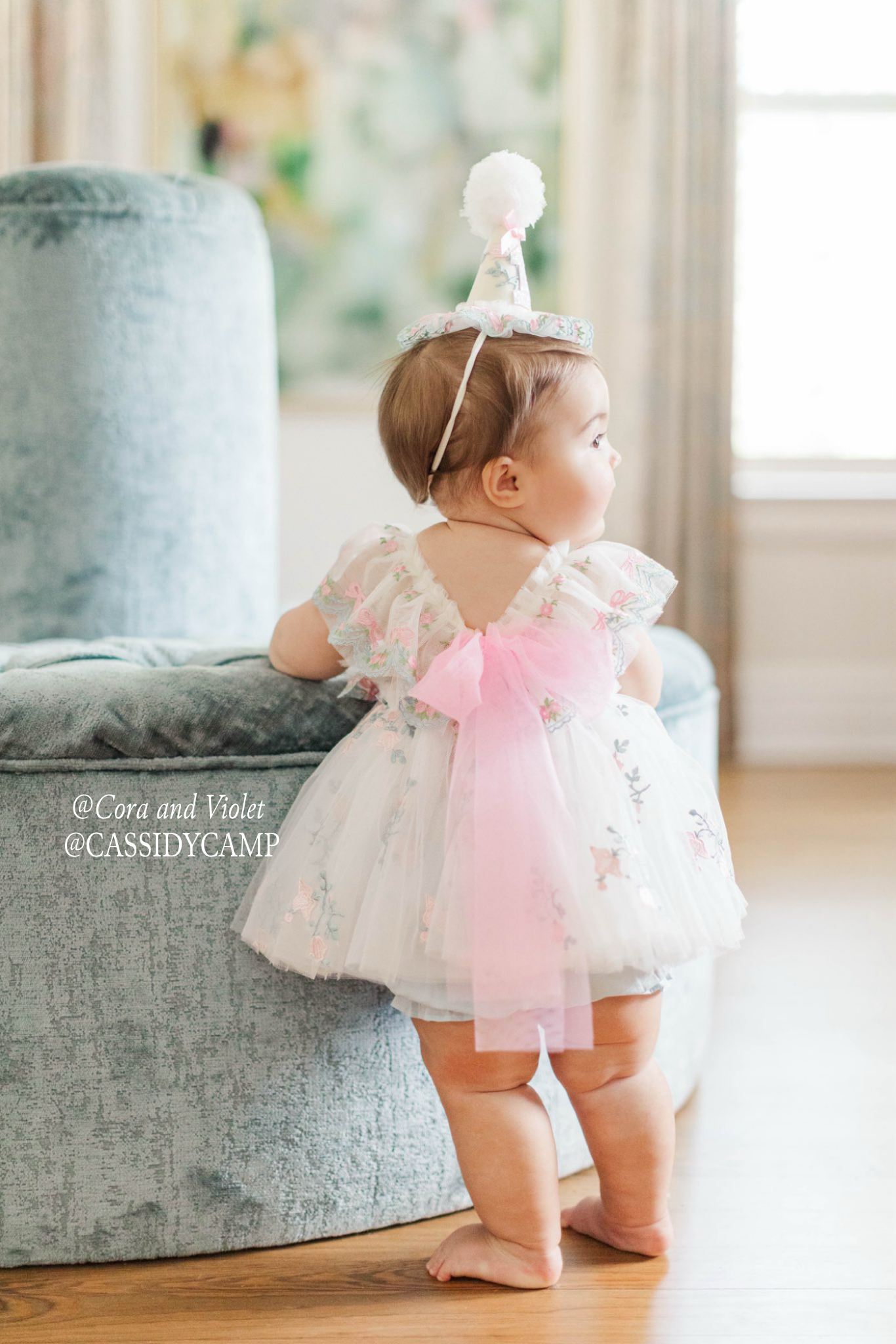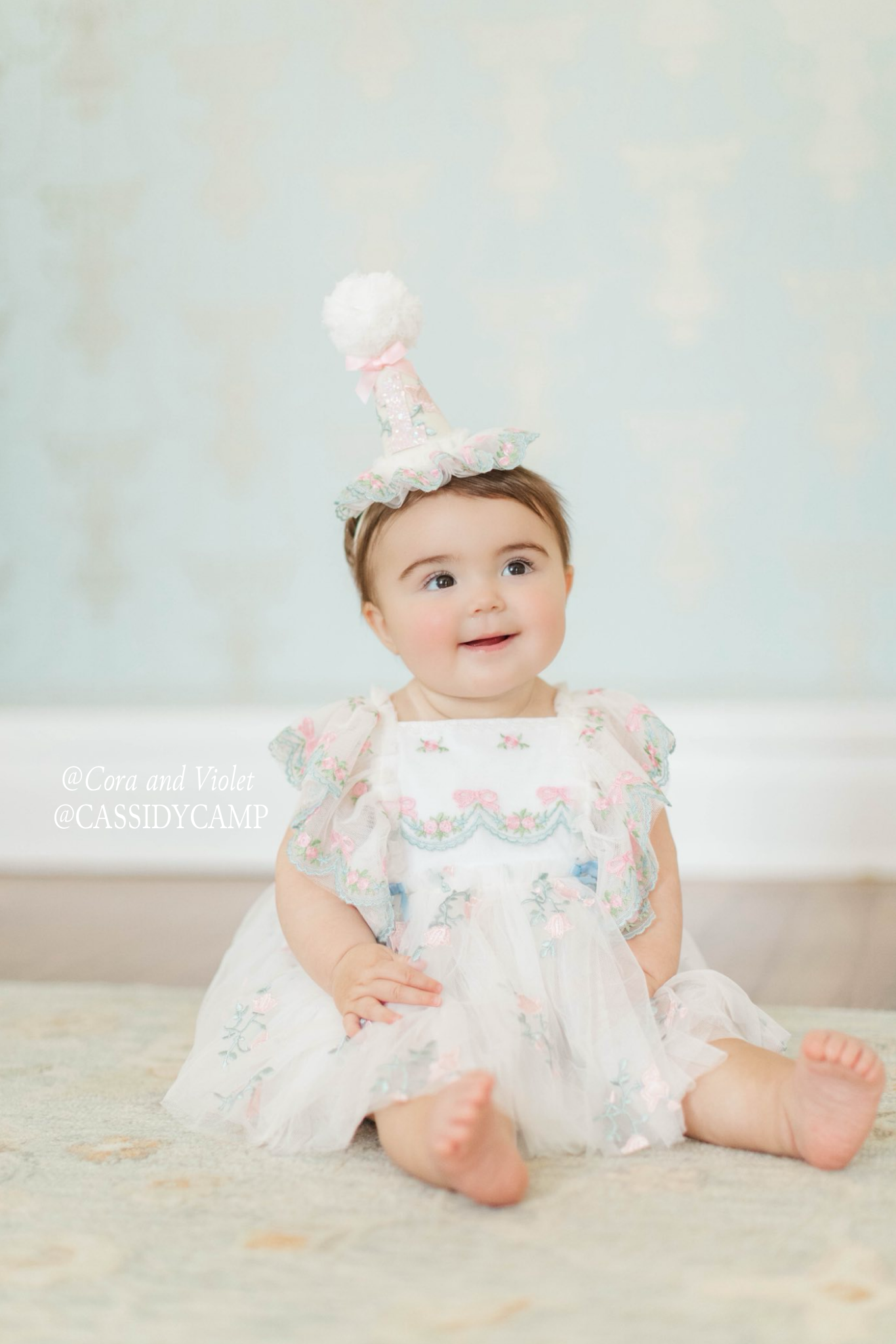 ✨ The Complete Milestone Look: Elevate her celebration by adding the Coordinating Milestone Hat. Hand-crafted with matching lace and the option for a custom milestone number, it’s the perfect companion for a first birthday or tea party.